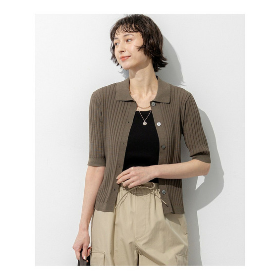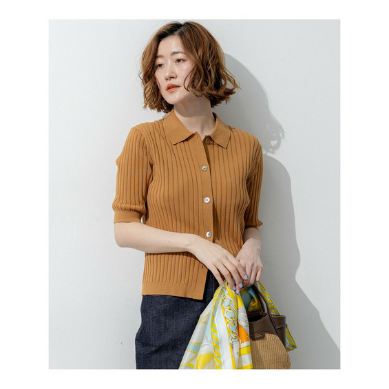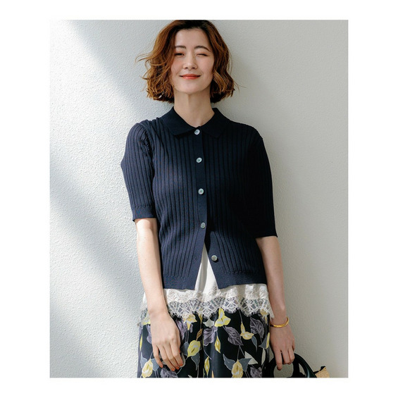 ワイドリブをベースに丁寧に編み立てた、五分袖のポロニットカーディガンです。程よいルーズフィットなサイジングにより、体のラインを拾いすぎず、すっきりと着こなせるのが魅力です。ボタンを留めて一枚着としてプルオーバー風に着るのはもちろん、季節の変わり目の羽織りとしても活躍します。スカートを合わせればレディライクに、マニッシュなパンツを合わせればシックで洗練された印象にと、合わせるボトムス次第で幅広いコーディネートを楽しめます。カラーは、ニュアンス感のあるシックなブラウン(#030)、上品で柔らかな印象のキャメル(#034)、知的で着回しの効くネイビー(#075)の3色展開です。
