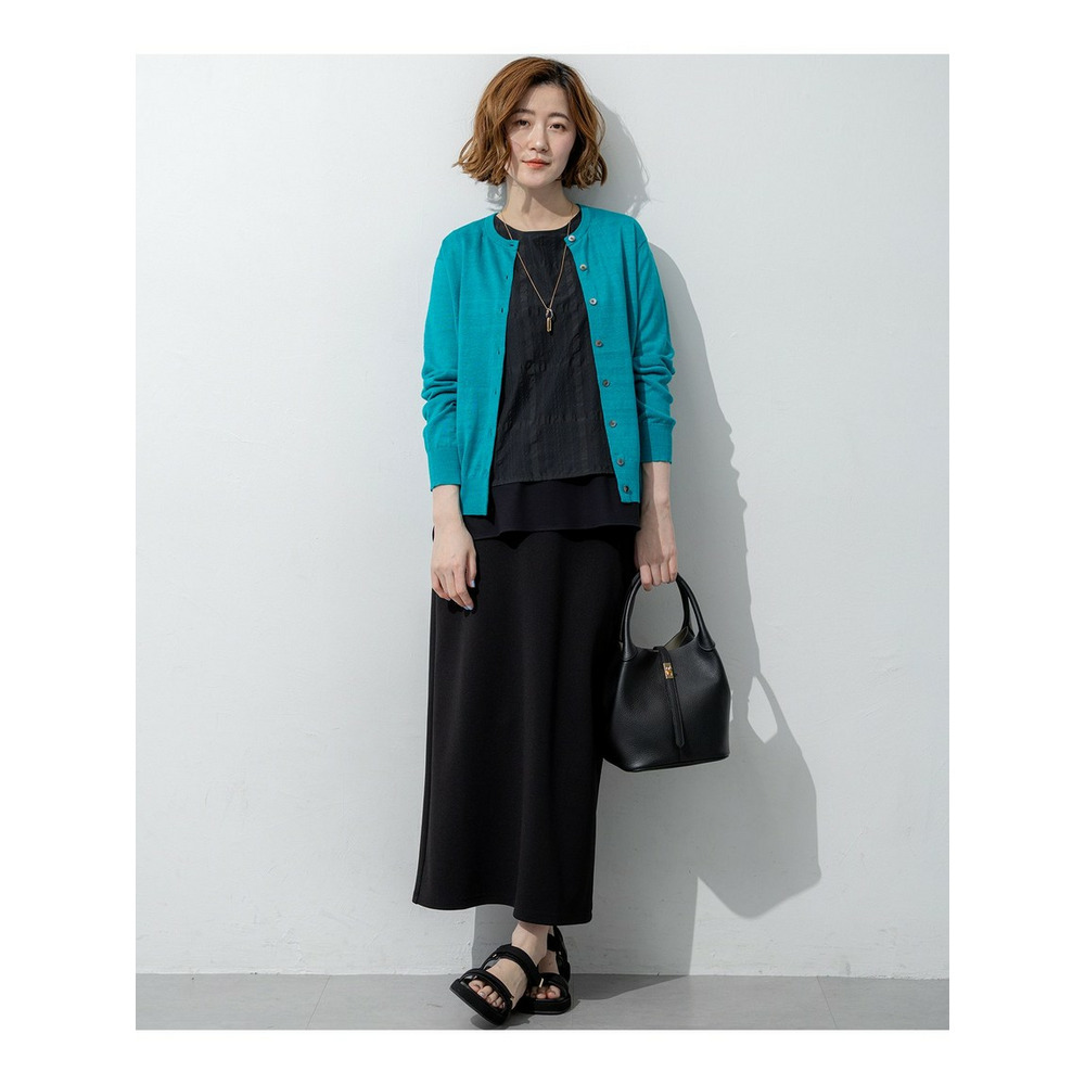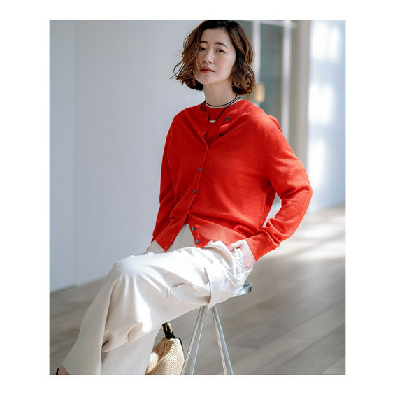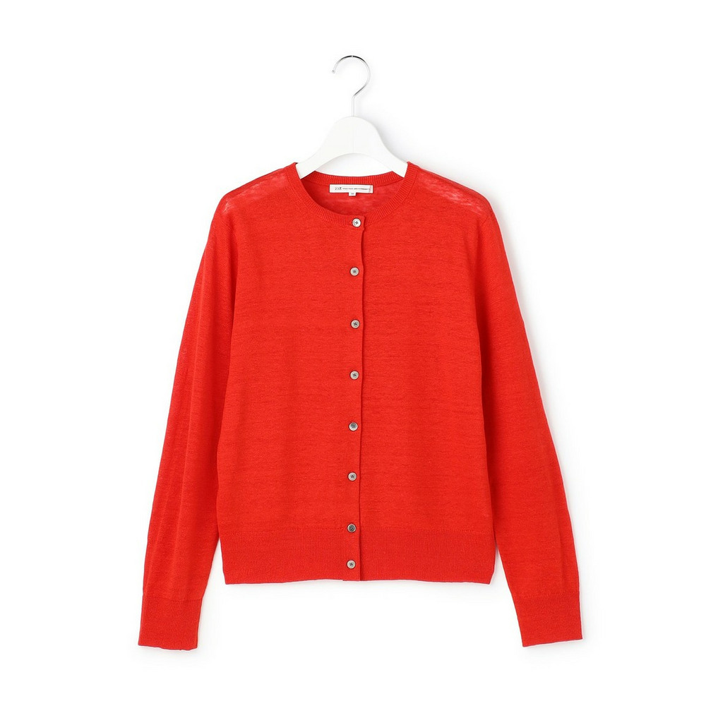 上質なリネン100%の素材感が際立つ、シンプルながらも洗練されたクルーネックカーディガンです。フロントにあしらわれた本貝ボタンが、さりげなく上品な輝きを添えています。 カーディガンとして軽く羽織り、コーディネートのアクセントカラーとして楽しむのはもちろん、ボタンを全て留めてプルオーバーのように着こなせば、クラシカルで品のあるスタイルが完成します。ワンピースにさらりと合わせたり、きれいめなパンツスタイルでオフィスシーンに活用したりと、オンオフ問わず幅広いシーンで活躍する一枚です。 カラーは、鮮やかな色味が目を惹くレッド(#010)、麻本来のナチュラルな風合いを楽しめるベージュ(#033)、爽やかな印象を与えるグリーン(#060)、シックで知的な大人ネイビー(#075)の4色展開です。