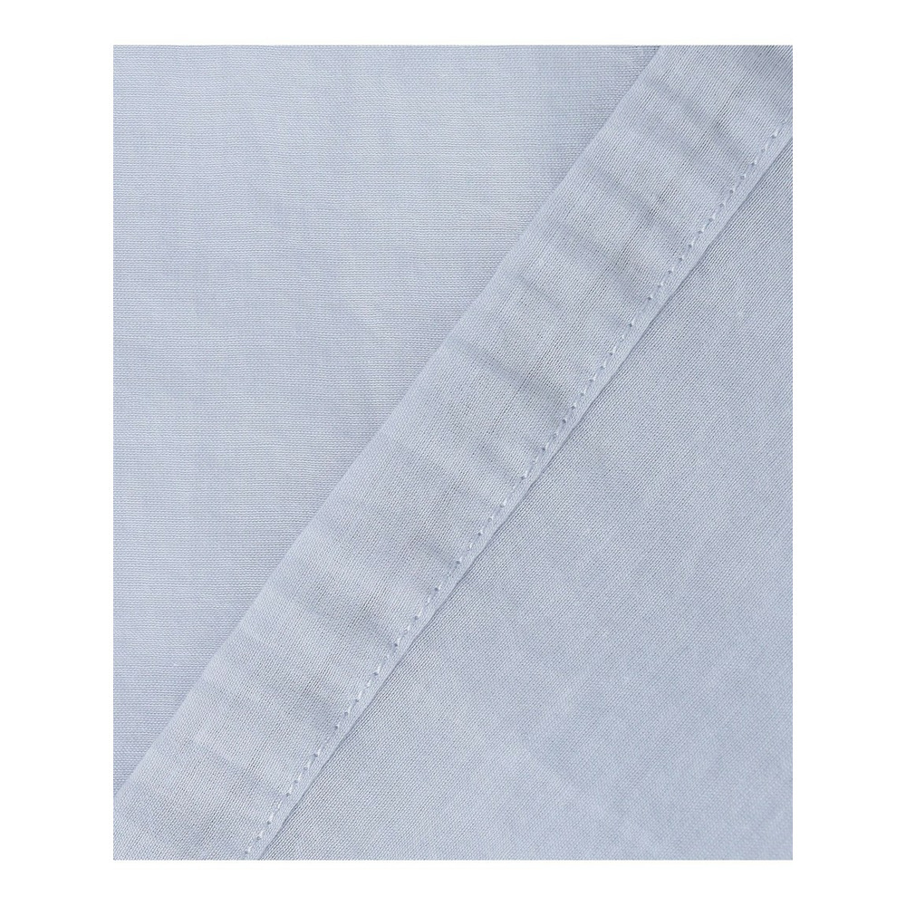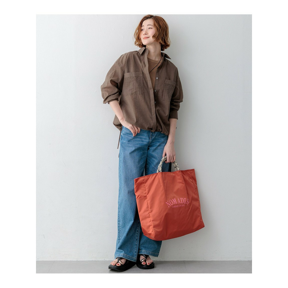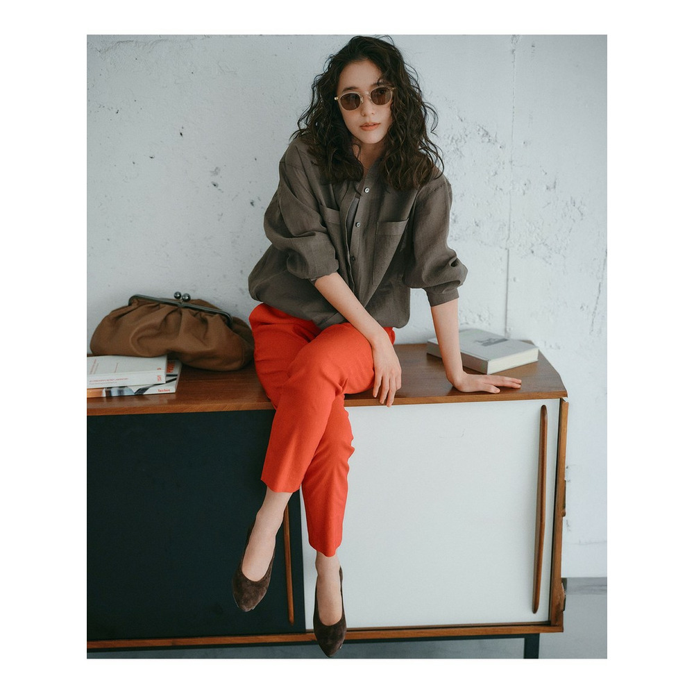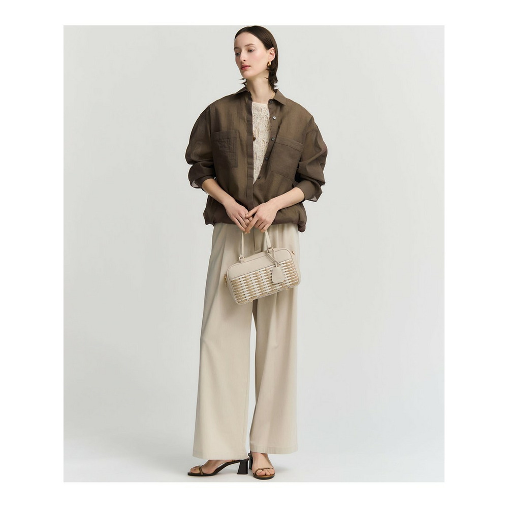 縦糸にナイロン、横糸に極細のコットン糸を使用した、非常に軽く涼しげな素材です。薄手でありながらも適度な張り感があり、ペラペラせず美しいフォルムを保ちます。ナイロン特有のほのかな光沢感が上品さを演出しつつ、ワッシャー加工による自然なシワ感が加わることで、気負わないカジュアルな表情も併せ持っています。シアーな質感が肌離れよく、暑い時期でも快適な着心地です。