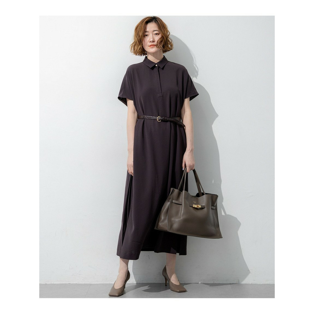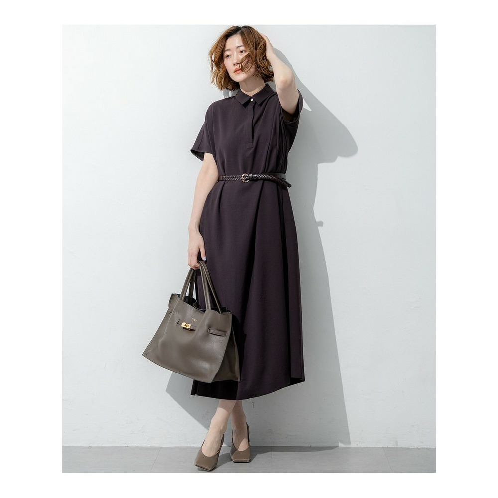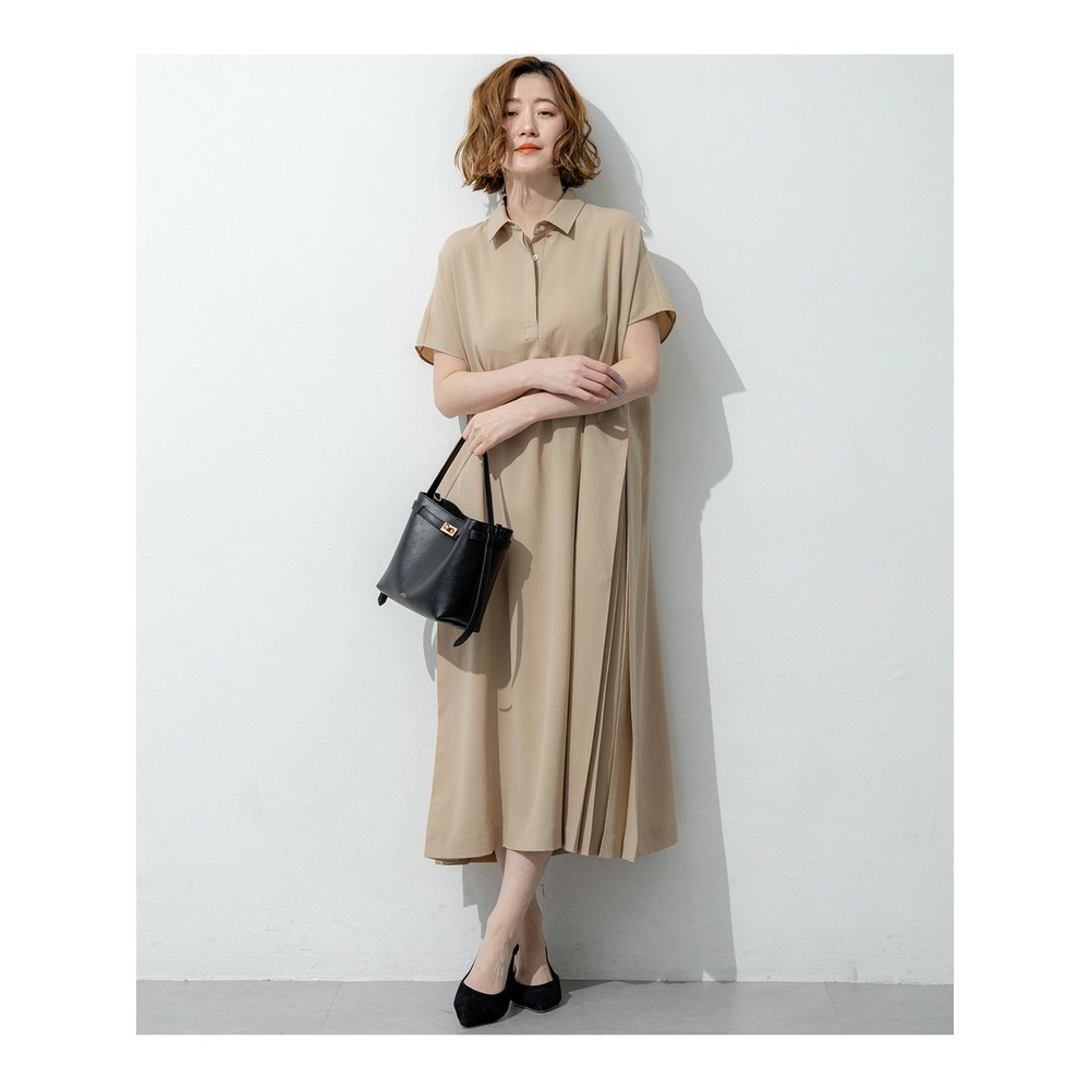 フロントはすっきりとしたシンプルなストレートシルエットでありながら、サイドに施された深めのタックディテールが目を惹くワンピースです。動くたびにサイドのタックが揺れ、一枚でさらりと着るだけで華やかで洗練されたスタイリングが決まります。きちんと感のある襟付きデザインのため、通勤などのオンタイムから、休日のお出かけやちょっとしたお食事会まで幅広いシーンで活躍します。カーディガンやジャケットを羽織ってもすっきりとまとまり、合わせるバッグやシューズ次第で様々な表情をお楽しみいただけます。カラーは、肌なじみが良くやわらかな印象のベージュ系(#033)、落ち着いた大人の雰囲気を醸し出すダークブラウン系(#035)、知的で上品なネイビー系(#075)の3色展開です。