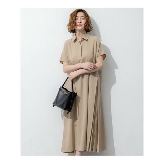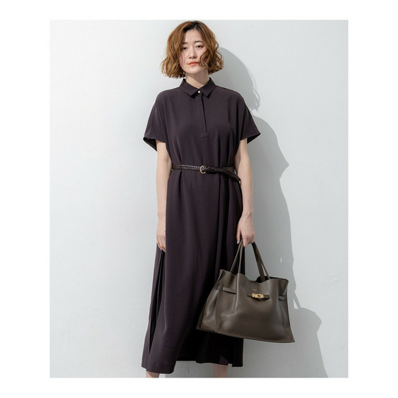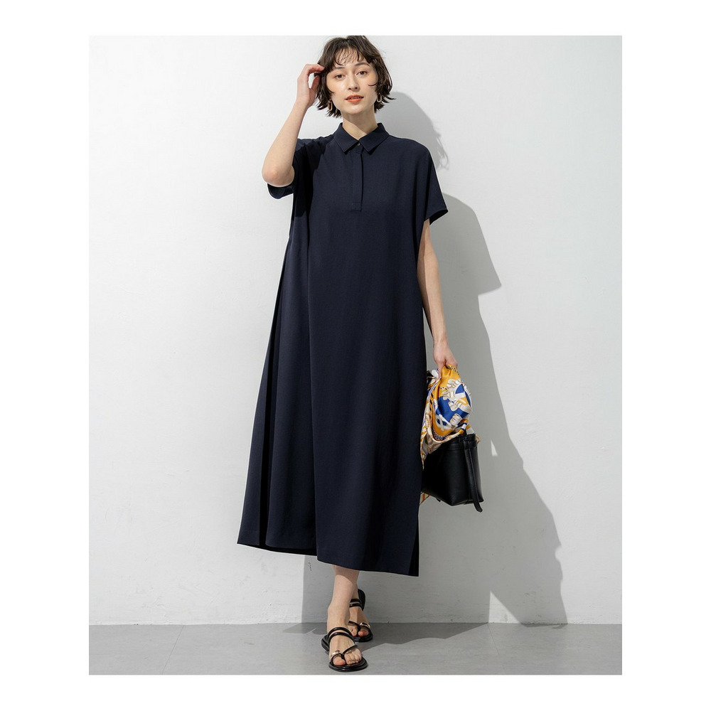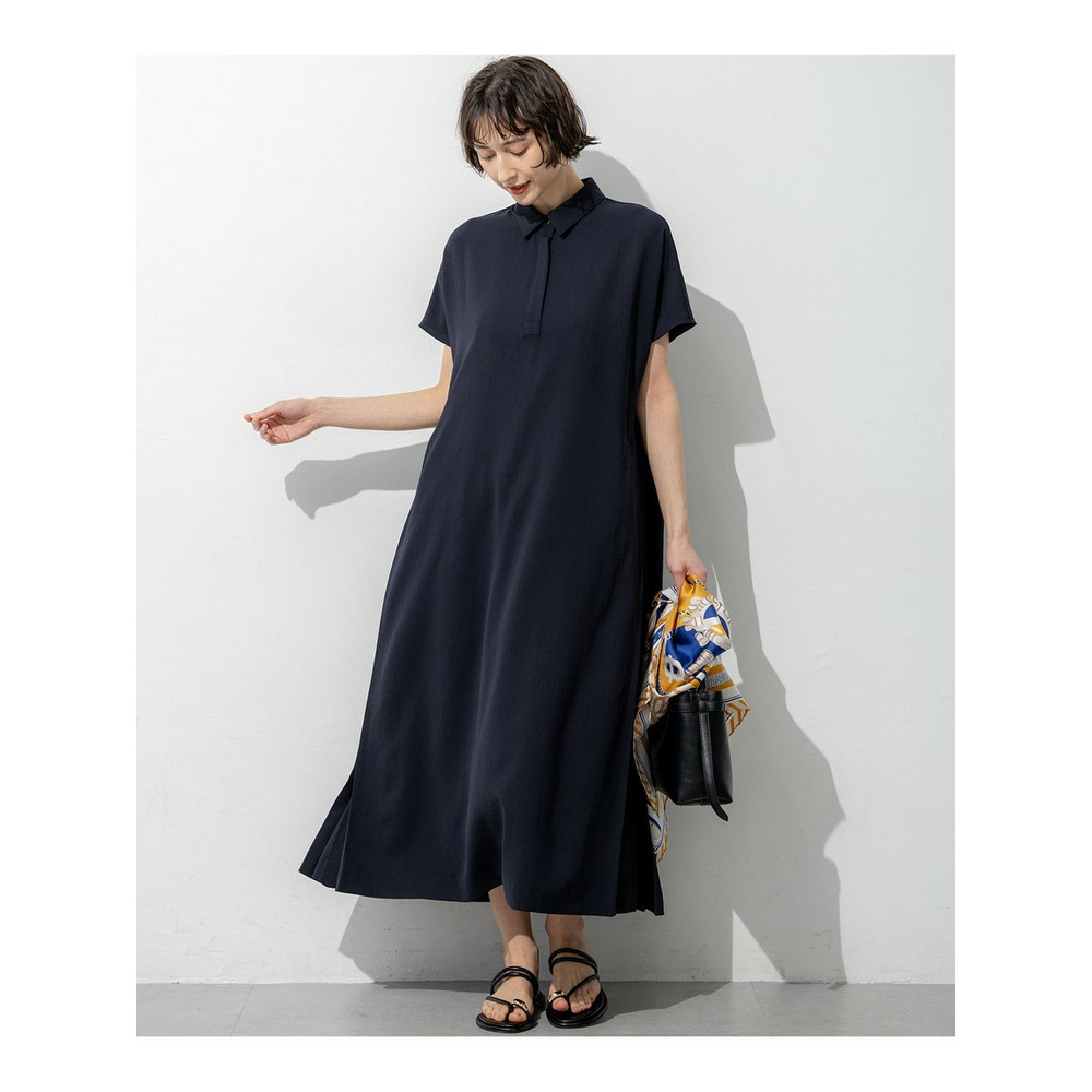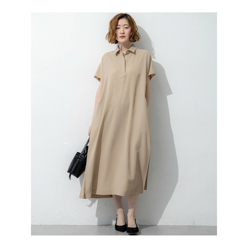 フロントはすっきりとしたシンプルなストレートシルエットでありながら、サイドに施された深めのタックディテールが目を惹くワンピースです。動くたびにサイドのタックが揺れ、一枚でさらりと着るだけで華やかで洗練されたスタイリングが決まります。きちんと感のある襟付きデザインのため、通勤などのオンタイムから、休日のお出かけやちょっとしたお食事会まで幅広いシーンで活躍します。カーディガンやジャケットを羽織ってもすっきりとまとまり、合わせるバッグやシューズ次第で様々な表情をお楽しみいただけます。カラーは、肌なじみが良くやわらかな印象のベージュ系(#033)、落ち着いた大人の雰囲気を醸し出すダークブラウン系(#035)、知的で上品なネイビー系(#075)の3色展開です。