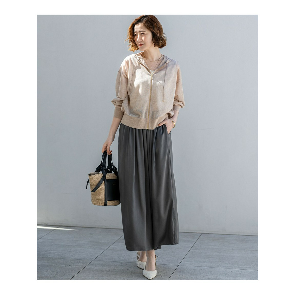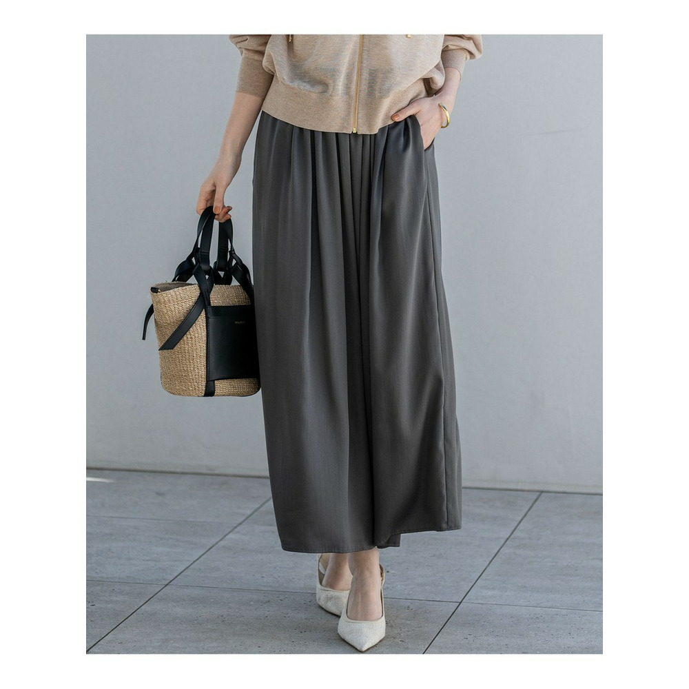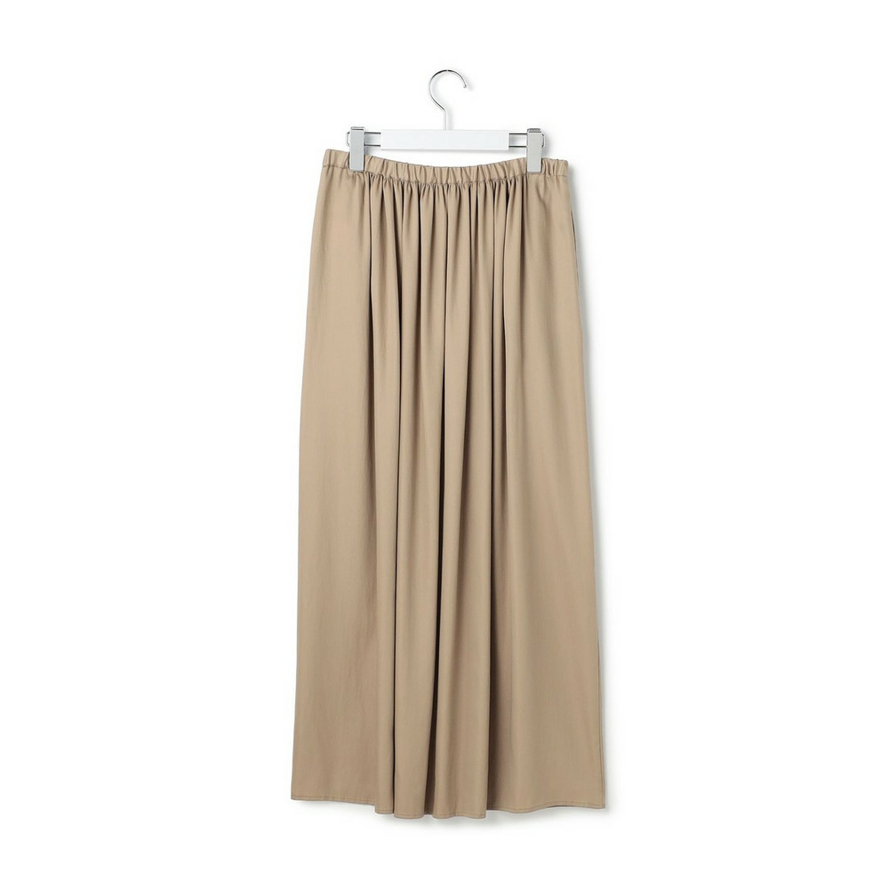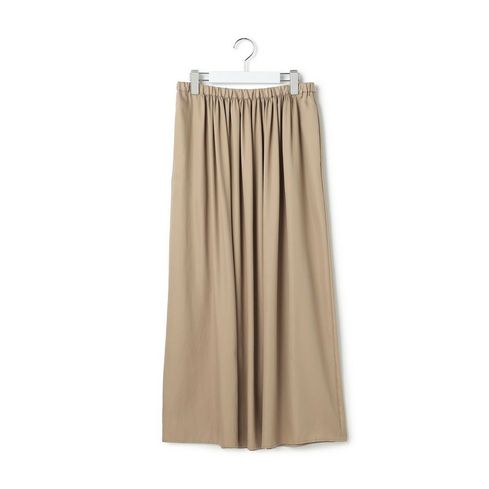 すとんと落ちるようなIラインシルエットが魅力のギャザースカートです。フロント部分にはギャザーを多めに寄せることで立体感を出し、お腹周りのラインを自然にカバー。一方でサイドのギャザー分量は控えめに調整し、横から見た時のシルエットがすっきりと美しくなるよう計算されています。シンプルながらも細部にこだわったデザインは、合わせるトップスを選ばず、デイリーからオフィスシーンまで幅広く活躍します。コンパクトなニットやブラウスをインしたきれいめな着こなしはもちろん、Tシャツと合わせたリラックス感のあるスタイリングもおすすめです。カラーは、ナチュラルで優しい印象のベージュ(#030)と、シックで洗練されたグレー(#004)の2色展開です。