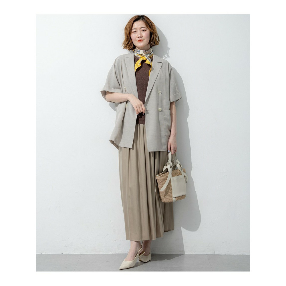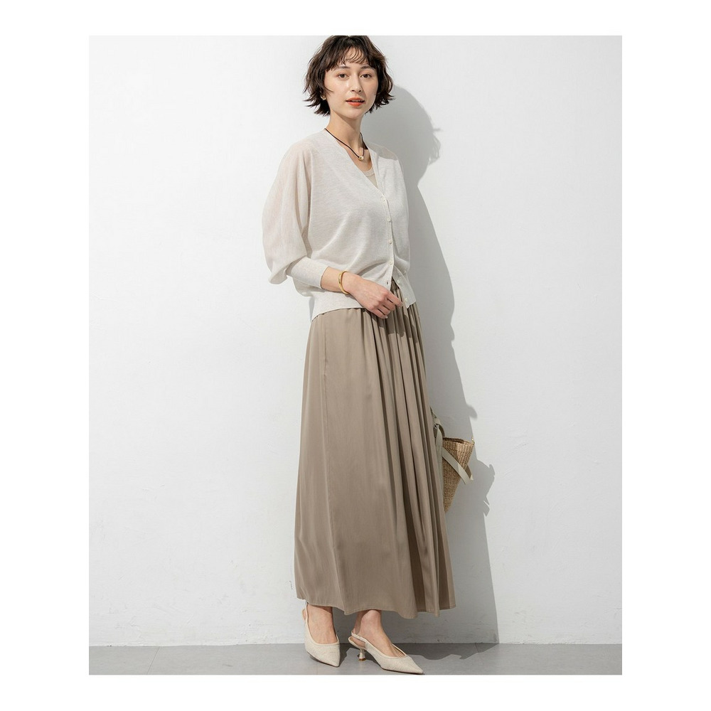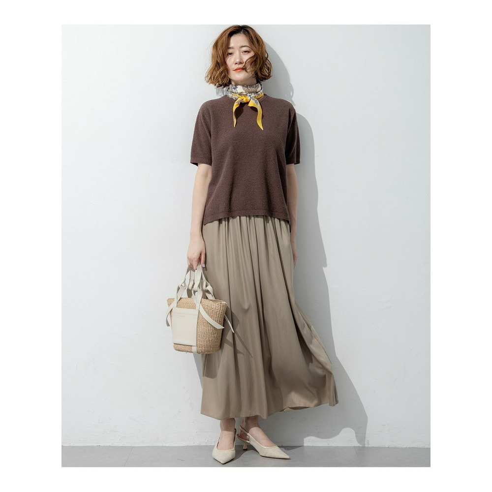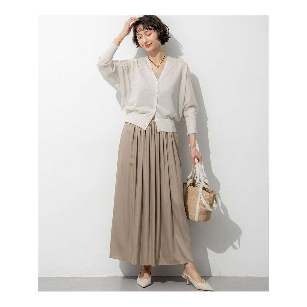すとんと落ちるようなIラインシルエットが魅力のギャザースカートです。フロント部分にはギャザーを多めに寄せることで立体感を出し、お腹周りのラインを自然にカバー。一方でサイドのギャザー分量は控えめに調整し、横から見た時のシルエットがすっきりと美しくなるよう計算されています。シンプルながらも細部にこだわったデザインは、合わせるトップスを選ばず、デイリーからオフィスシーンまで幅広く活躍します。コンパクトなニットやブラウスをインしたきれいめな着こなしはもちろん、Tシャツと合わせたリラックス感のあるスタイリングもおすすめです。カラーは、ナチュラルで優しい印象のベージュ(#030)と、シックで洗練されたグレー(#004)の2色展開です。