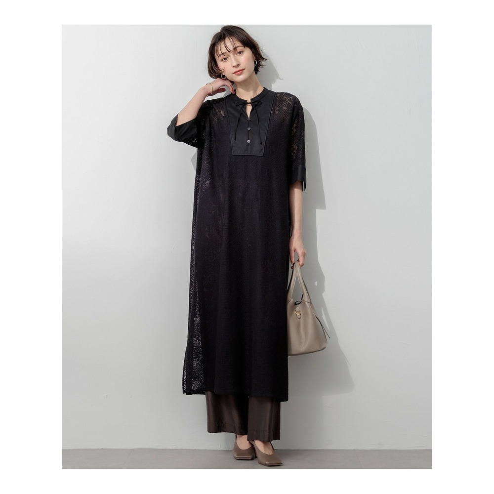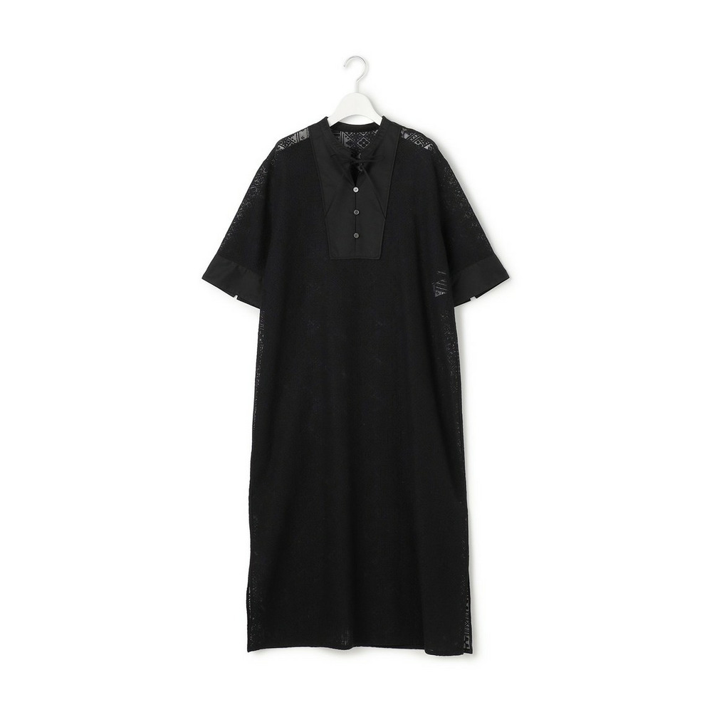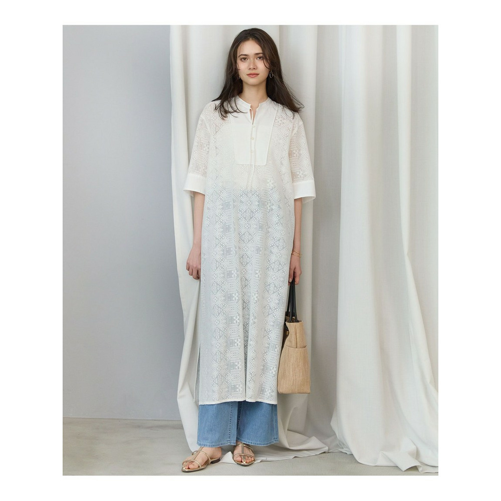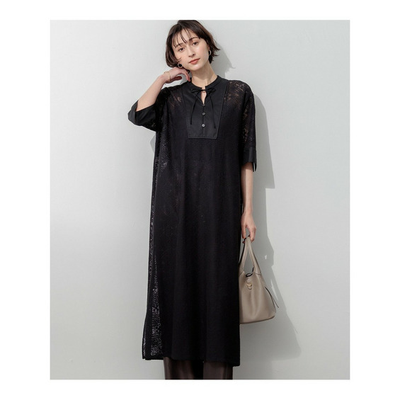 トレンドのレース素材を使用したワンピースです。カジュアルな質感でありながらも、繊細な透け感が大人っぽい雰囲気を演出します。透け感を活かしてデニムパンツなどと合わせたレイヤードスタイルは、今年らしいムードを引き立ててくれます。カラーは、爽やかなオフホワイト(#001)と、シックなブラック(#005)の2色展開です。