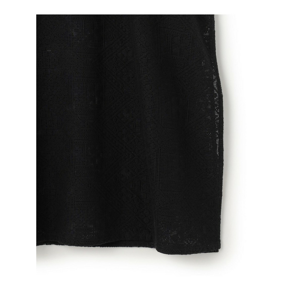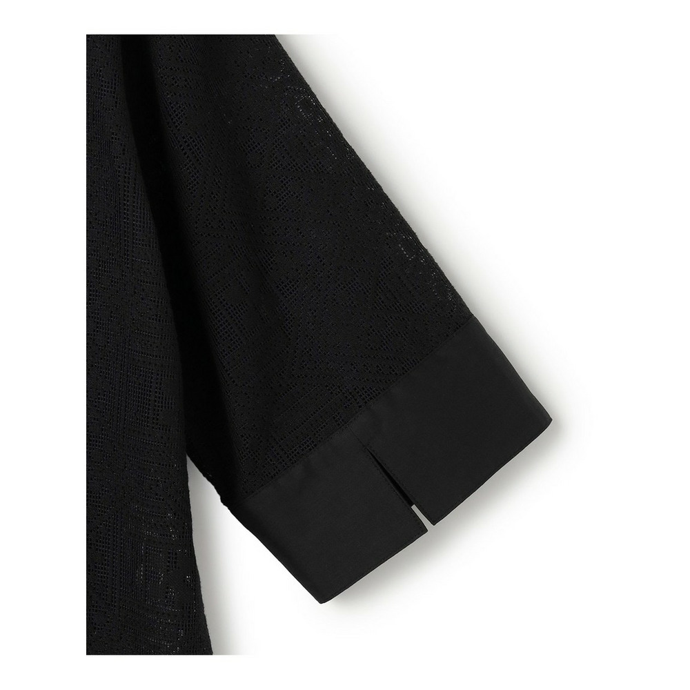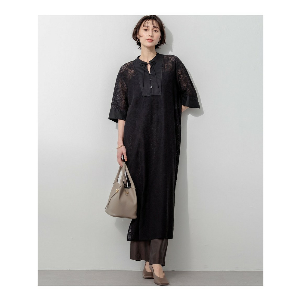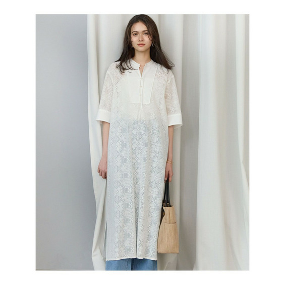 トレンドのレース素材を使用したワンピースです。カジュアルな質感でありながらも、繊細な透け感が大人っぽい雰囲気を演出します。透け感を活かしてデニムパンツなどと合わせたレイヤードスタイルは、今年らしいムードを引き立ててくれます。カラーは、爽やかなオフホワイト(#001)と、シックなブラック(#005)の2色展開です。