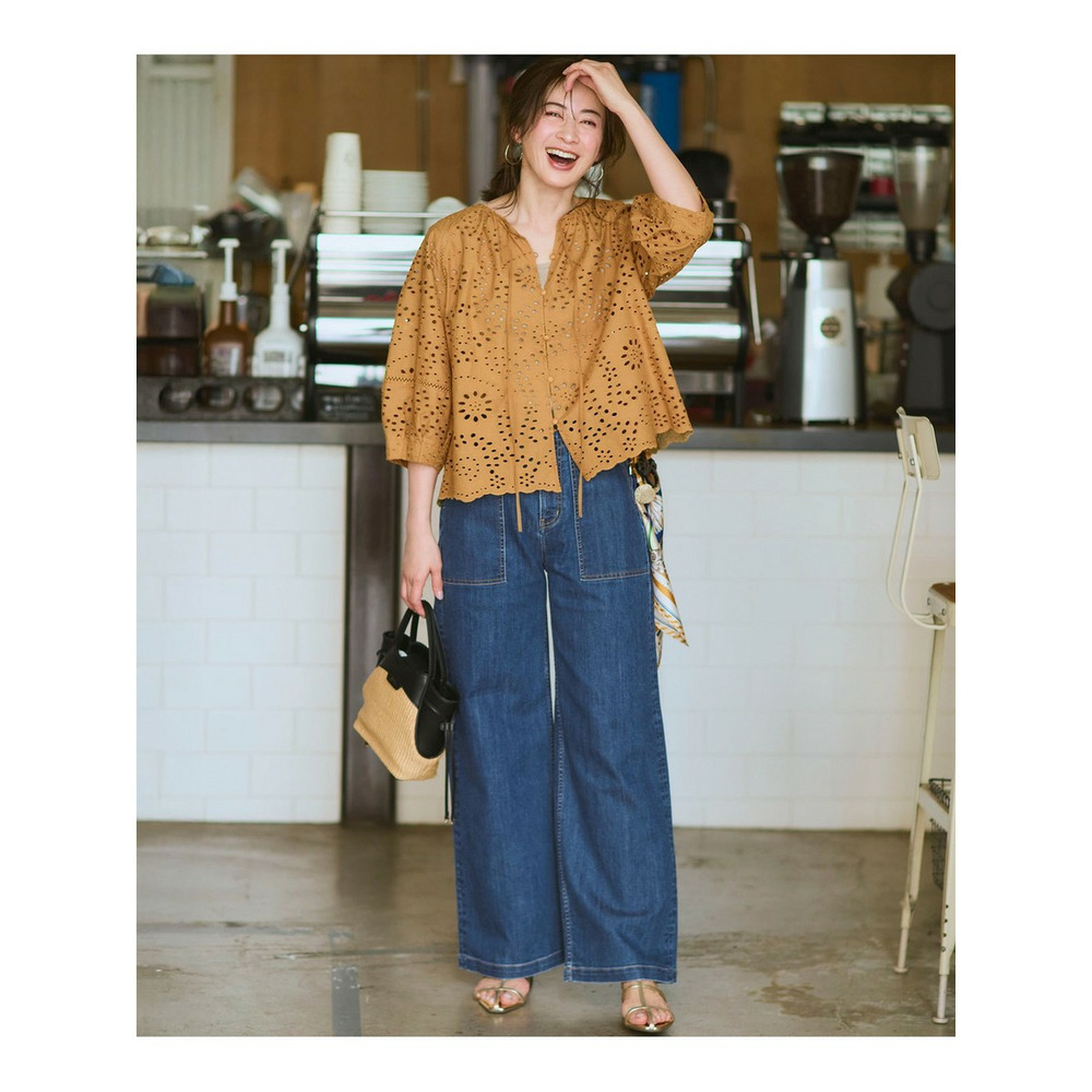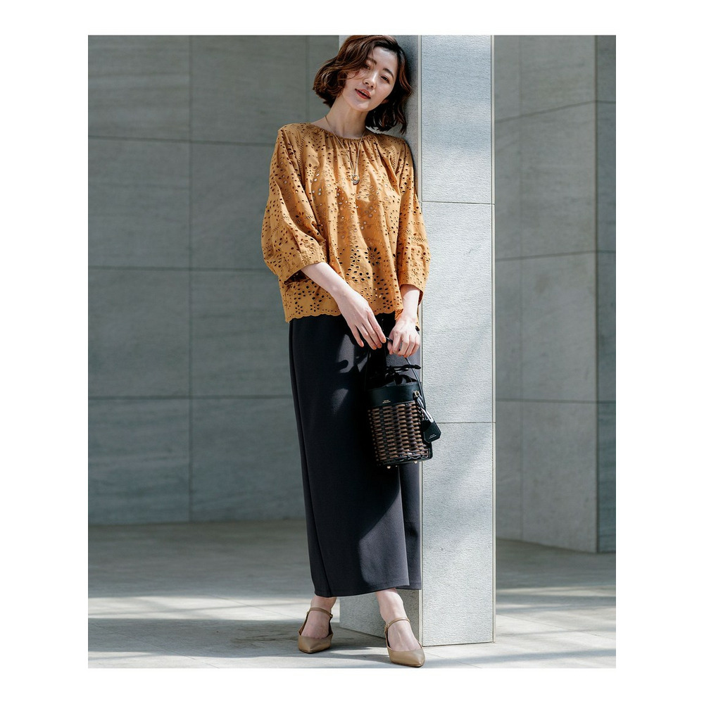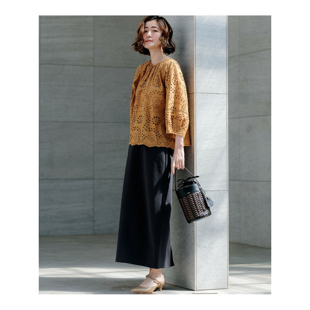 23区オリジナルのカットワーク刺繍を贅沢に施した、存在感のあるデザインブラウスです。 肩のラインにあしらわれたはしごレースと、裾の波打つようなスカラップデザイン(波型の縁取り)が、フェミニンで繊細なアクセントになっています。ふんわりとした袖のシルエットが、気になる二の腕をカバーしつつ、女性らしい優しげな印象を演出。 前後どちらでも着用可能な2WAY仕様になっており、その日の気分やスタイリングに合わせて着こなしの変化を楽しめるのも嬉しいポイントです。 デニムと合わせて大人のカジュアルスタイルに、きれいめなスラックスやスカートと合わせればオフィスやランチなどのオンタイムにも活躍します。 カラーは、清涼感のあるホワイト(#001)、シックで大人っぽいブラック(#005)、上品な華やかさのキャメル(#034)、落ち着いたトーンでトレンド感のあるダークブラウン(#035)の4色展開です。