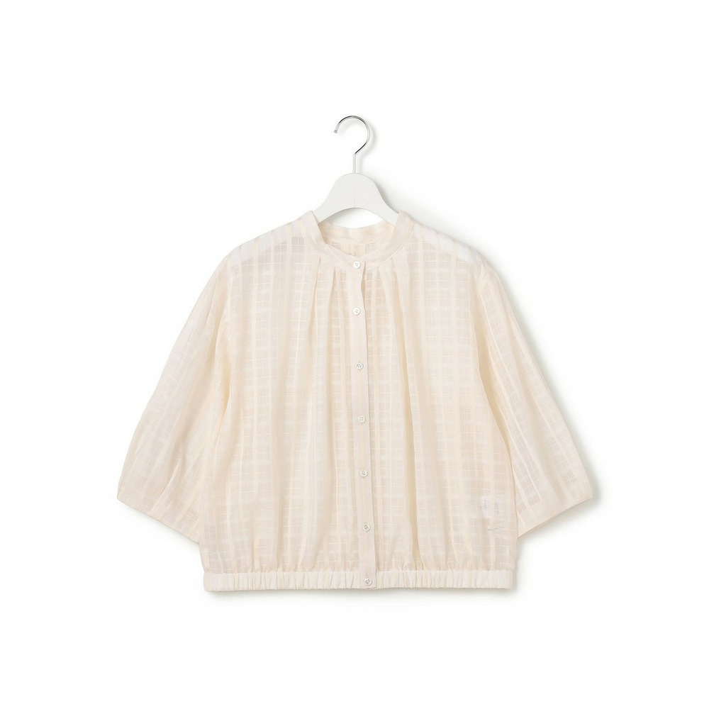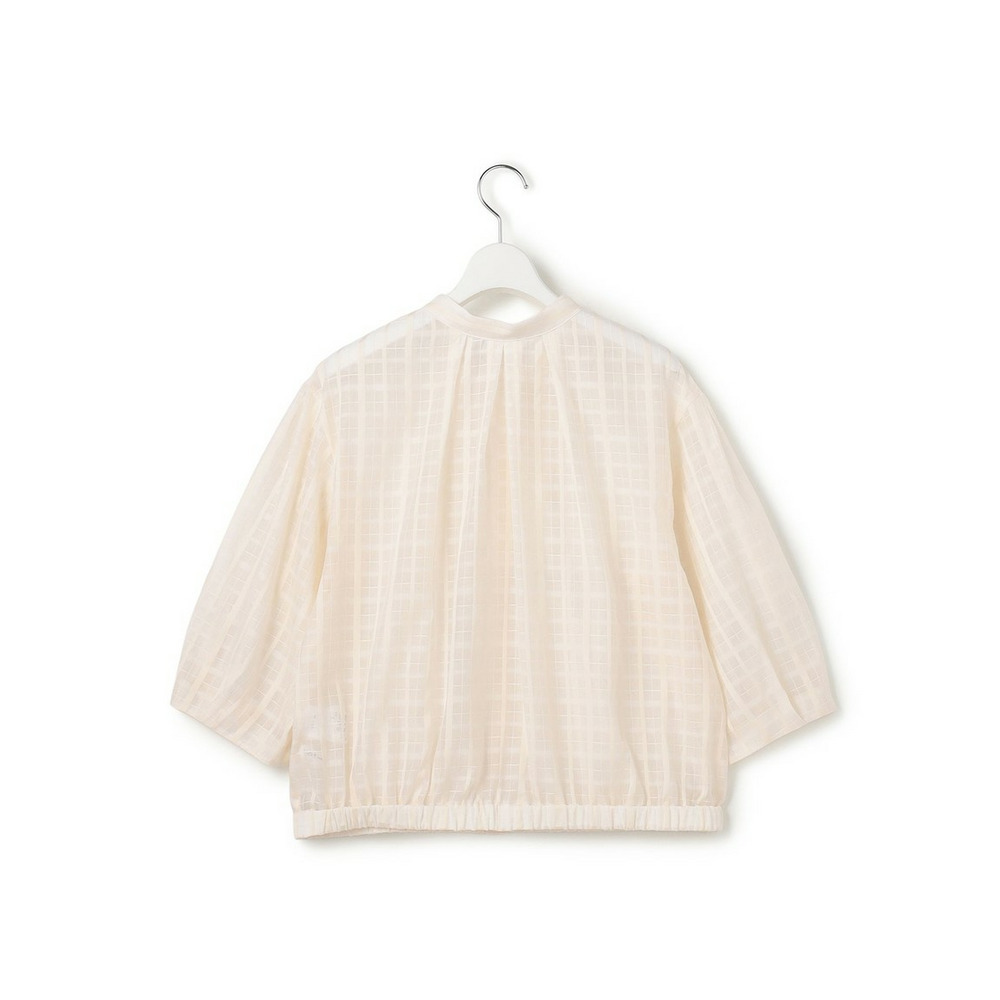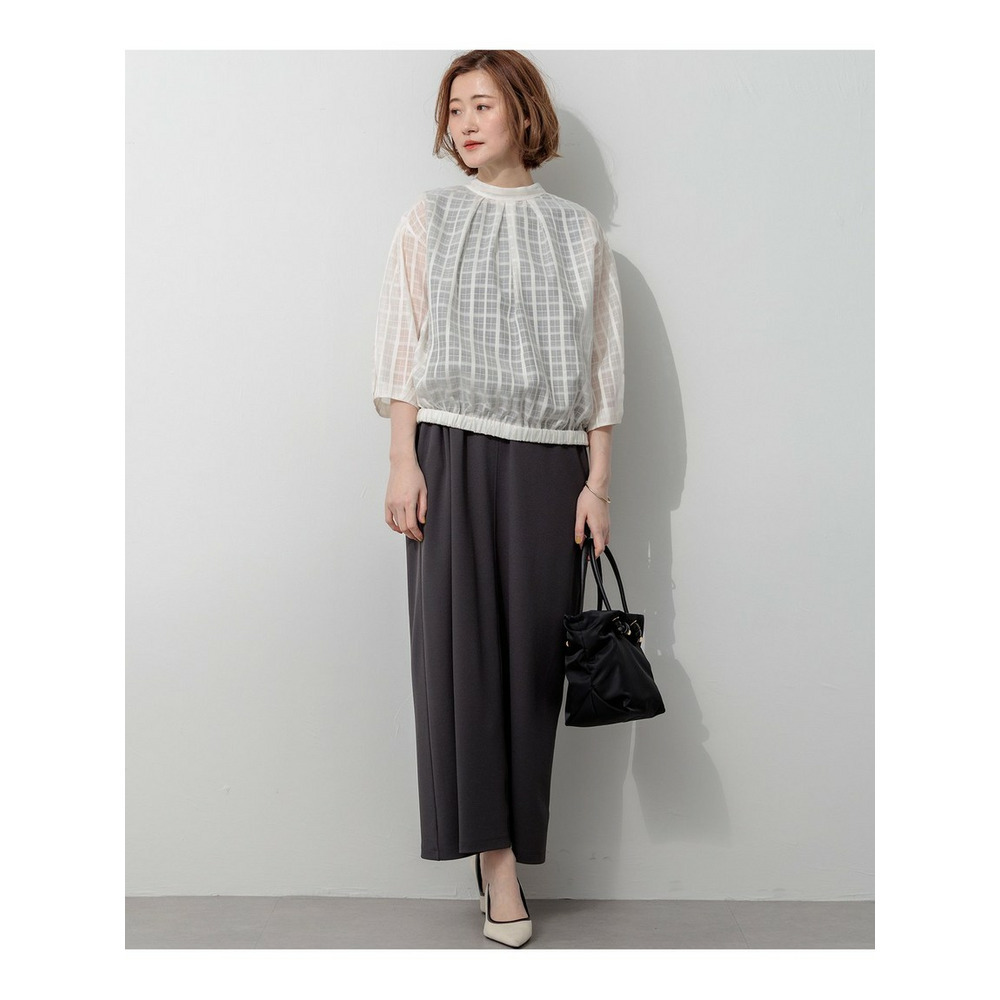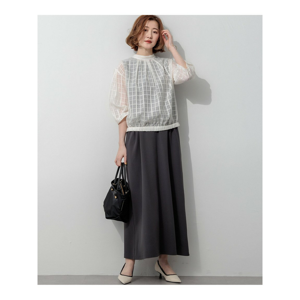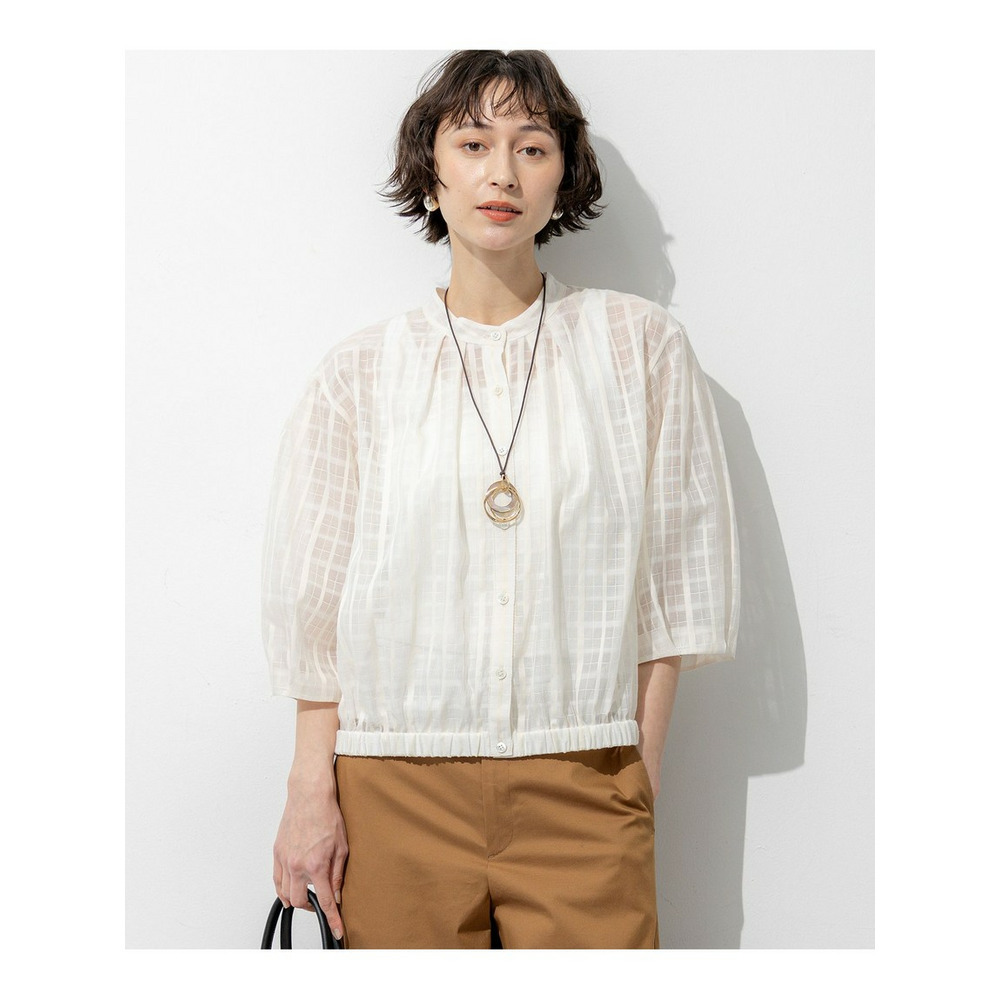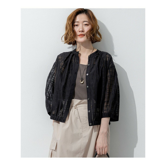 前後どちらでも着用できる、汎用性の高いシアーチェックブラウスです。ボタンを前にすればカーディガン感覚の羽織りとして、後ろにすればプルオーバーとして、その日の気分やスタイリングに合わせてアレンジを楽しめます。袖にはタックを施し、ふんわりとした立体的なフォルムに仕上げました。気になる二の腕を自然にカバーしながら、一枚で着映えする女性らしい柔らかなシルエットを演出します。 透け感のある素材は見た目にも涼しく、夏の冷房対策としても重宝します。きれいめなパンツやスカートと合わせれば上品な大人コーデに、デニムやワイドパンツと合わせればカジュアルスタイルにと、幅広いシーンで活躍します。 カラーは、肌馴染みが良く顔周りを明るく彩るアイボリー(#002)、シックな透け感が大人の魅力を引き立てるブラック(#005)の2色展開です。