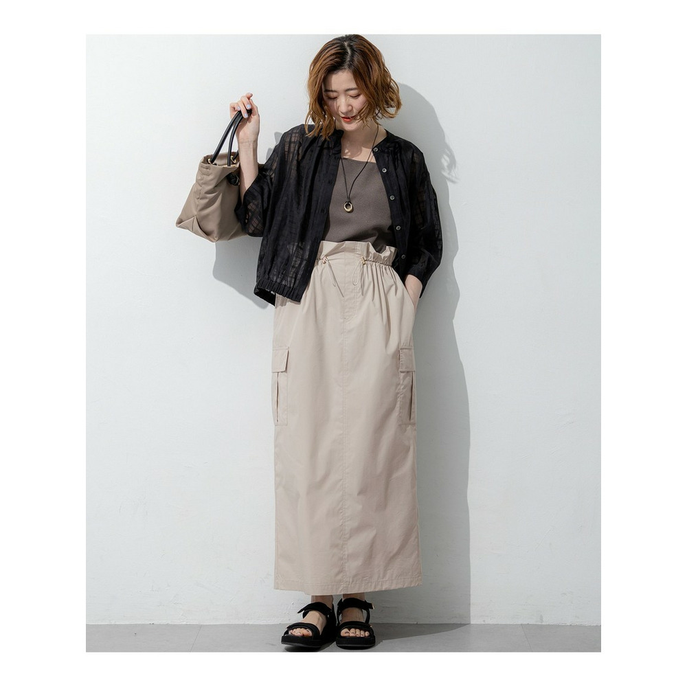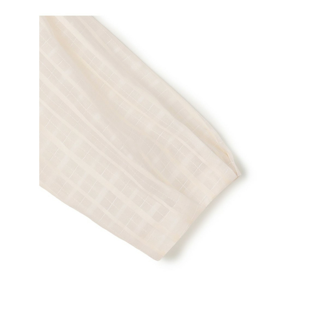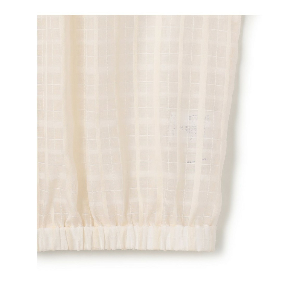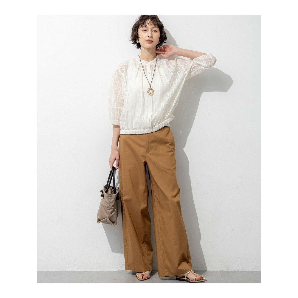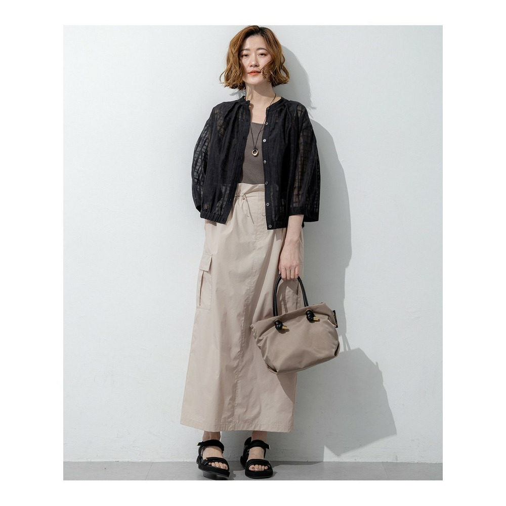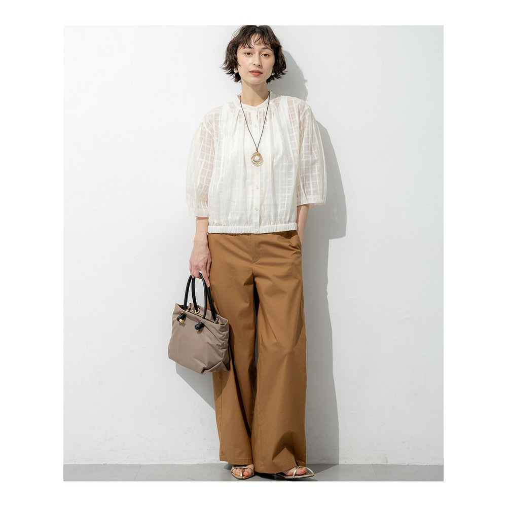 前後どちらでも着用できる、汎用性の高いシアーチェックブラウスです。ボタンを前にすればカーディガン感覚の羽織りとして、後ろにすればプルオーバーとして、その日の気分やスタイリングに合わせてアレンジを楽しめます。袖にはタックを施し、ふんわりとした立体的なフォルムに仕上げました。気になる二の腕を自然にカバーしながら、一枚で着映えする女性らしい柔らかなシルエットを演出します。 透け感のある素材は見た目にも涼しく、夏の冷房対策としても重宝します。きれいめなパンツやスカートと合わせれば上品な大人コーデに、デニムやワイドパンツと合わせればカジュアルスタイルにと、幅広いシーンで活躍します。 カラーは、肌馴染みが良く顔周りを明るく彩るアイボリー(#002)、シックな透け感が大人の魅力を引き立てるブラック(#005)の2色展開です。