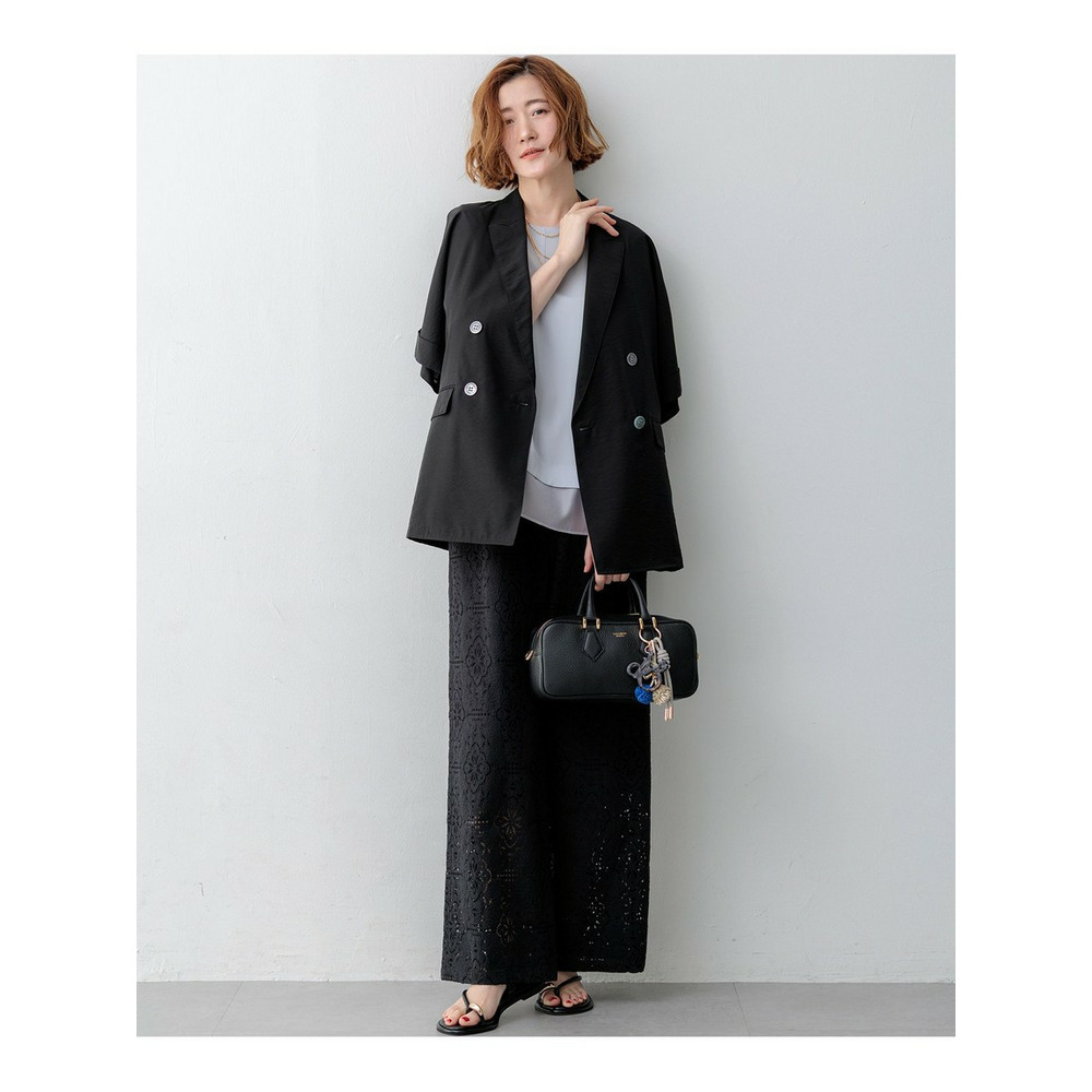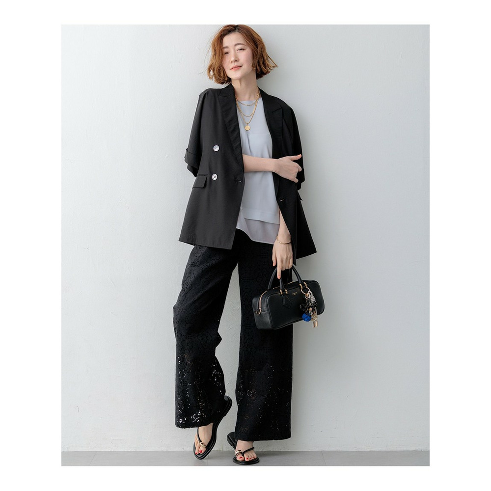 程よいシアー素材が涼しげな印象を与える、ハーフスリーブのジャケットです。オーバーサイズ過ぎないすっきりとしたシルエットにこだわり、リラックス感がありながらもきれいめな印象に仕上げました。薄手で非常に軽い着心地のため、カーディガン感覚でさらりと羽織ることができ、夏の冷房対策や日除けアイテムとしても最適です。ブラウスやワンピースと合わせたきれいめスタイルはもちろん、Tシャツやタンクトップの上に羽織ってデニムと合わせれば、洗練された大人のカジュアルスタイルが完成します。幅広いシーンで着回せる、ワードローブにあると便利な一枚です。カラーは、シックで万能なブラック(#005)、肌馴染みが良く女性らしいベージュ(#033)、落ち着いたトーンでこなれ感のあるブラウン(#030)の3色展開です。