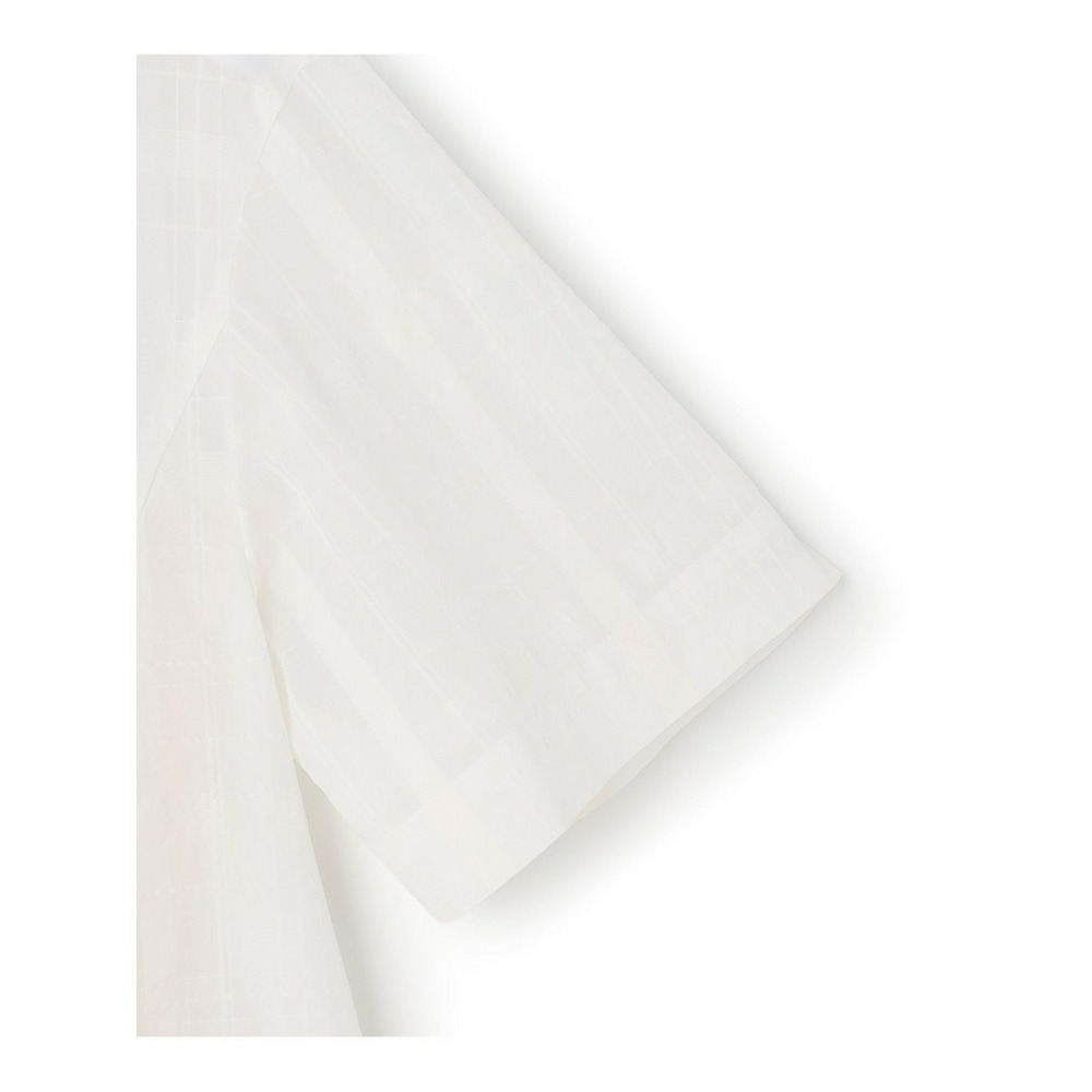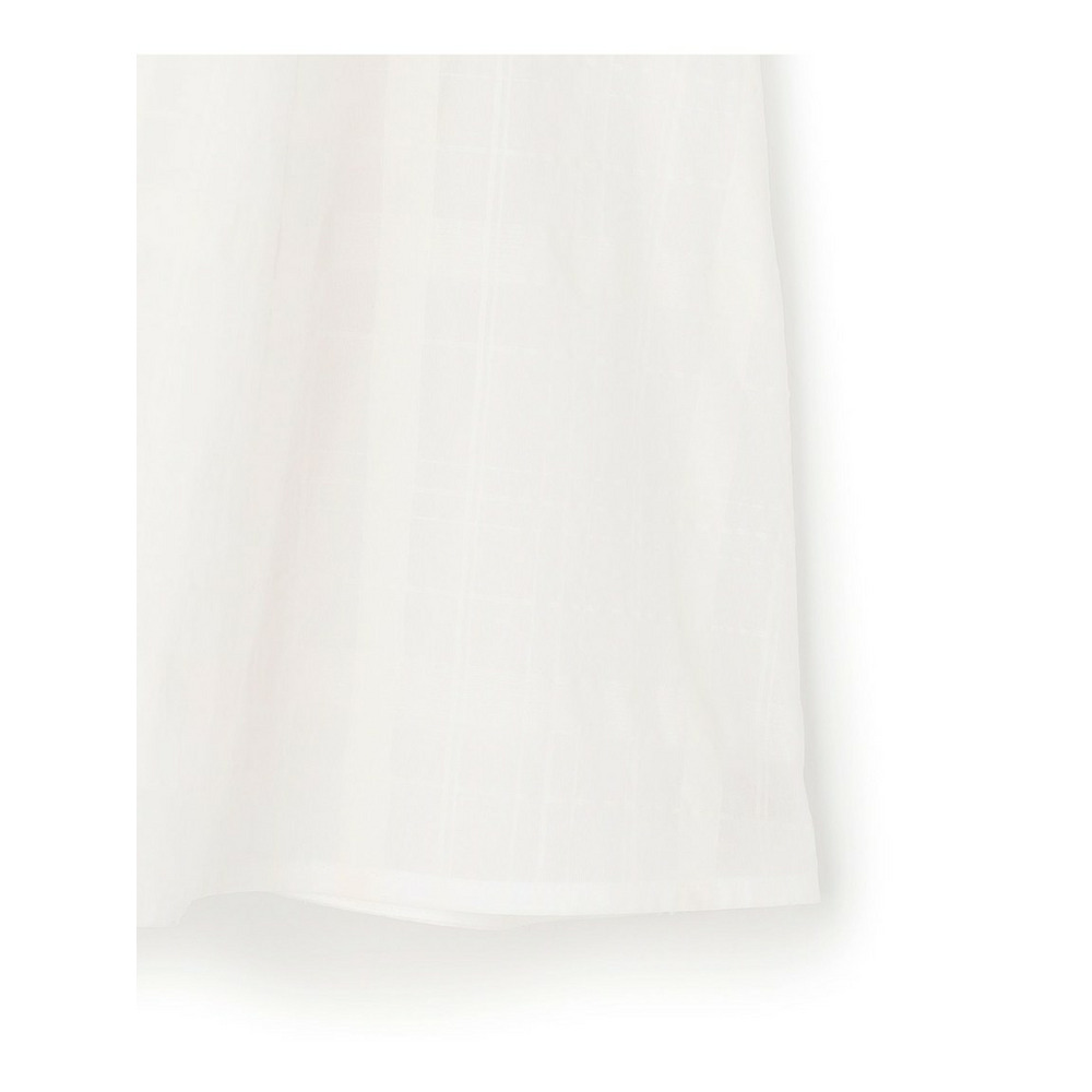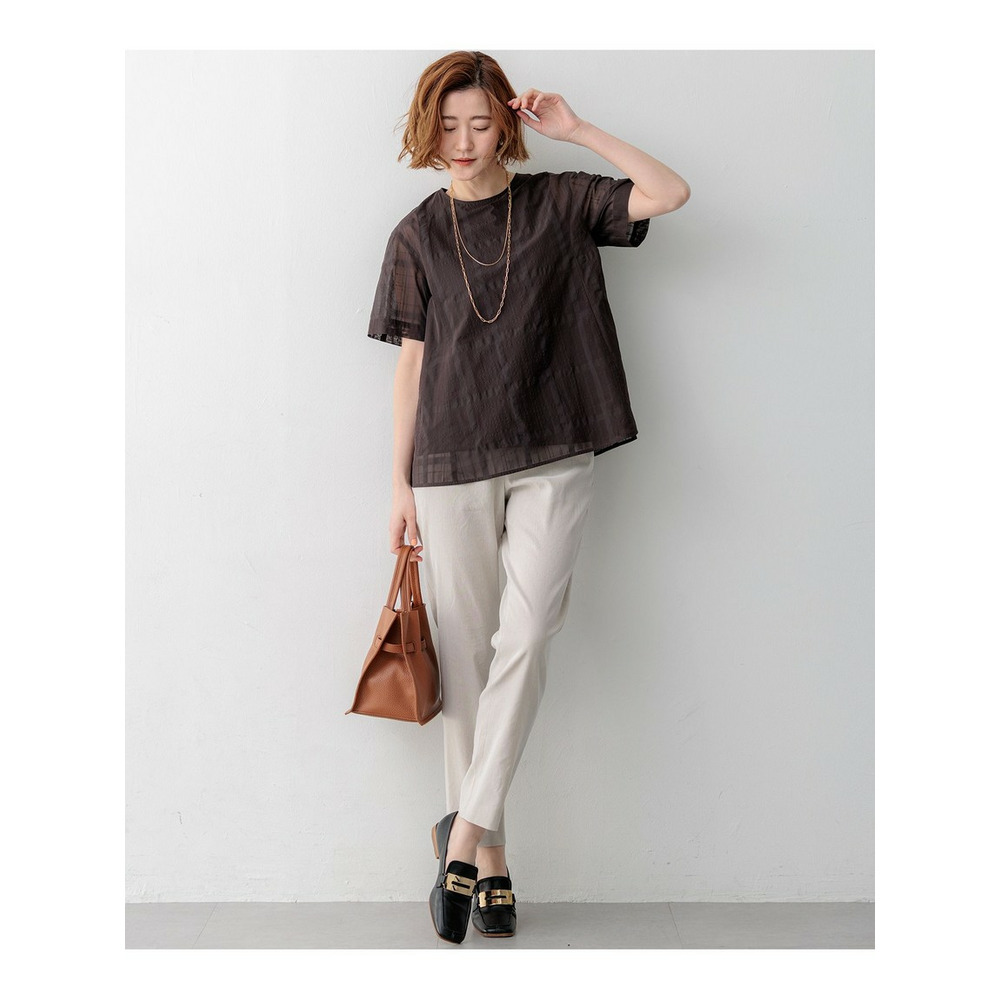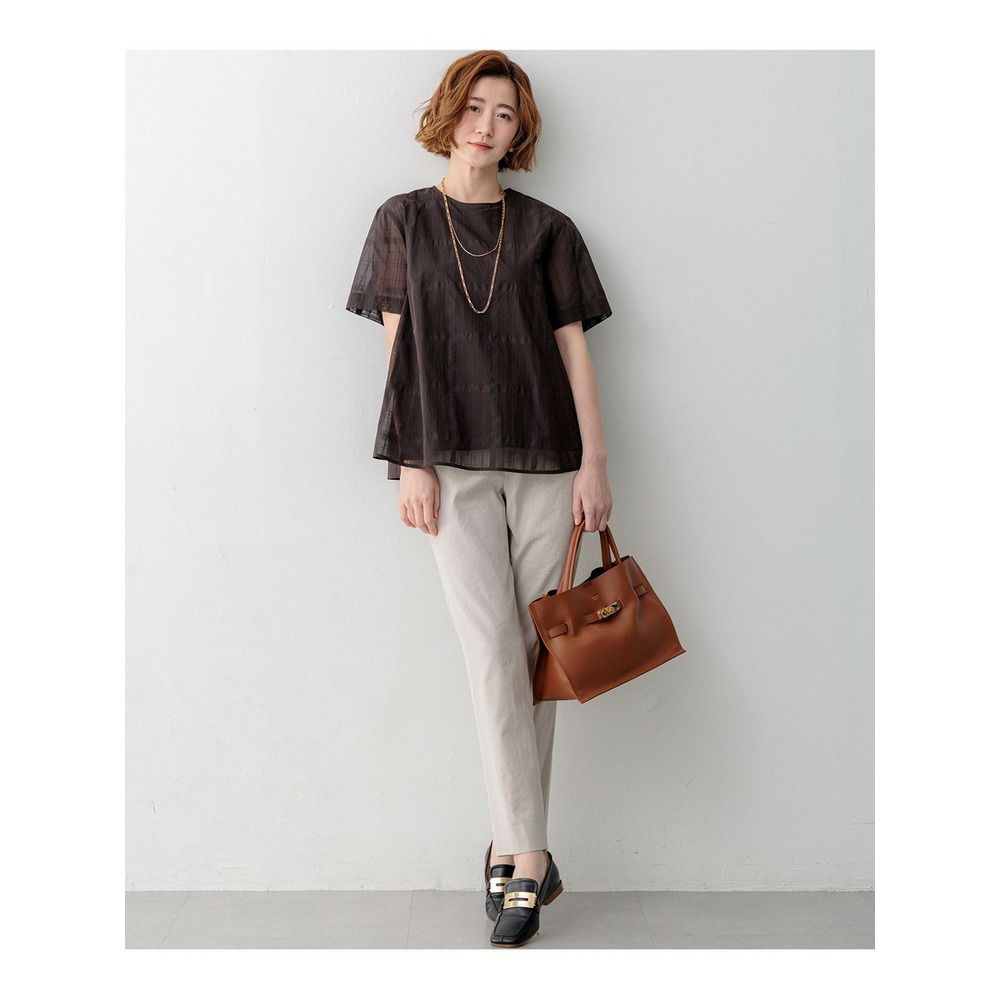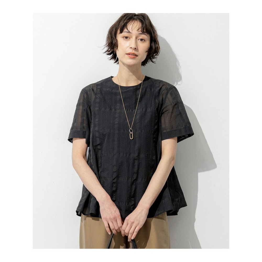透け感のあるベース生地に同色の糸を使ってチェック柄を表現した空気を含んだようなエアリーなシャドーチェックの素材を使用しています。肌離れの良い適度なハリ感がありシルエットを美しく保ちます。ご自宅でお手入れしやすいイージーケア素材なのも嬉しいポイントです。同色で配した大きめのチェック柄は光の当たり具合で表情感が変わるため派手すぎず、柄物が苦手な方でも取り入れやすくコーディネートに奥行きと高級感をプラスします。