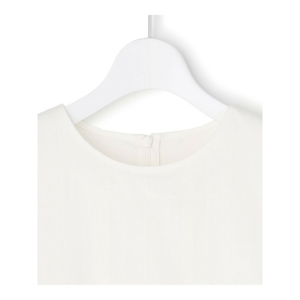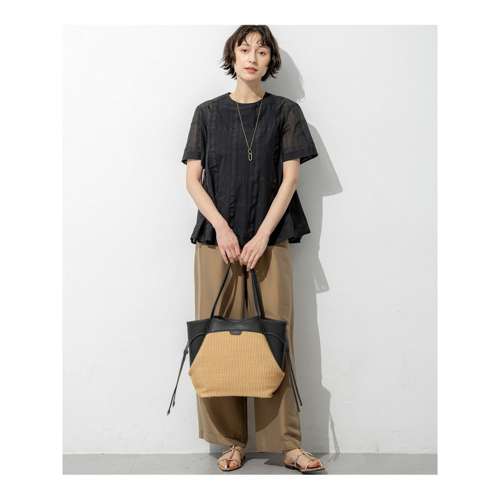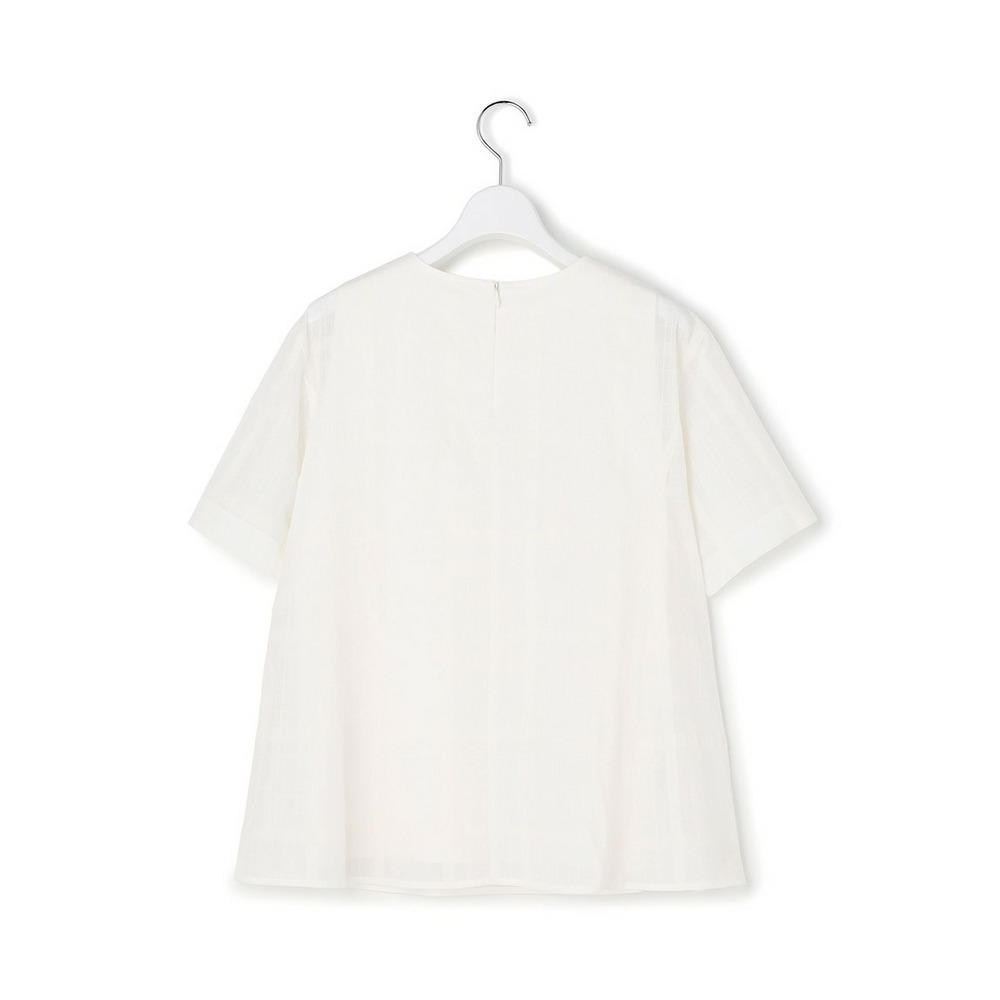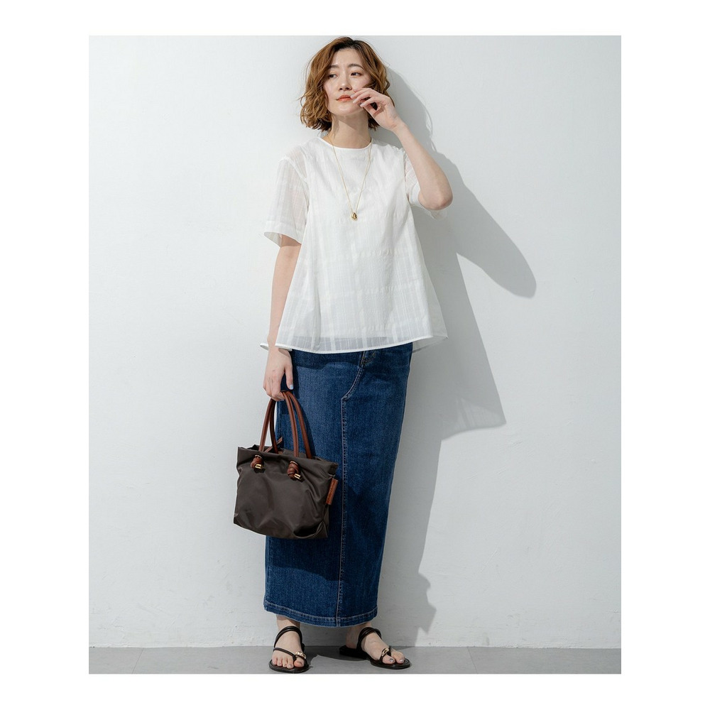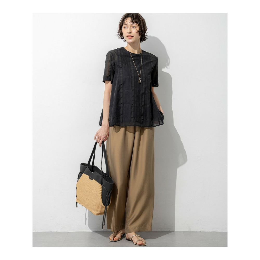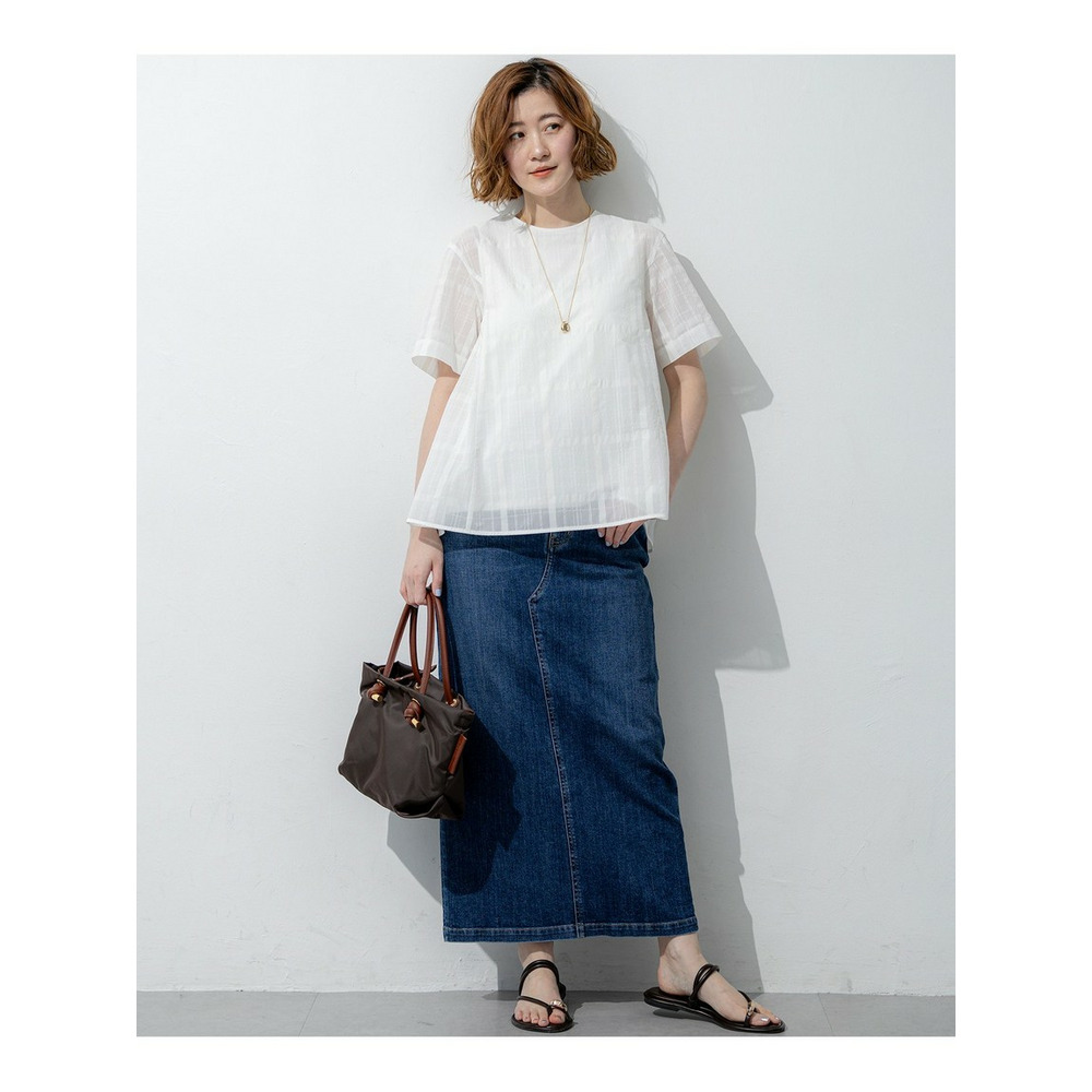 透け感のあるベース生地に同色の糸を使ってチェック柄を表現した空気を含んだようなエアリーなシャドーチェックの素材を使用しています。肌離れの良い適度なハリ感がありシルエットを美しく保ちます。ご自宅でお手入れしやすいイージーケア素材なのも嬉しいポイントです。同色で配した大きめのチェック柄は光の当たり具合で表情感が変わるため派手すぎず、柄物が苦手な方でも取り入れやすくコーディネートに奥行きと高級感をプラスします。