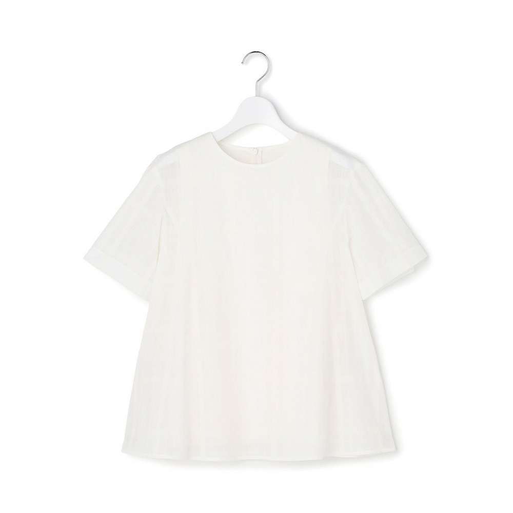 パネルラインで切り替えることで裾に向かってふんわりと広がる程よいフレアシルエットに仕上げたミニマルな半袖ブラウスです。内側にはタンクトップ型のカットソーが縫い付けられているため気になる透け感を軽減しインナー選びに迷うことなく一枚で軽やかに着用いただけます。きれいめなパンツやスカートと合わせればオフィスシーンに馴染み、ジャケットのインナーとしても重宝します。またデニムなどのカジュアルなボトムスと合わせれば程よい抜け感のある大人の休日スタイルが完成します。カラーは清潔感のあるホワイト(#001)、シックで万能なブラック(#005)、落ち着いたトーンで上品なダークブラウン(#035)の3色展開です。