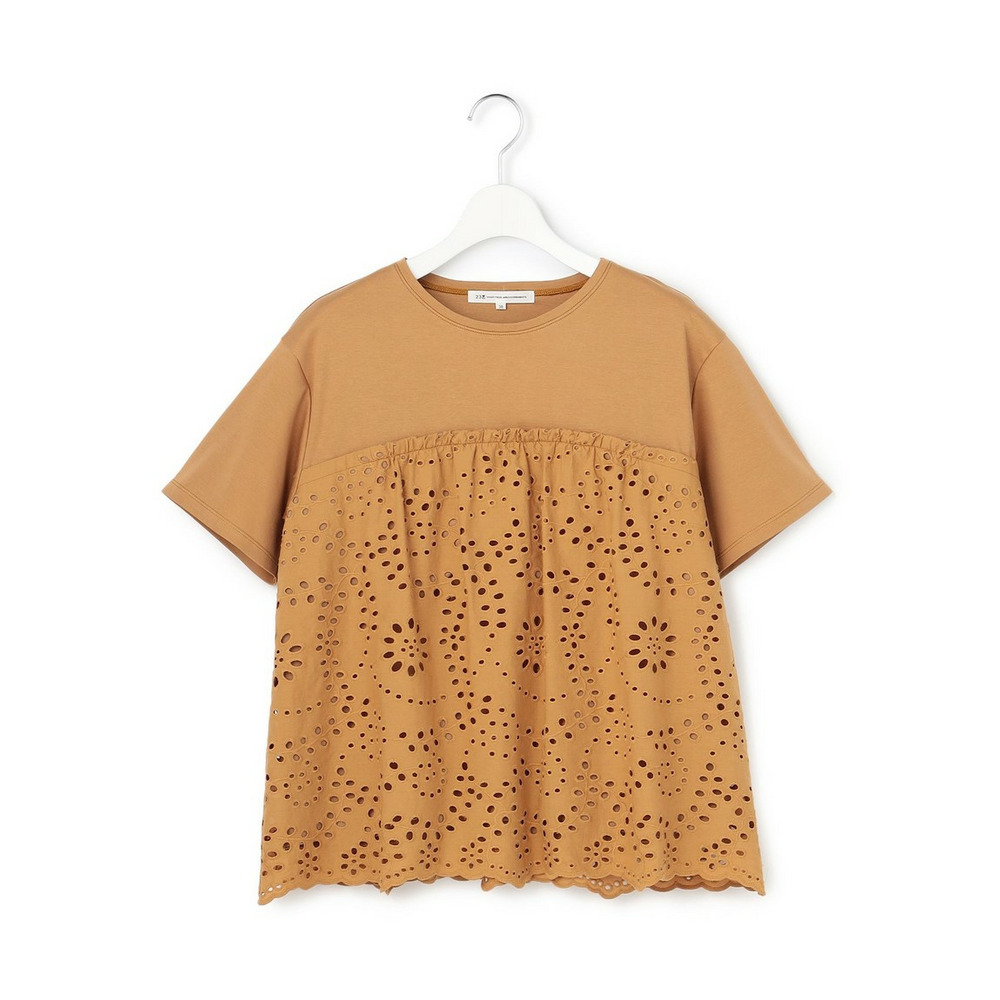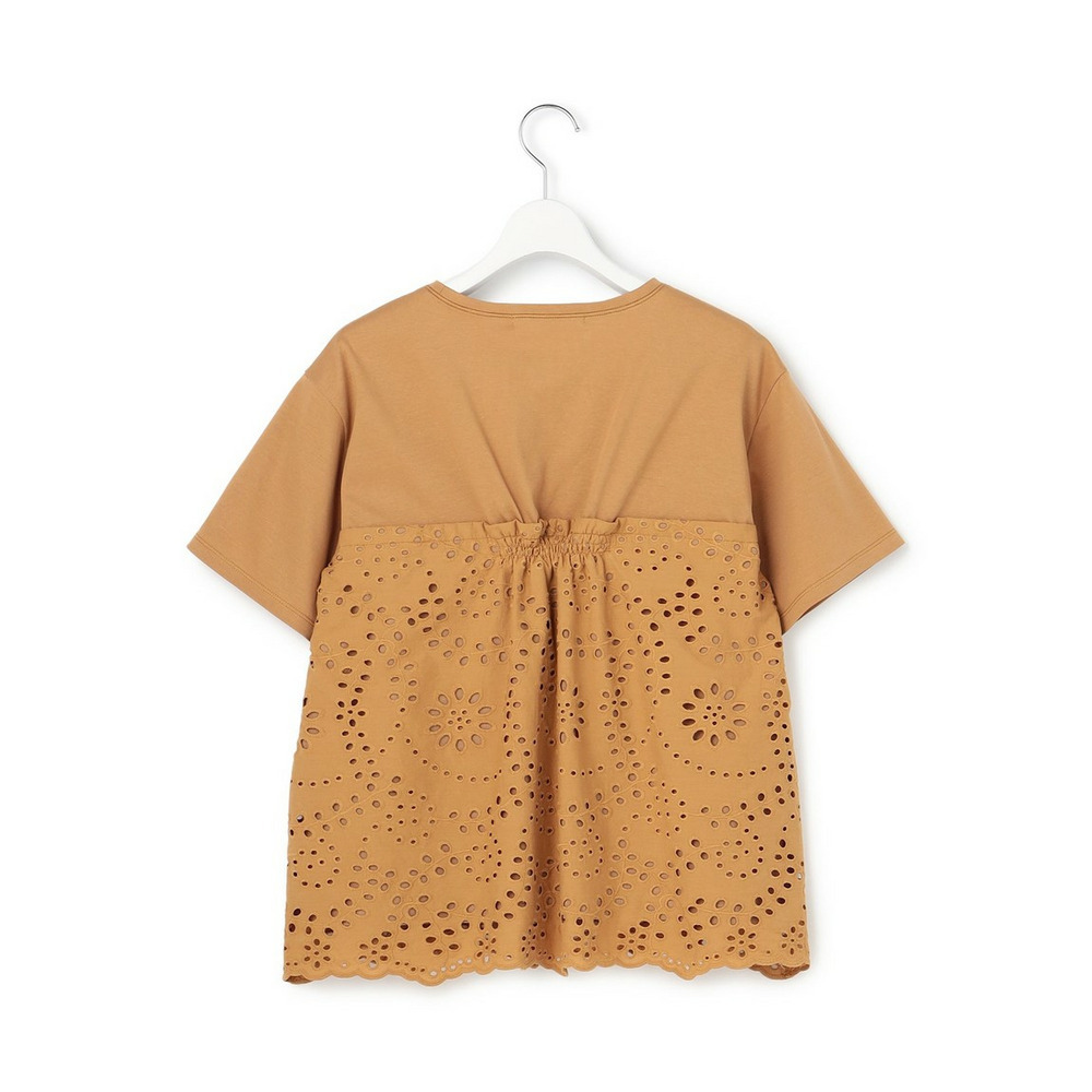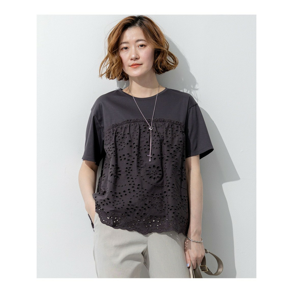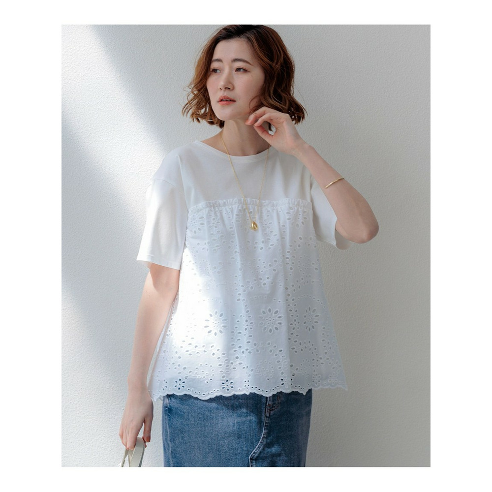 表面がクリアで滑らかなジャージー素材を使用しています。適度な肉感があるため体のラインを拾いにくく、安心してご着用いただけます。切り替え下のペプラム部分には、繊細な穴あき模様が特徴のカットワークレース生地を組み合わせました。リラックス感のあるカットソー素材と、きちんと感のあるシャツのような素材のコントラストが、上品で高見えするスタイルを演出します。