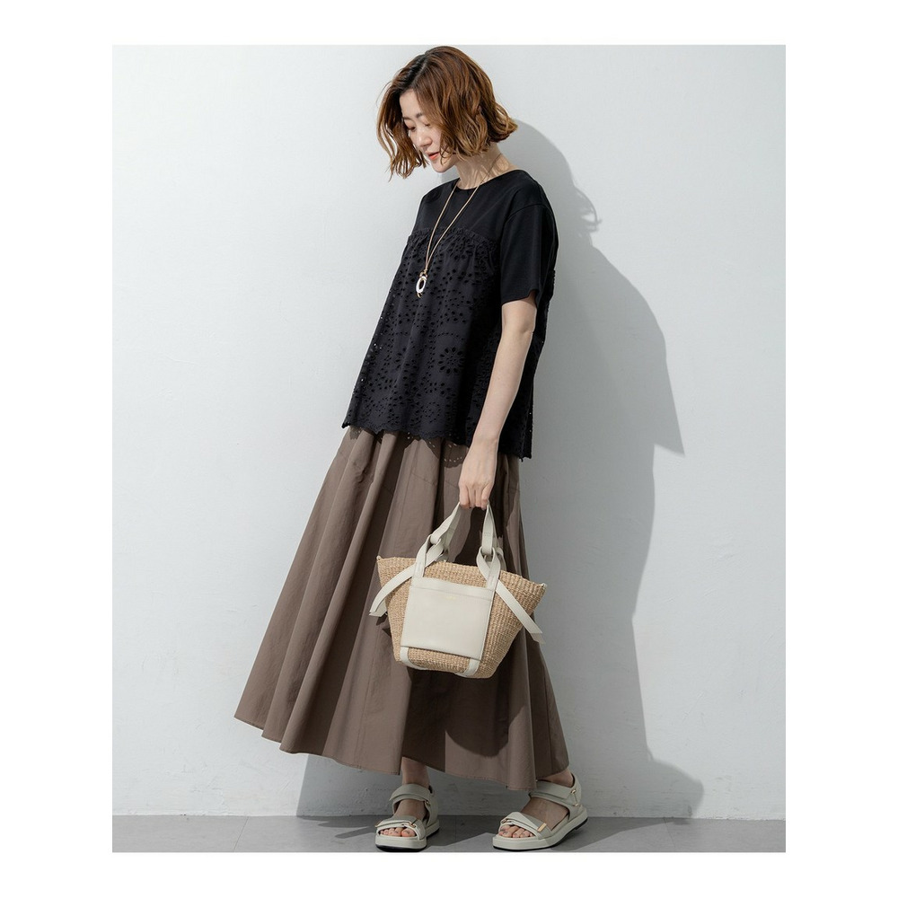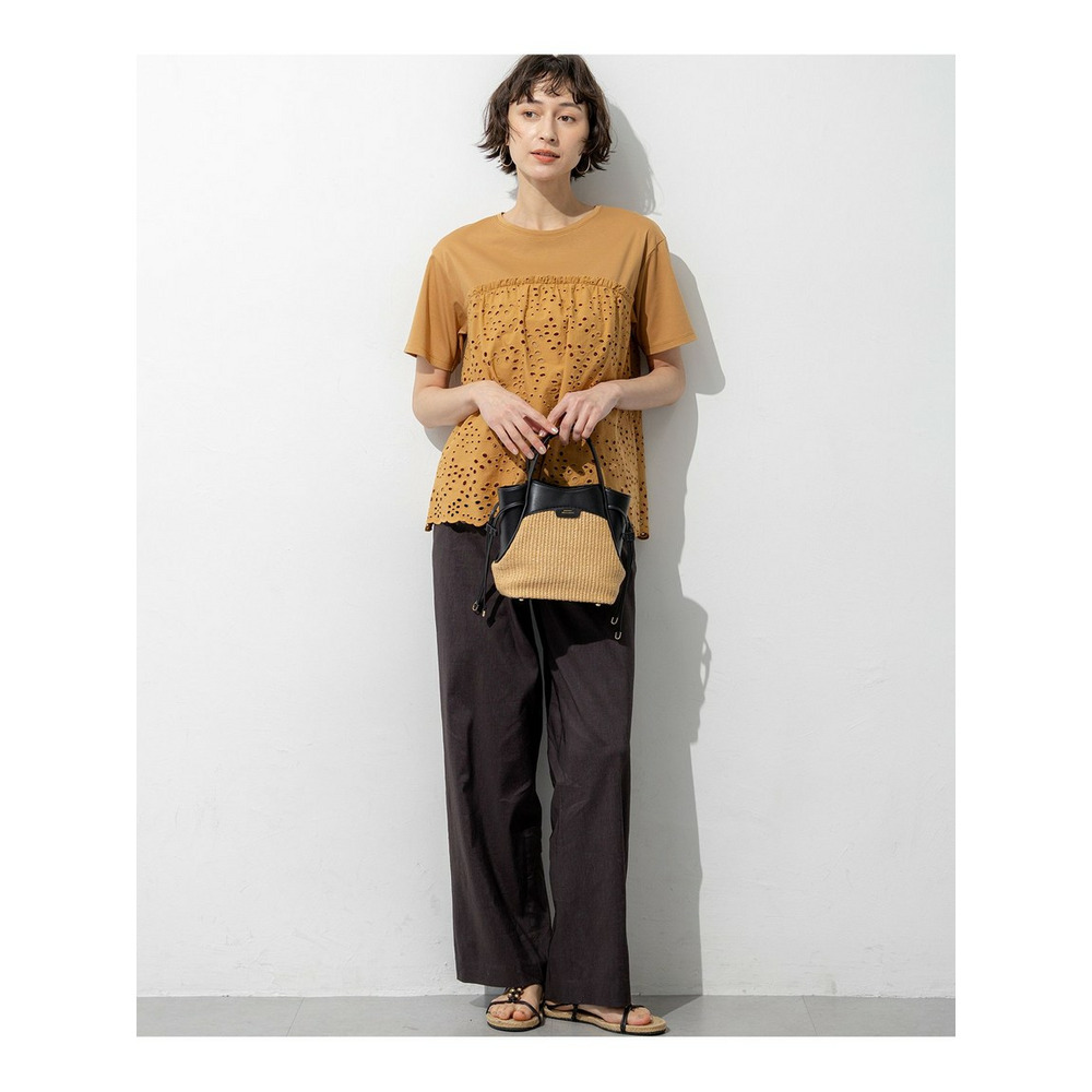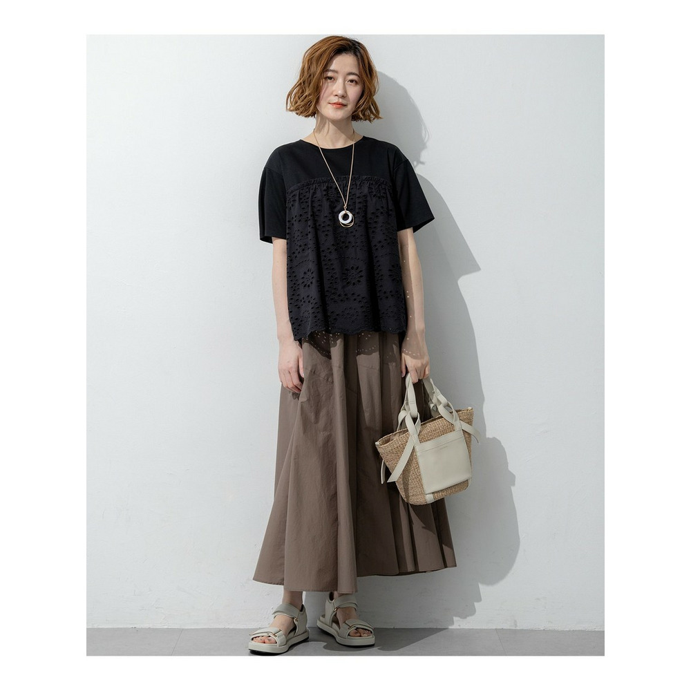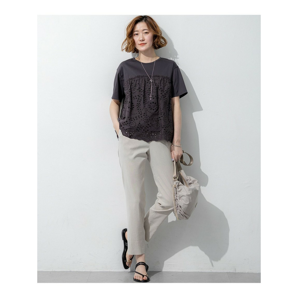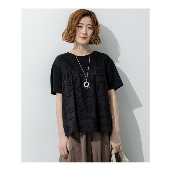表面がクリアで滑らかなジャージー素材を使用しています。適度な肉感があるため体のラインを拾いにくく、安心してご着用いただけます。切り替え下のペプラム部分には、繊細な穴あき模様が特徴のカットワークレース生地を組み合わせました。リラックス感のあるカットソー素材と、きちんと感のあるシャツのような素材のコントラストが、上品で高見えするスタイルを演出します。