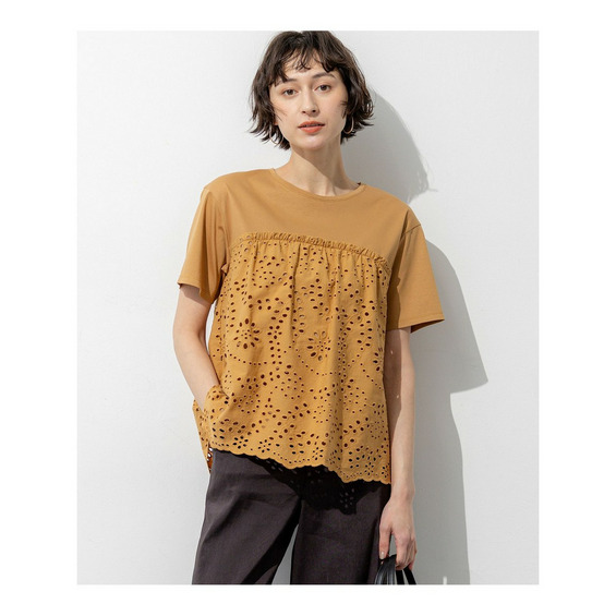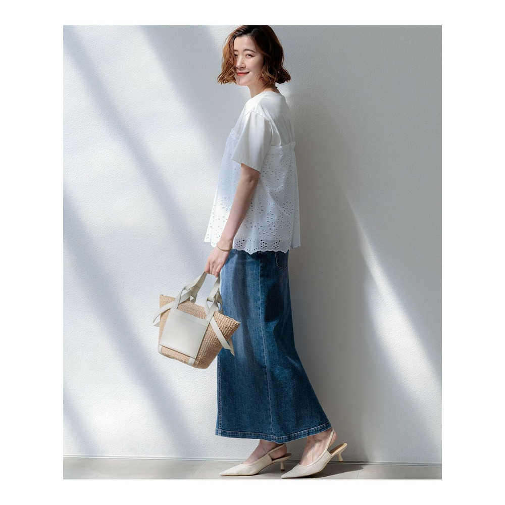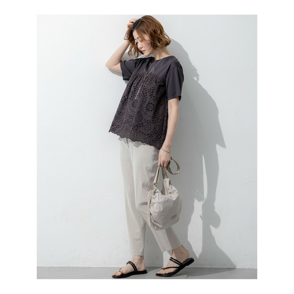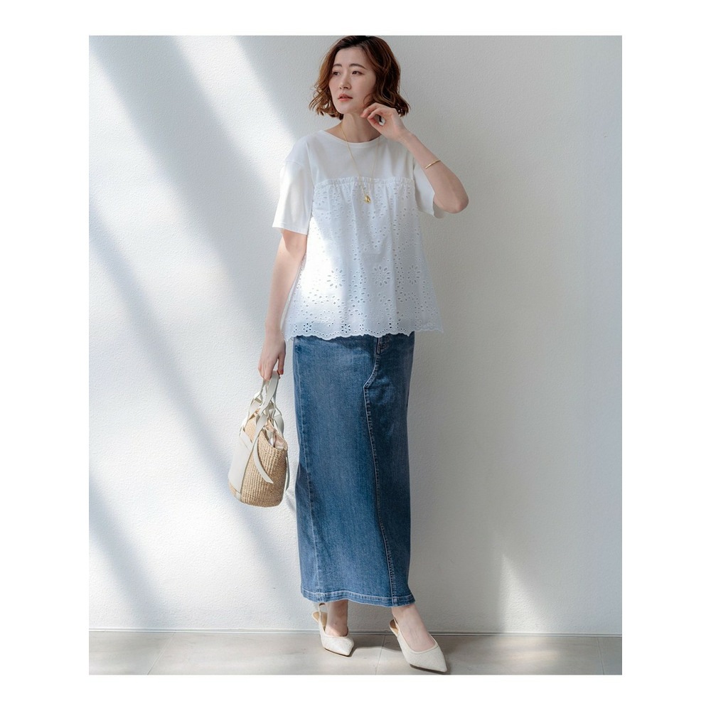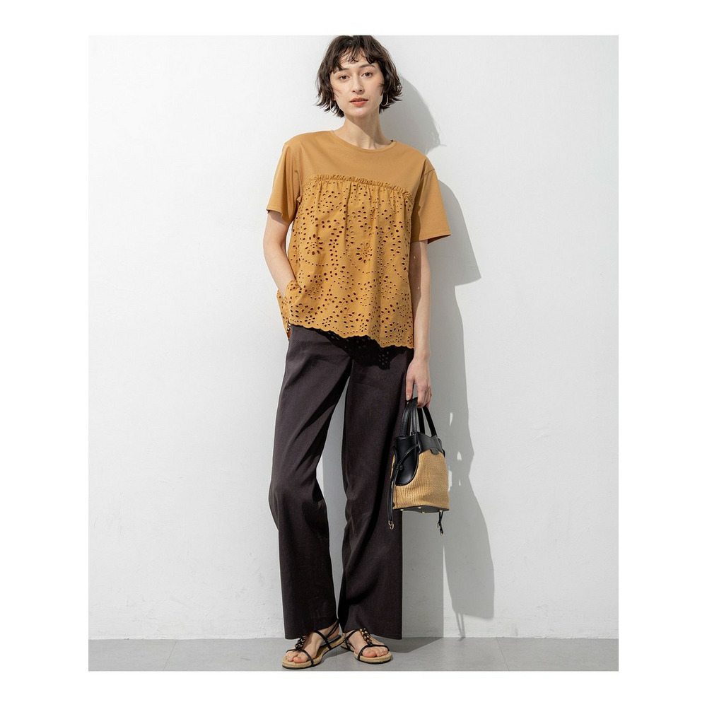 裾に施された繊細な刺繍と波状のスカラップデザインが目を惹くプルオーバーです。シンプルなクルーネックとすっきりとしたコンパクトな袖の身頃に、表情豊かな刺繍生地をドッキングさせました。華やかなデザインでありながら、ふんわりとしたペプラムシルエットが気になるお腹周りを自然にカバーしてくれるのも嬉しいポイントです。身頃にはジャージー素材の裏地が付いているため、透けを気にせず一枚で安心して着用いただけます。デニムやワイドパンツと合わせて大人のカジュアルスタイルを楽しむのはもちろん、テーパードパンツやスカートと合わせればお出かけシーンにも活躍します。 カラーは、爽やかで万能なホワイト(#001)、シックでモダンな印象のブラック(#005)、肌馴染みが良く上品なキャメル(#034)、落ち着いた雰囲気のダークブラウン(#035)の4色展開です。