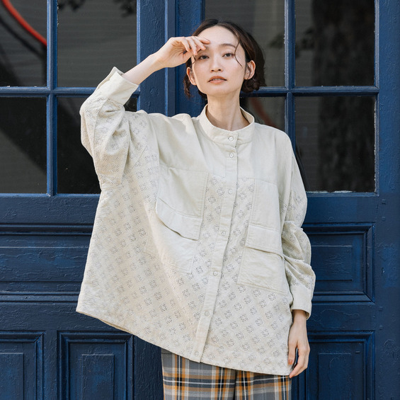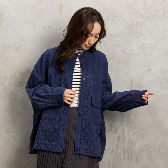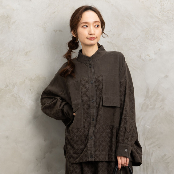 コーデュロイ素材と同じ素材のエンブロイダリー生地を切り替えたコンビデザインシャツ。