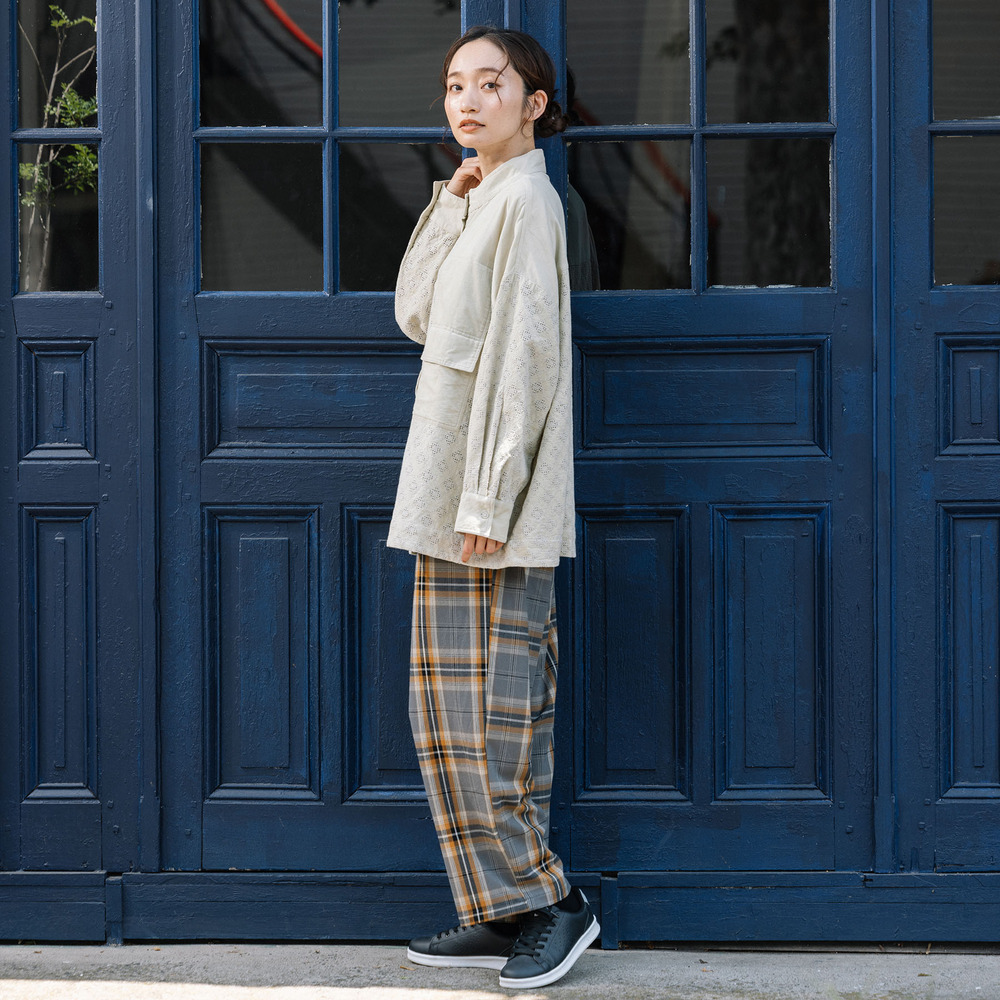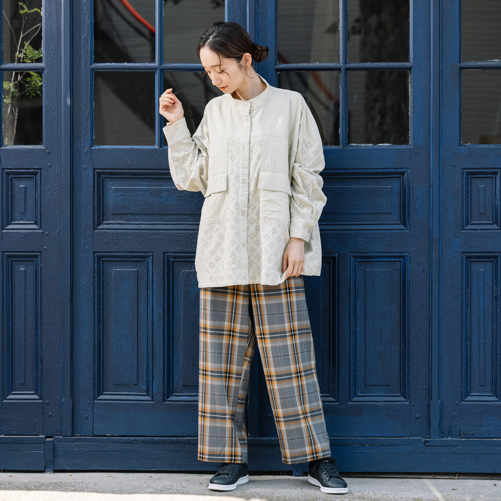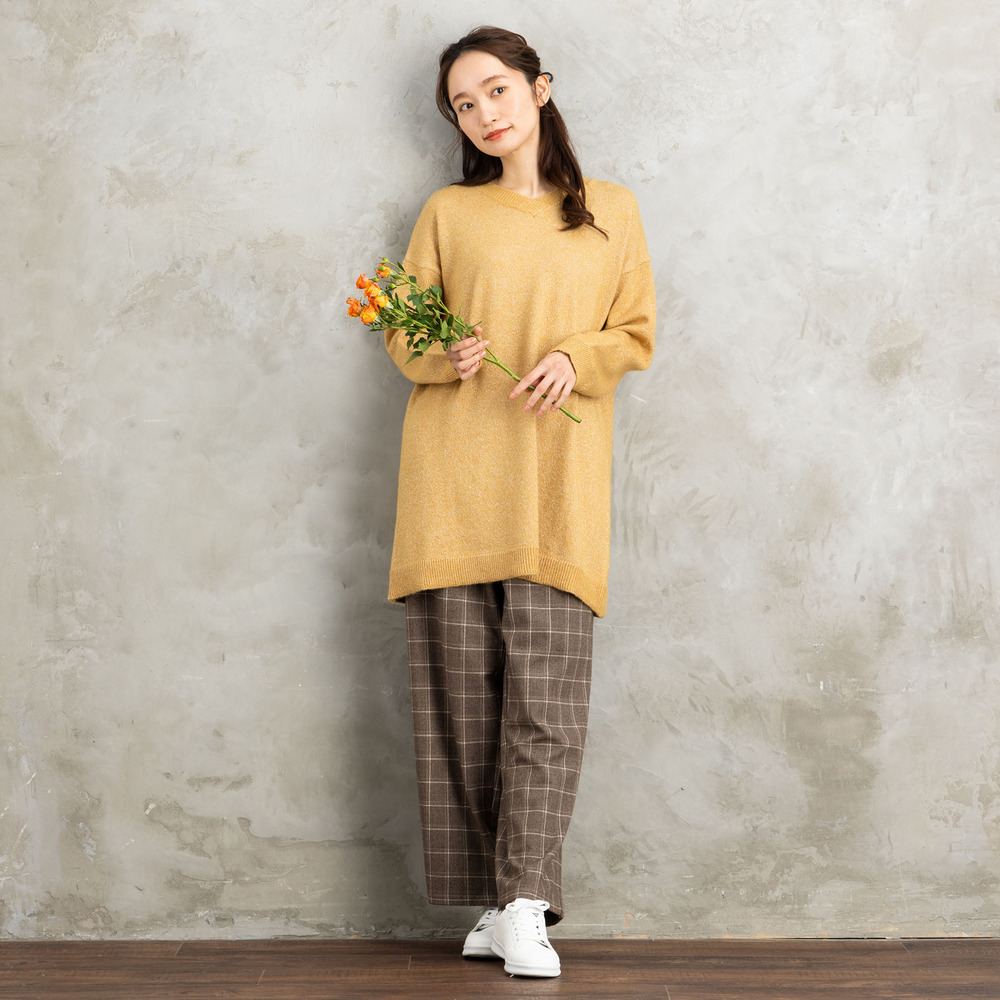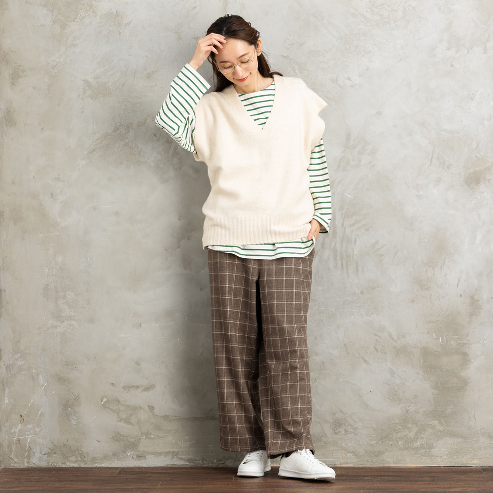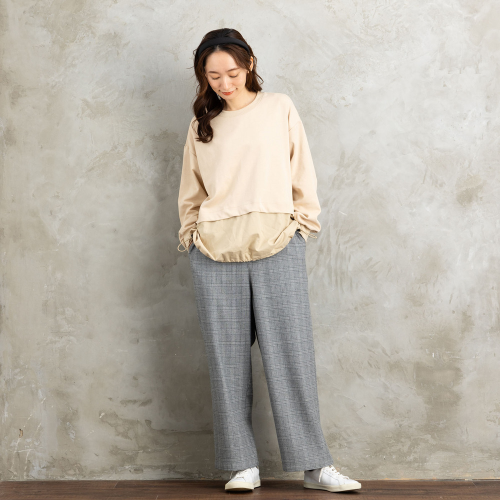 スウェットやニットなどを合わせてカジュアルに、ブラウスやカーディガンなどを合わせてキレイめなスタイルに、様々なトップスとの相性がよく着こなしの幅が広がります。