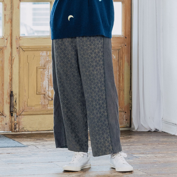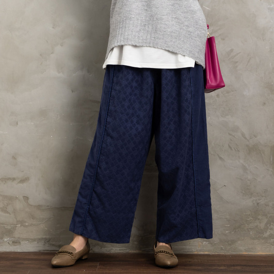 コーデュロイ素材と同じ素材のエンブロイダリー生地を切り替えたコンビデザインパンツ。