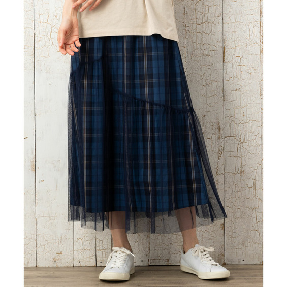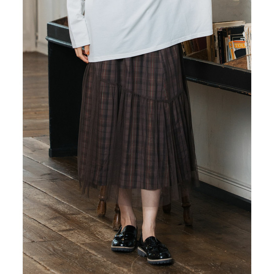 大人可愛い秋カラーのチェックにチュールを重ねたレイヤードスカート。