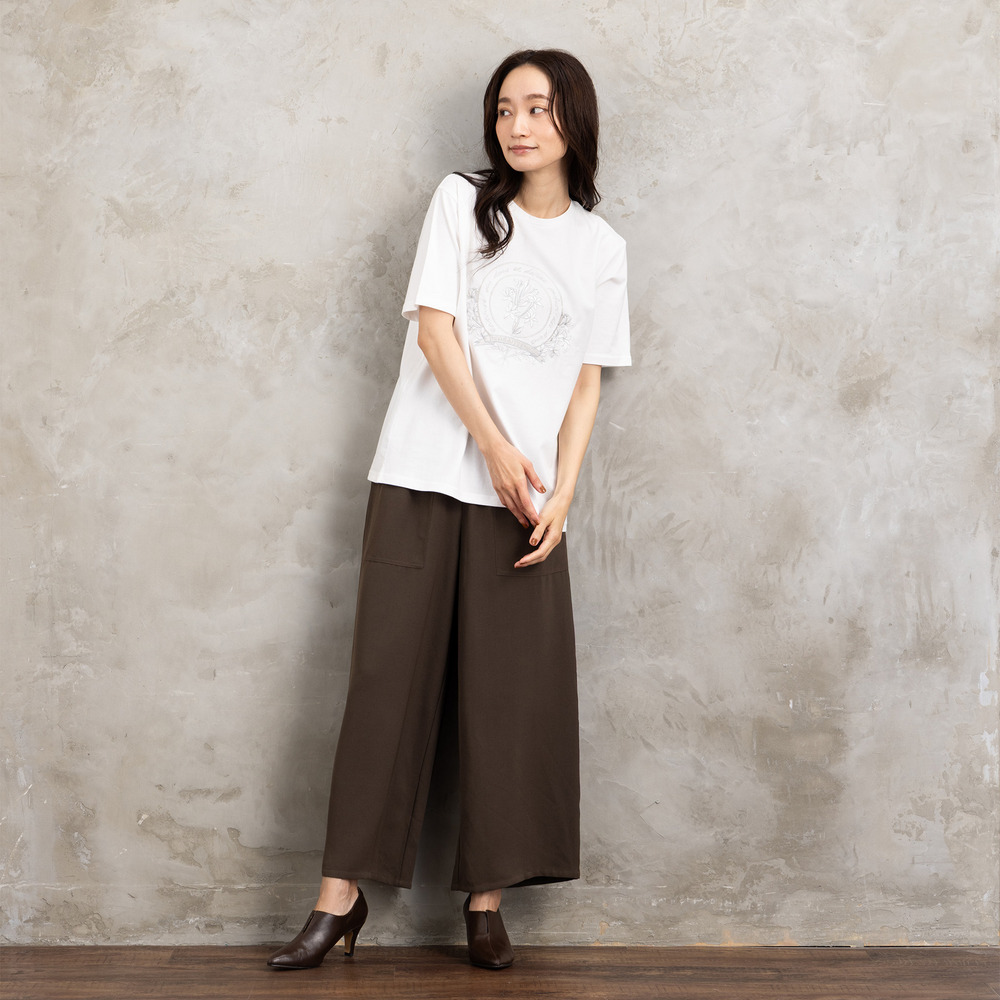 胸元に施された花と文字のエンブレム刺繍が、大人のカジュアルに品を添える一枚。