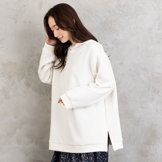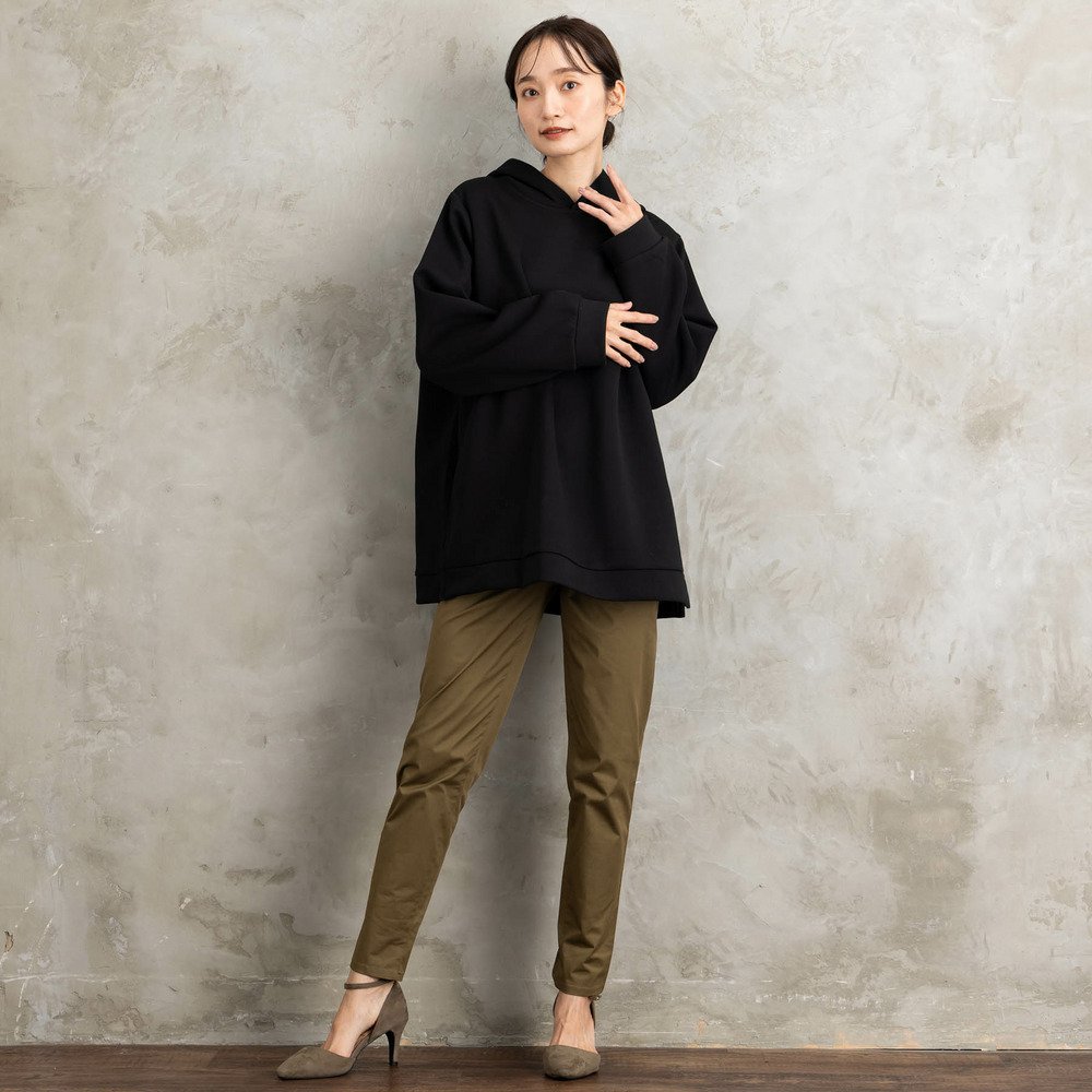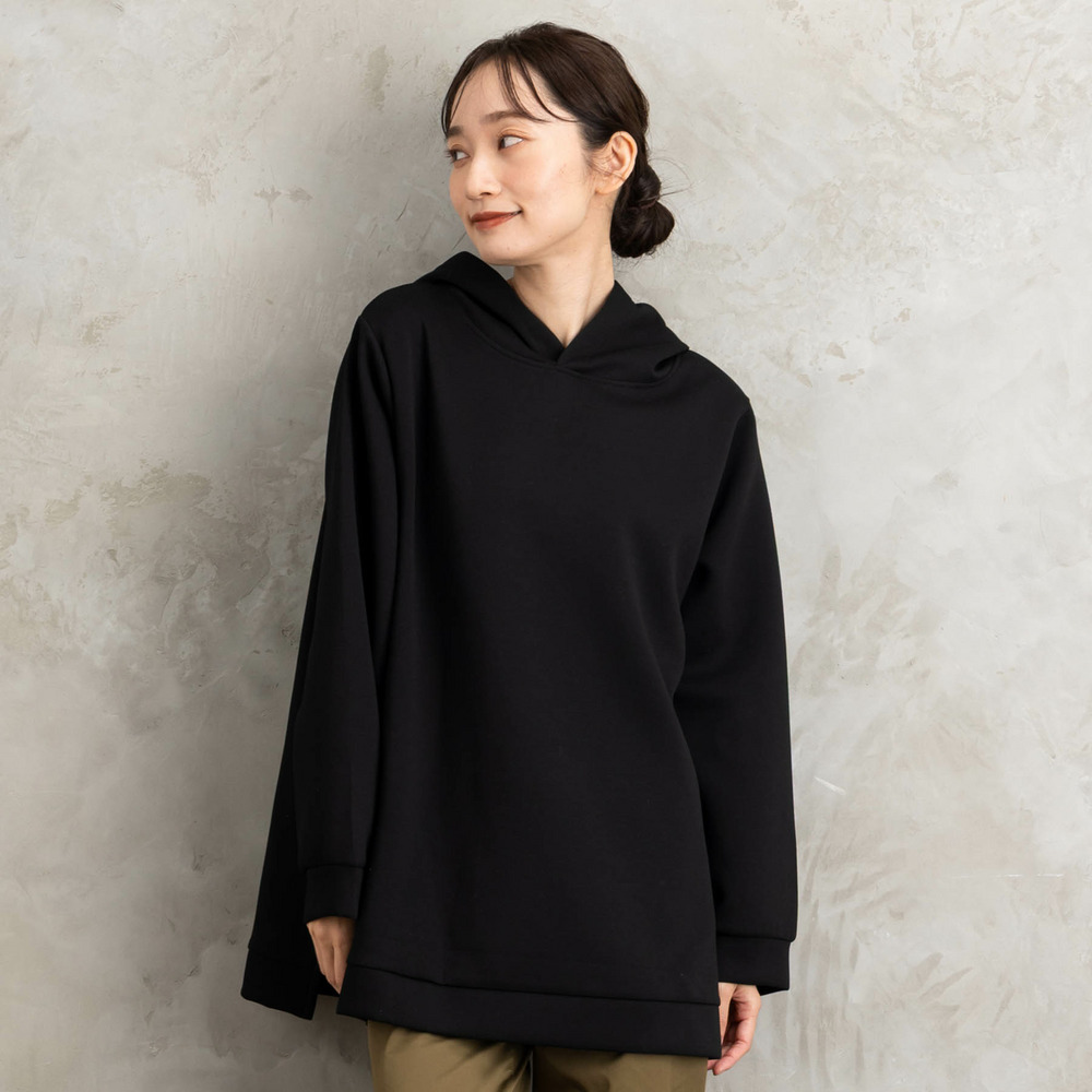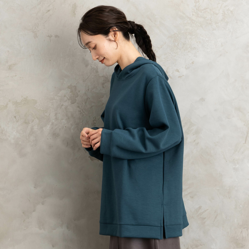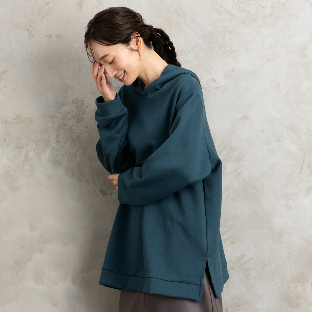 シンプルながらフードデザインがアクセントになり、ラフすぎず品よく着こなせる一枚。