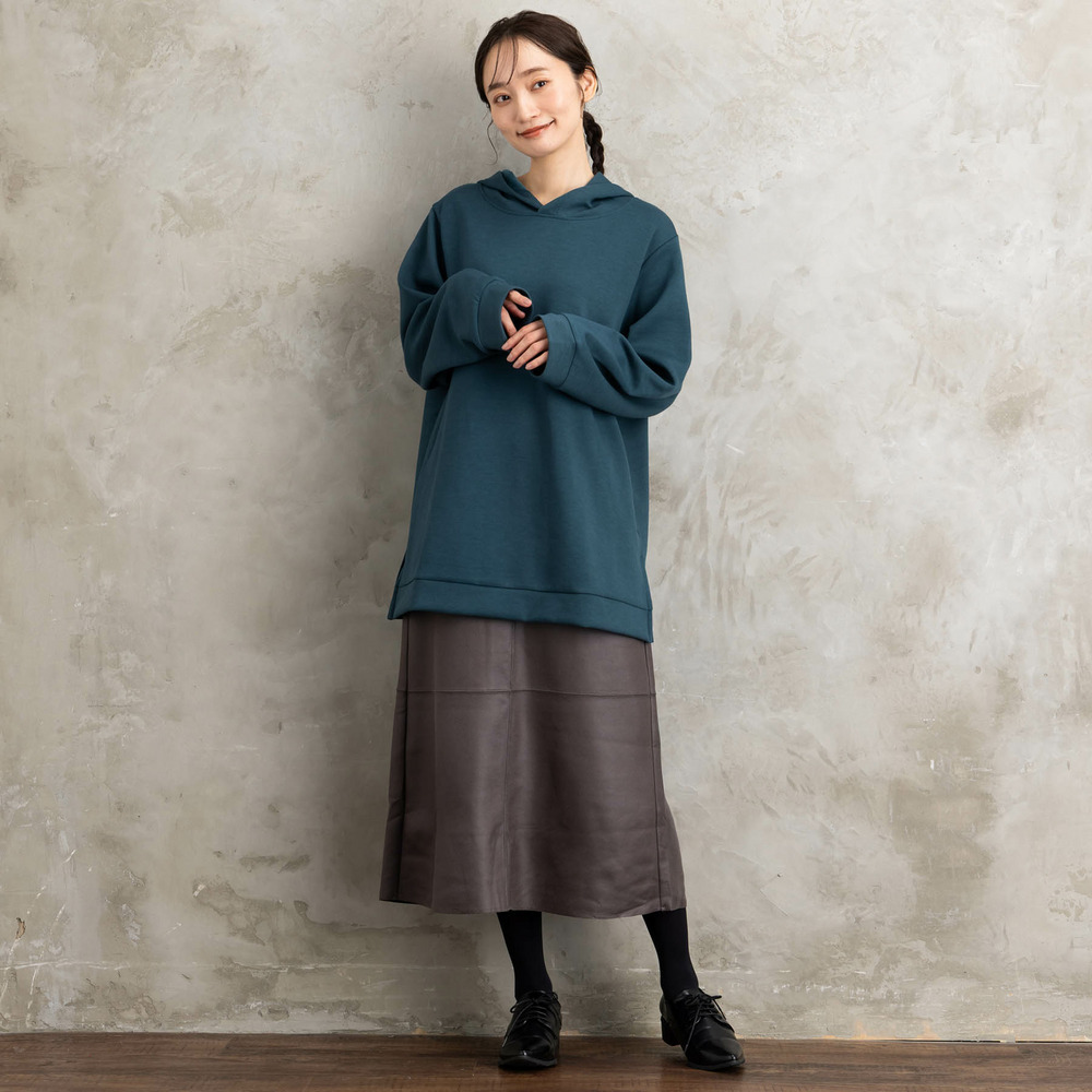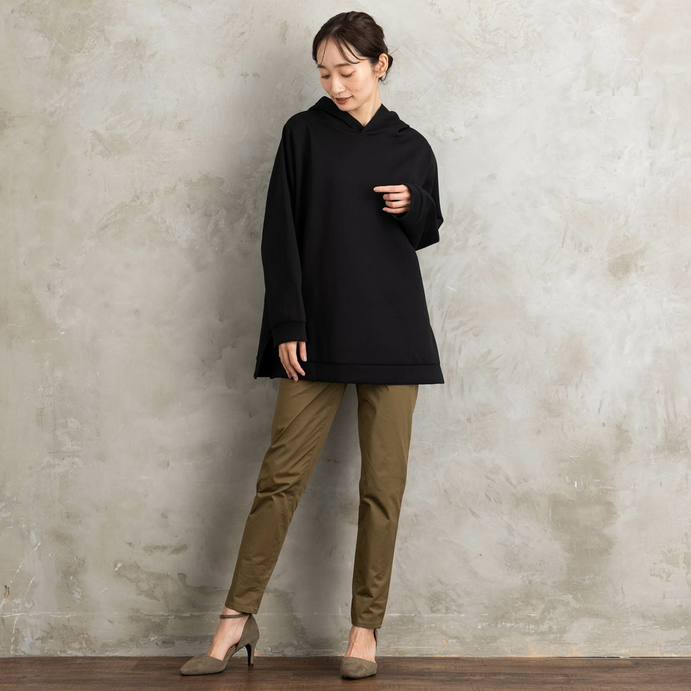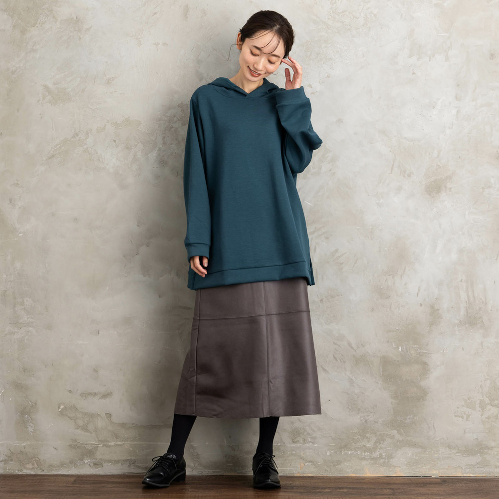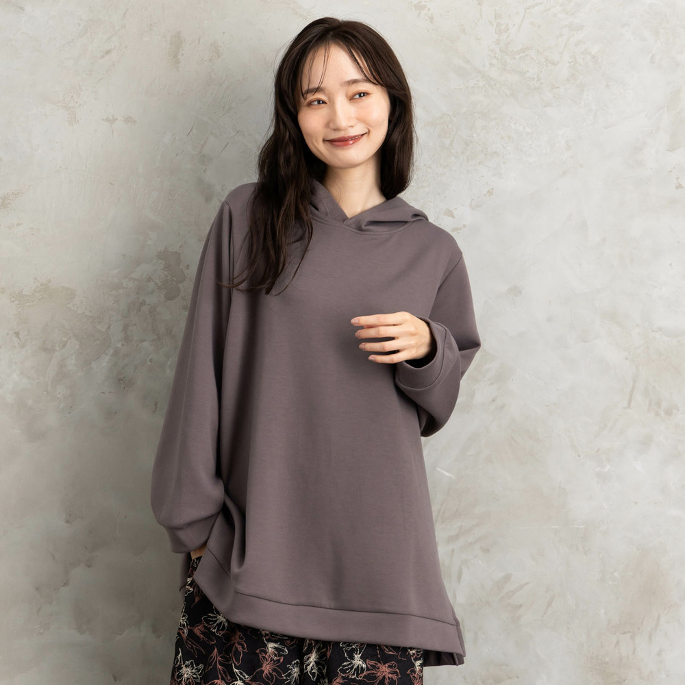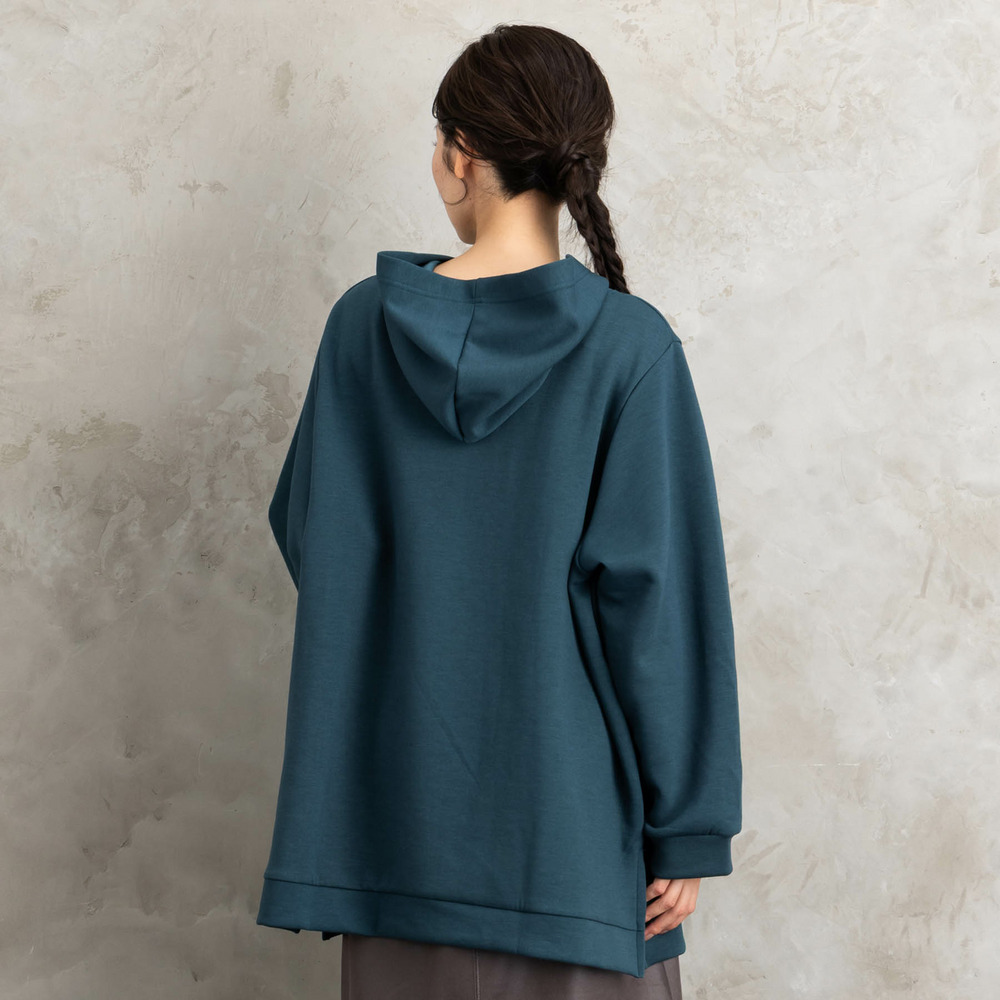 シンプルながらフードデザインがアクセントになり、ラフすぎず品よく着こなせる一枚。