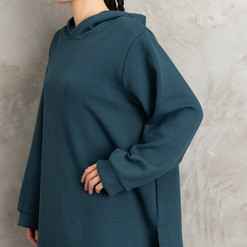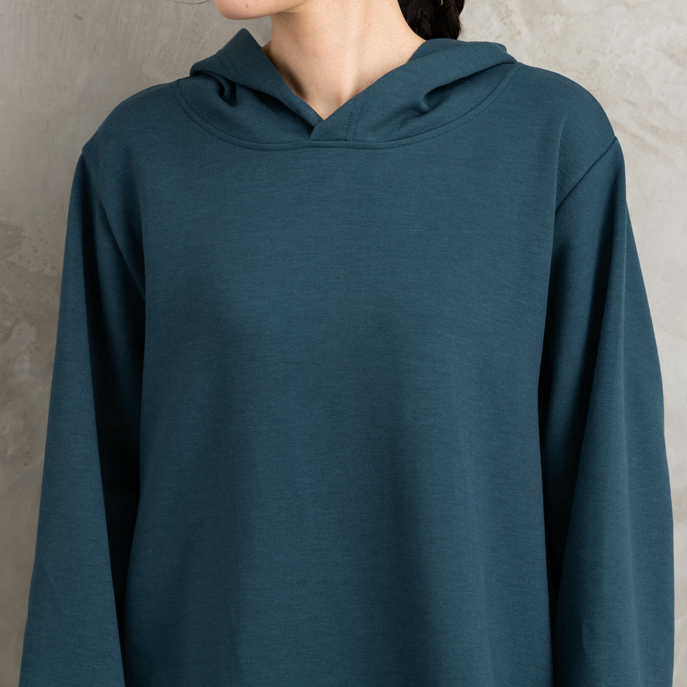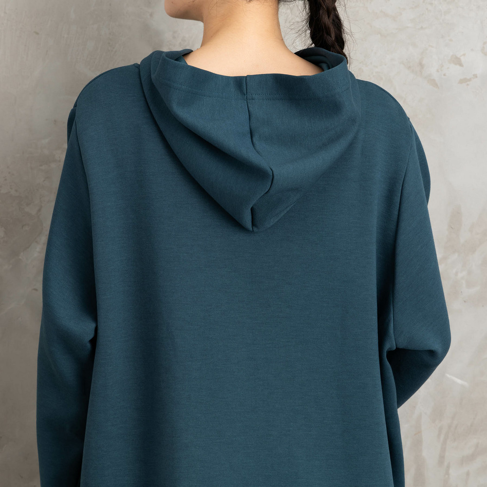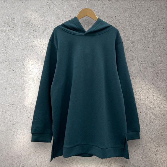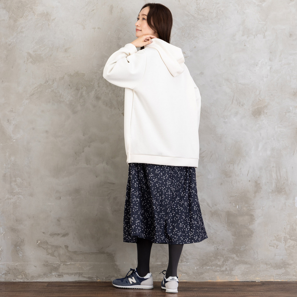 シンプルながらフードデザインがアクセントになり、ラフすぎず品よく着こなせる一枚。