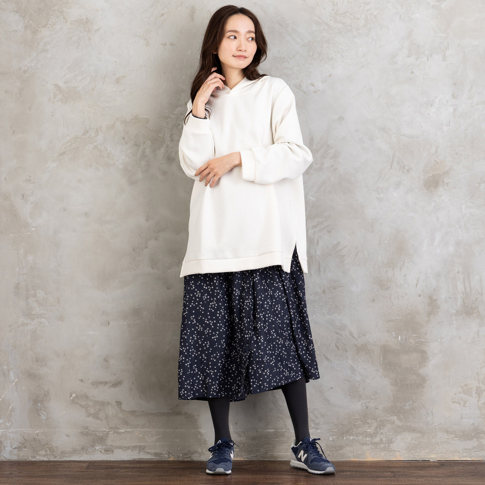 プリーツスカートを合わせれば、女性らしさとカジュアル感を両立。