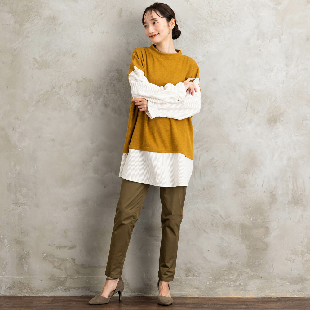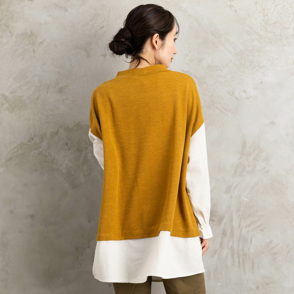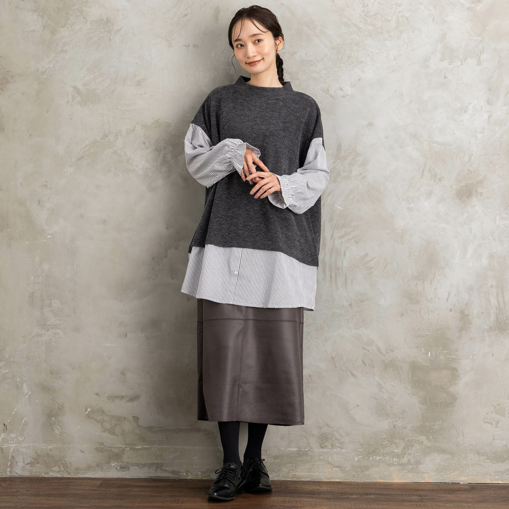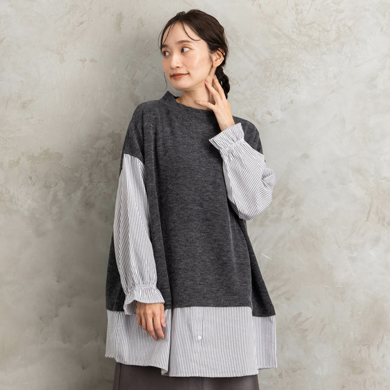ニット×シャツのドッキングデザインで、重ね着したような着映え感を演出。