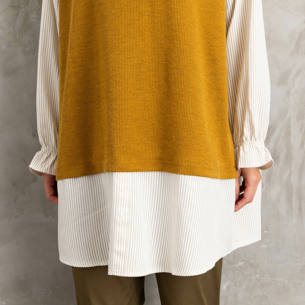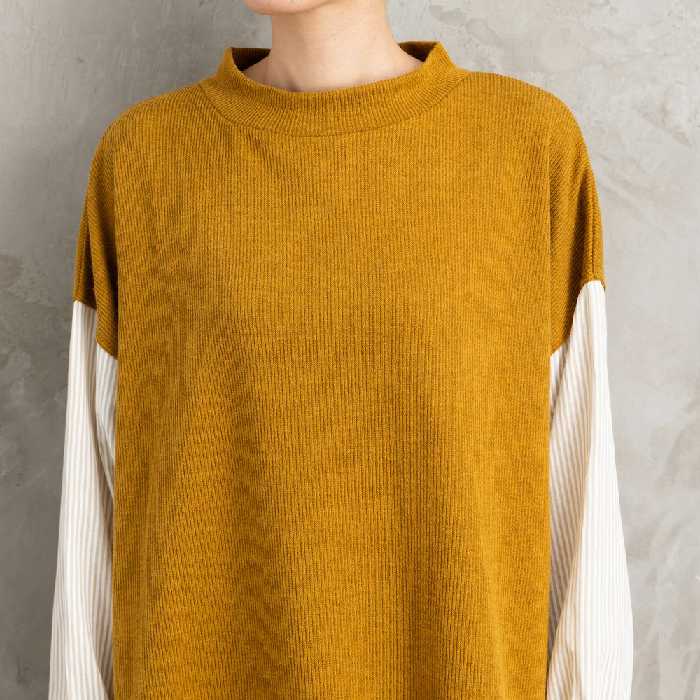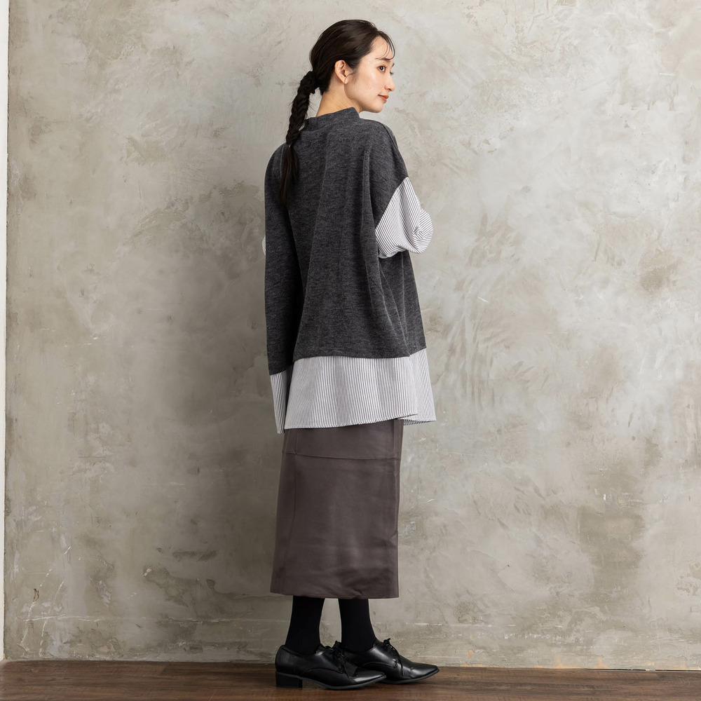 ニット×シャツのドッキングデザインで、重ね着したような着映え感を演出。
