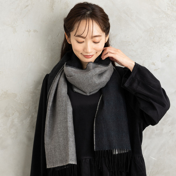 なめらかな肌触りで首元を優しく包み込むリバーシブルストール。