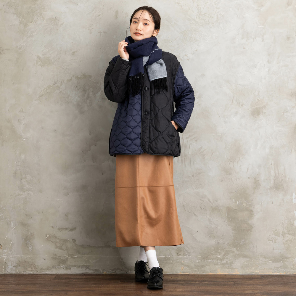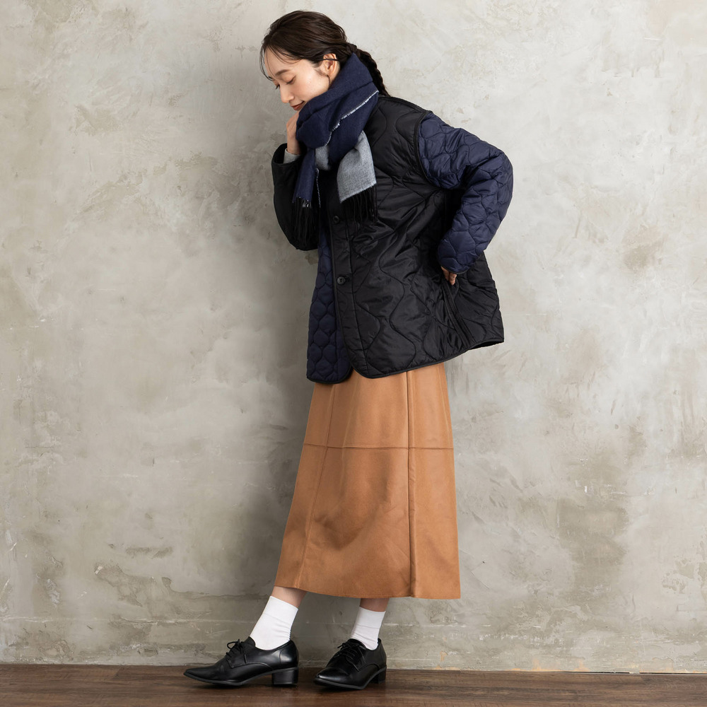 無地のスタイリングに加えれば、リバーシブルならではの配色がポイントに。