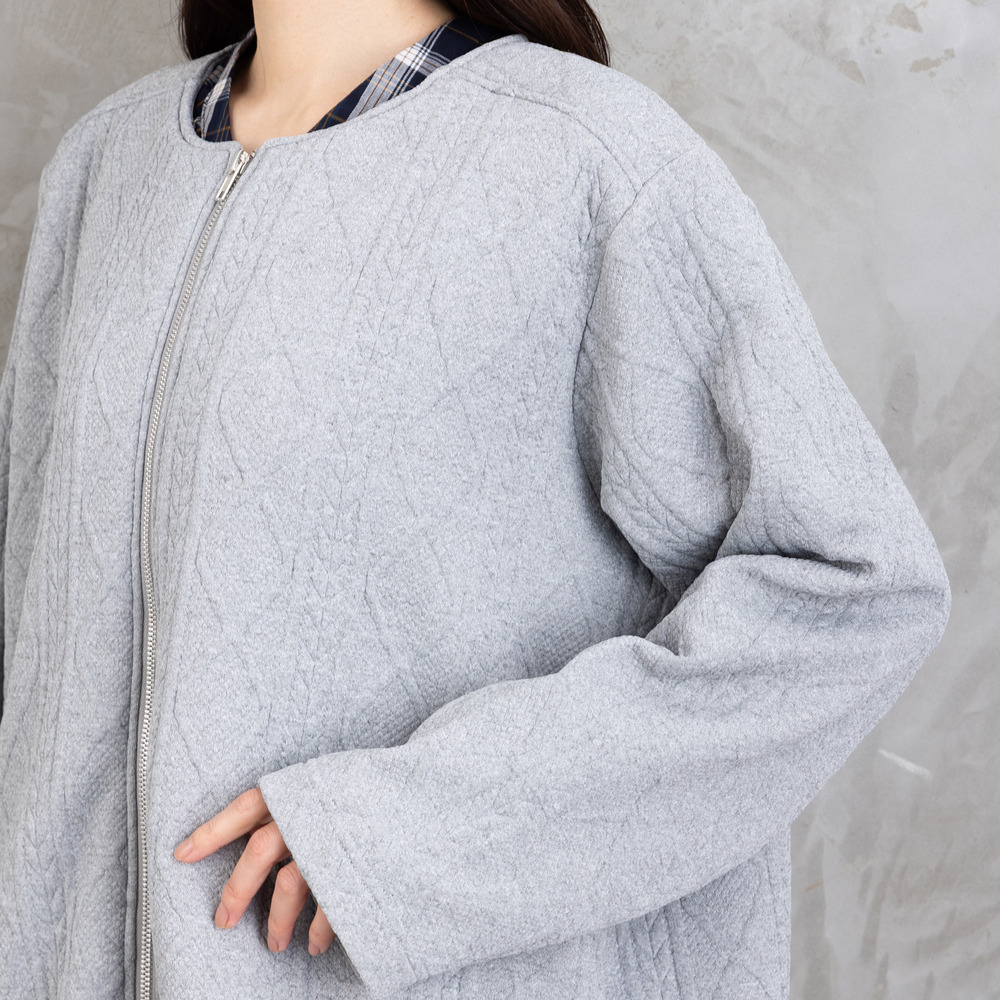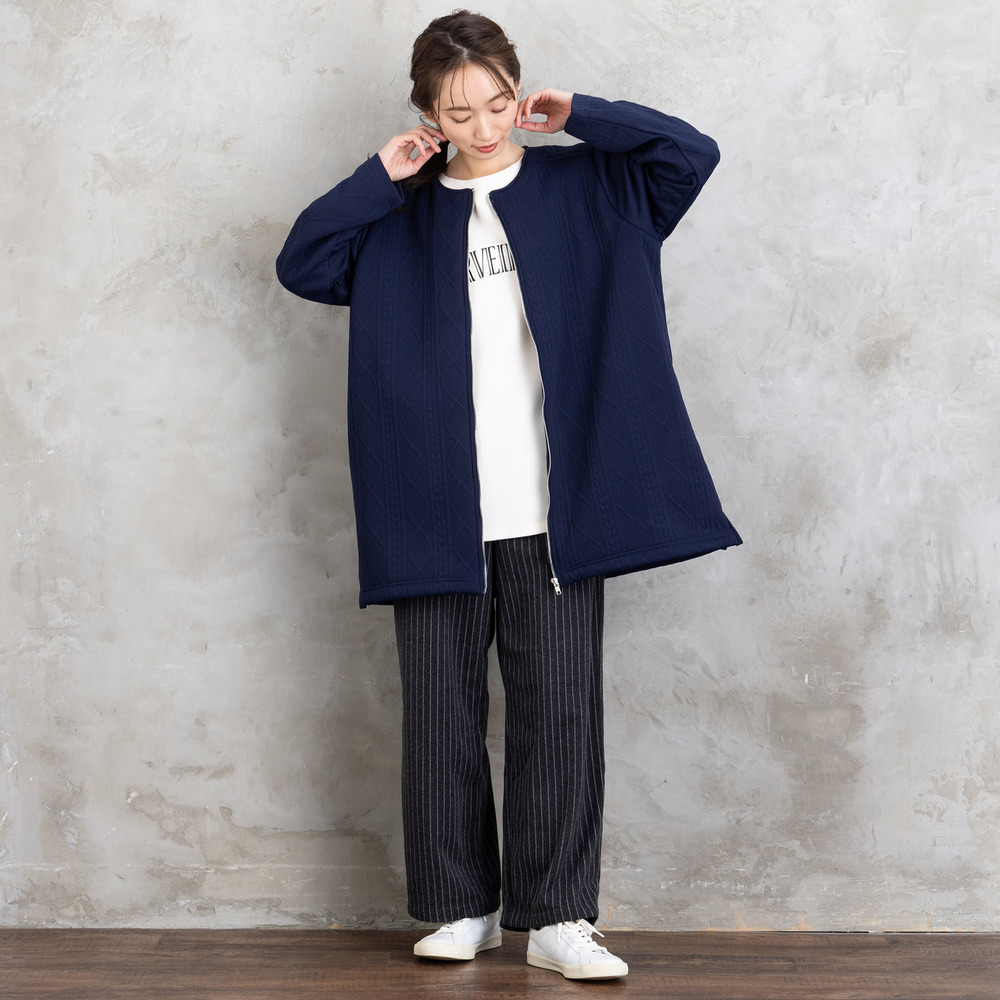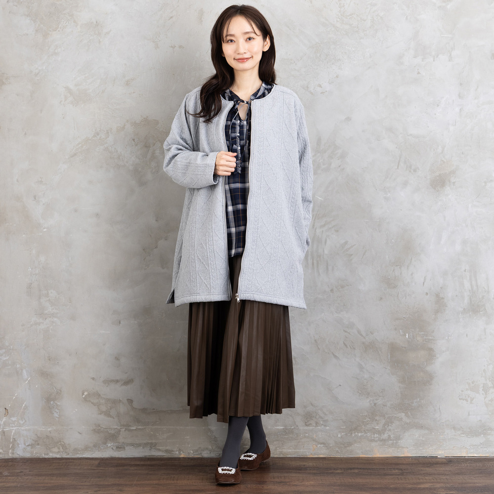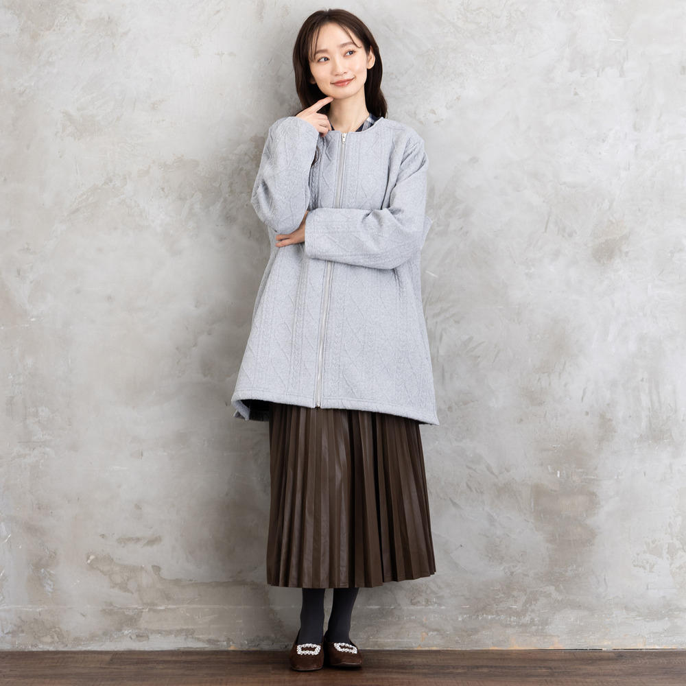 ふっくらとしたジャガード素材が上品な印象を与えるショートコート。