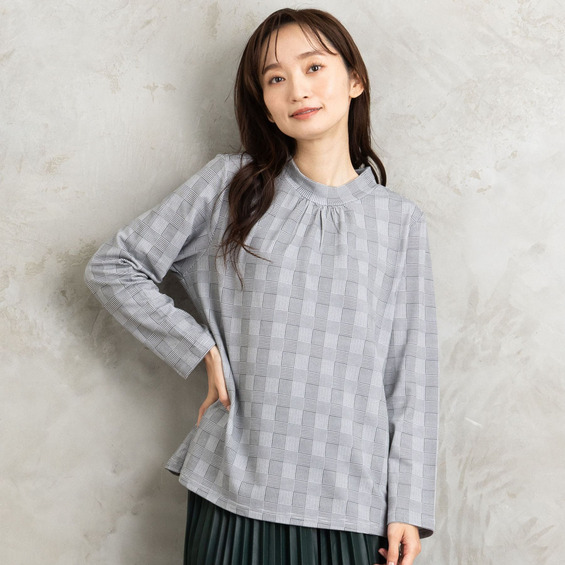 モックネックデザインが首元をすっきり見せつつ、着こなしに上品さをプラスします。