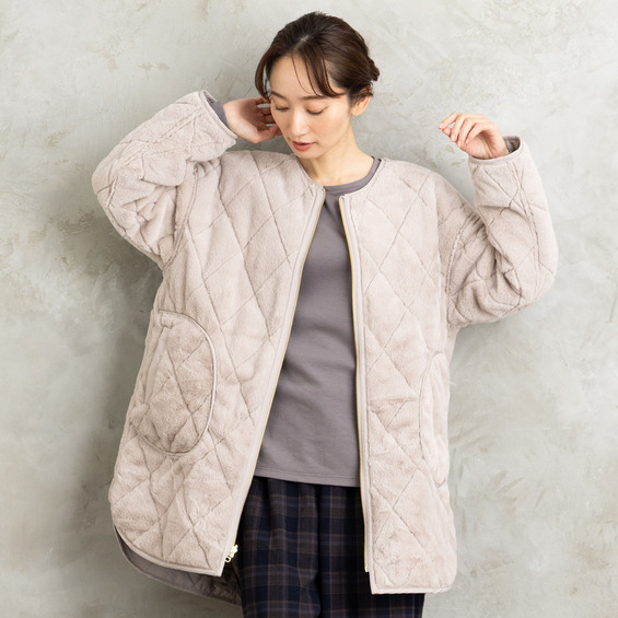 ふんわりとしたファー面と、すっきり見えするキルティング面の2WAY仕様。