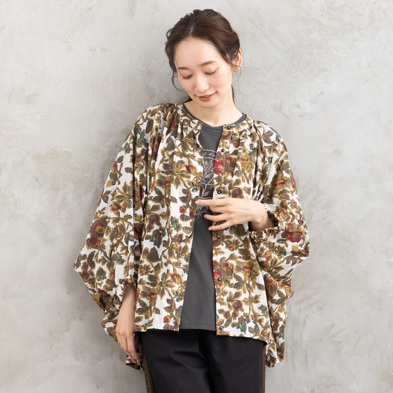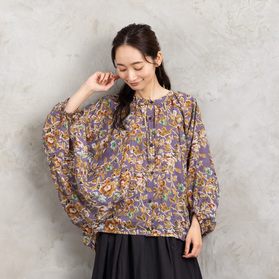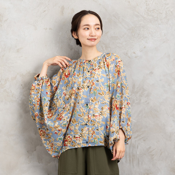 ・デザインポイント:クラシカルなフラワープリント、ギャザー入りネック、袖口タック