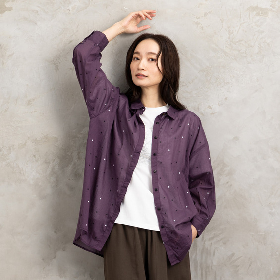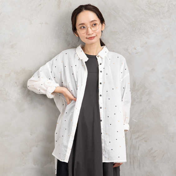 ランダムに配された小さなドットが、シンプルなグレートーンにさりげない遊び心を添えるロングシャツブラウス。