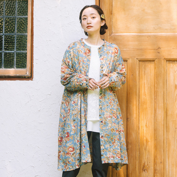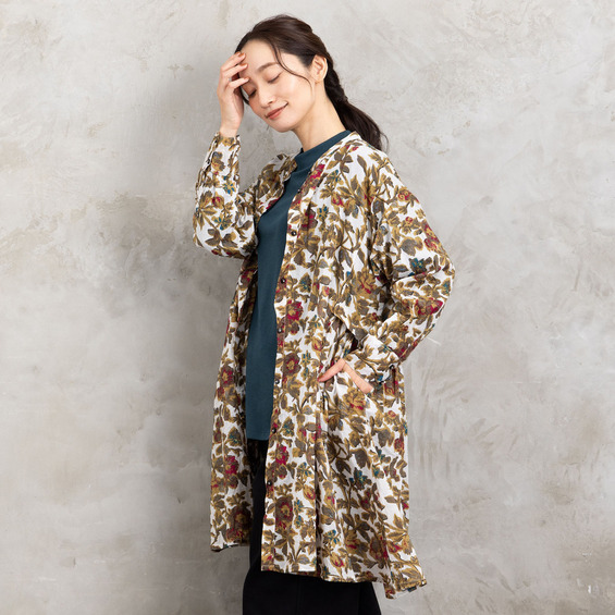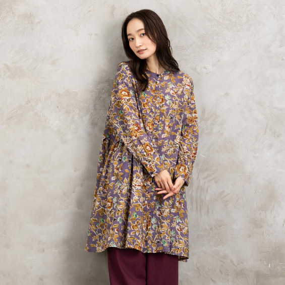 ・デザインポイント:落ち着いたカラーの花柄、バンドカラー、両サイドのギャザー切り替え
