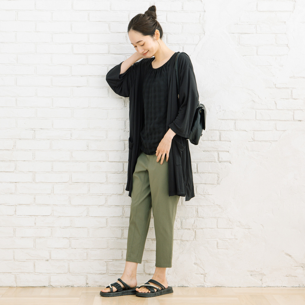 体のラインを拾いにくいゆったりシルエットで、抜け感のある着こなしに。