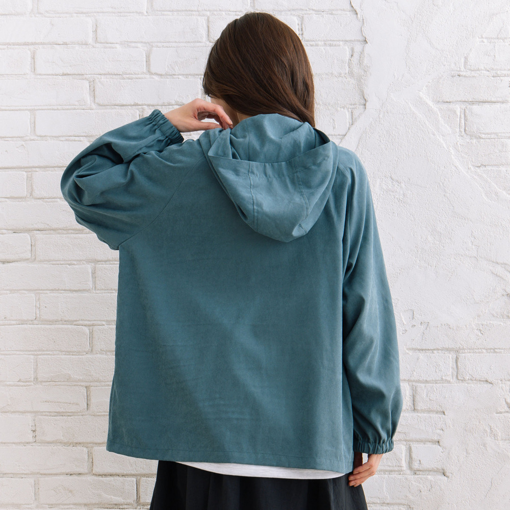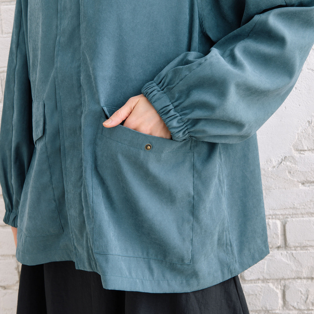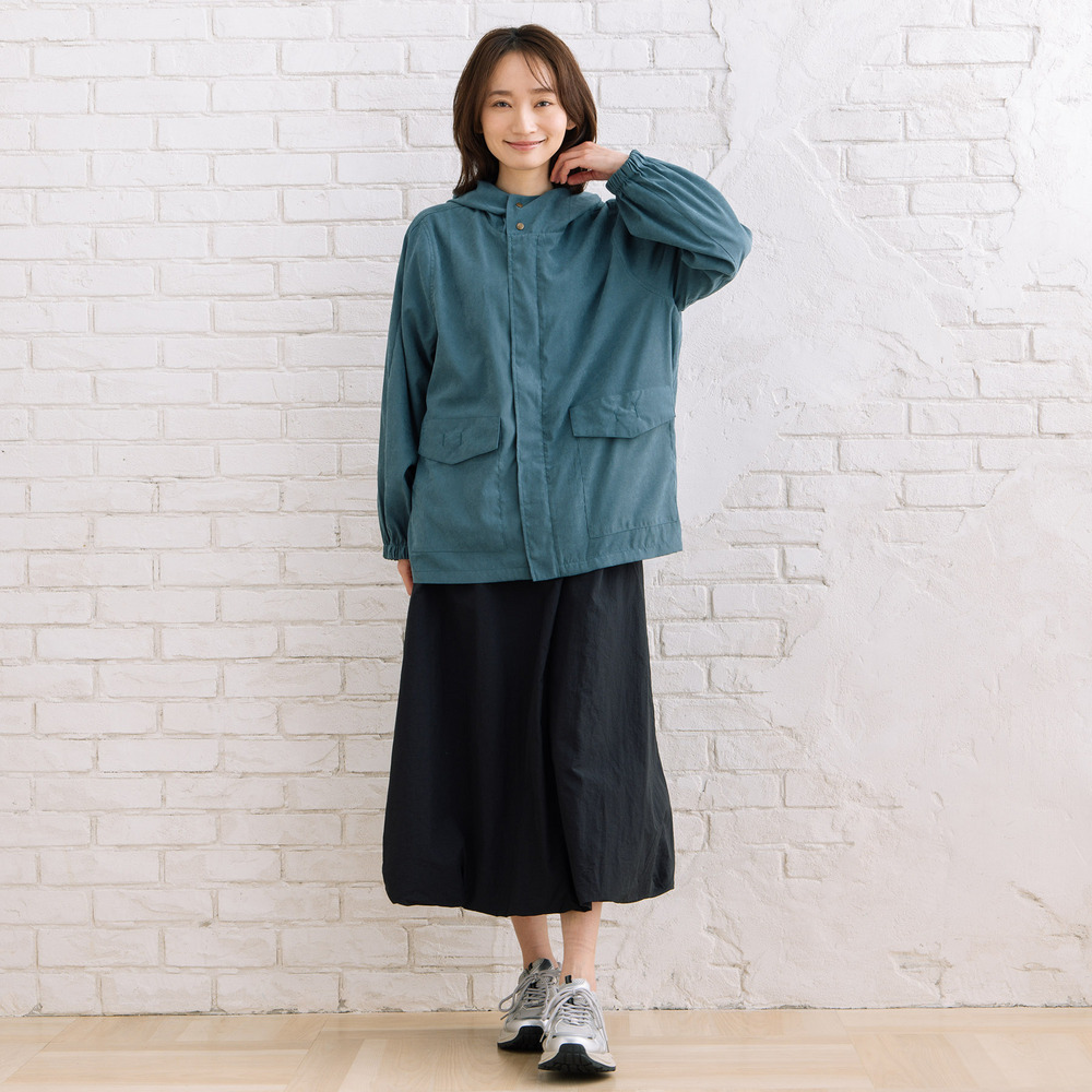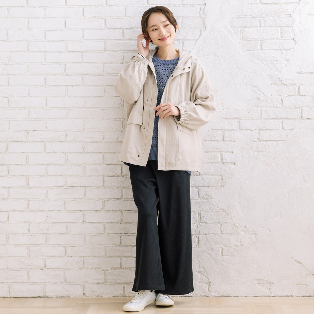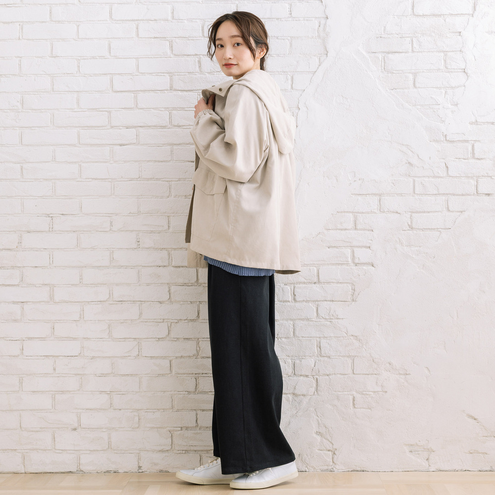 フラップデザインがさりげないアクセントになり、シンプルながらも表情のある一着です。