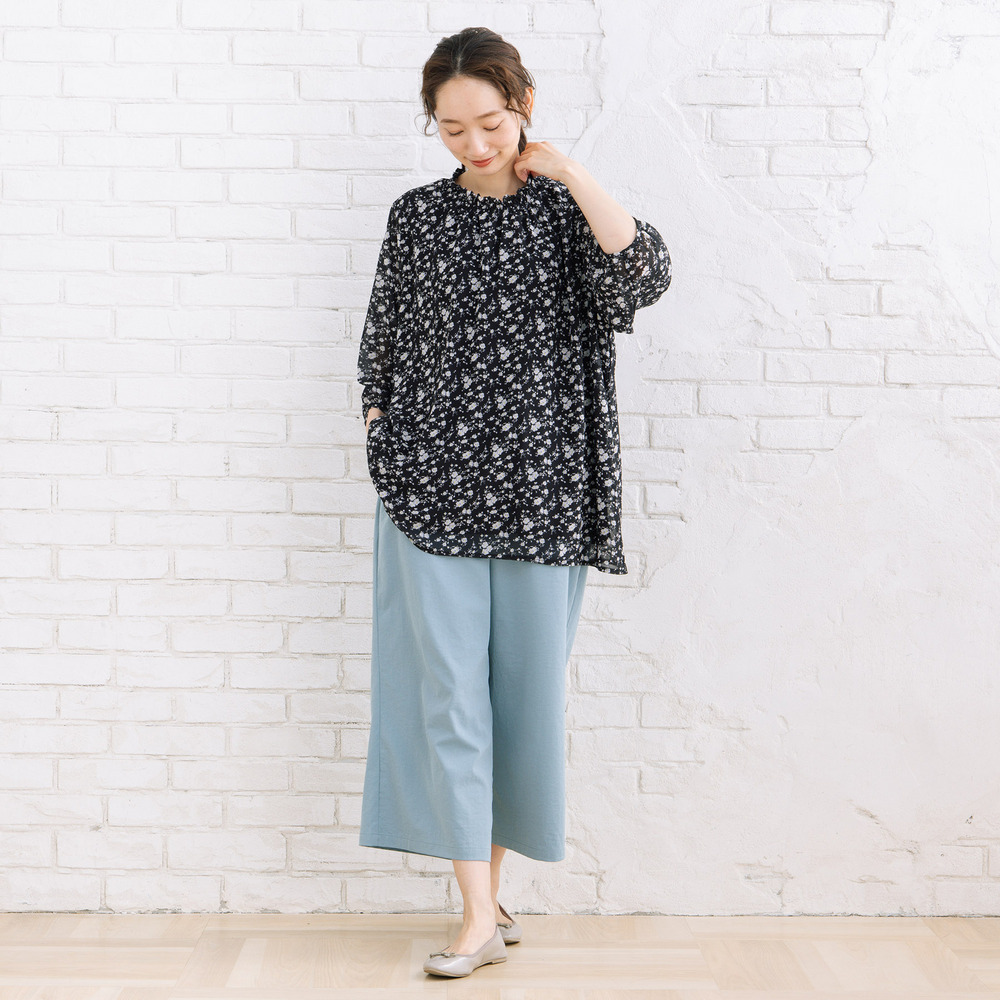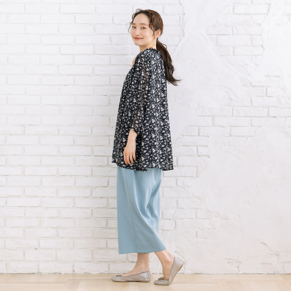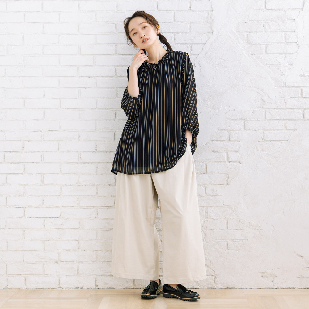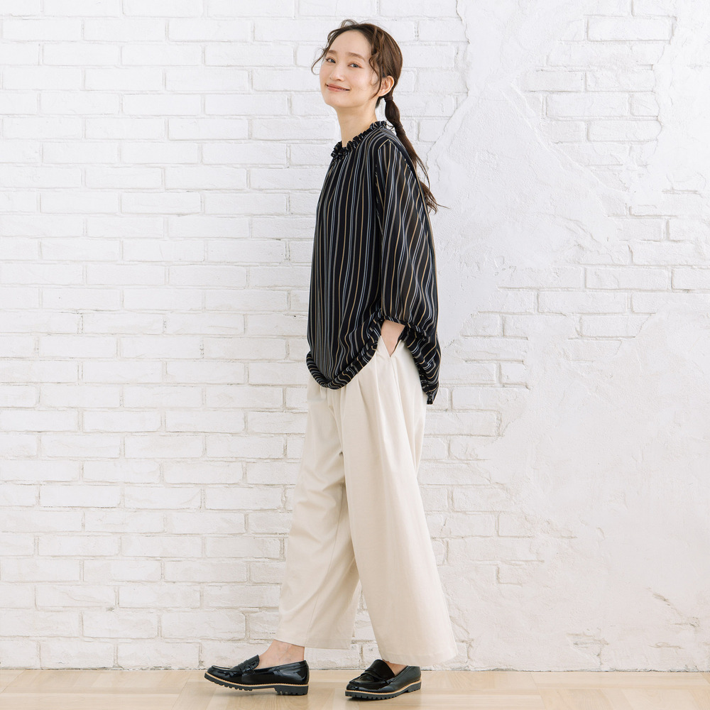 軽やかな素材感と落ち感のあるシルエットで、動くたびに柔らかな印象を演出します。
