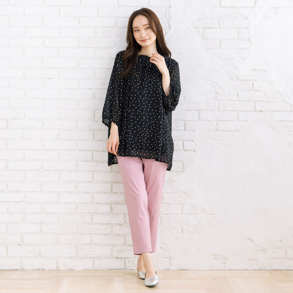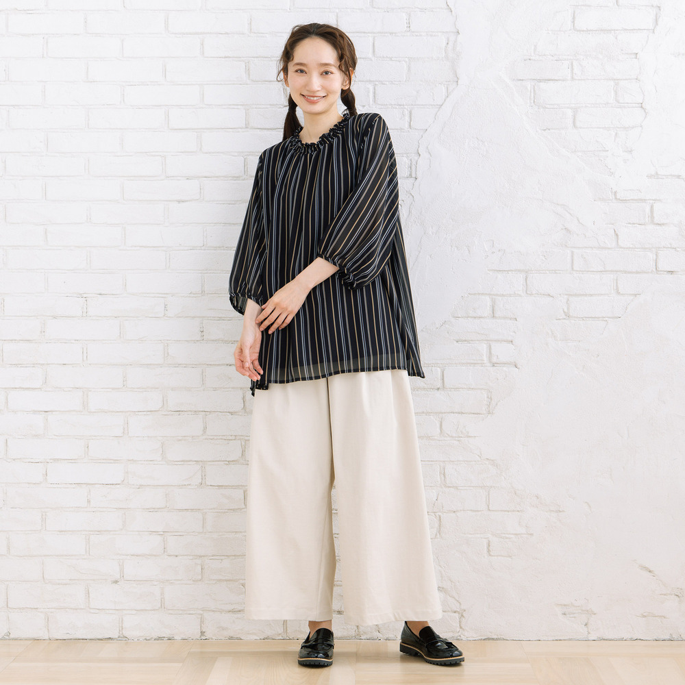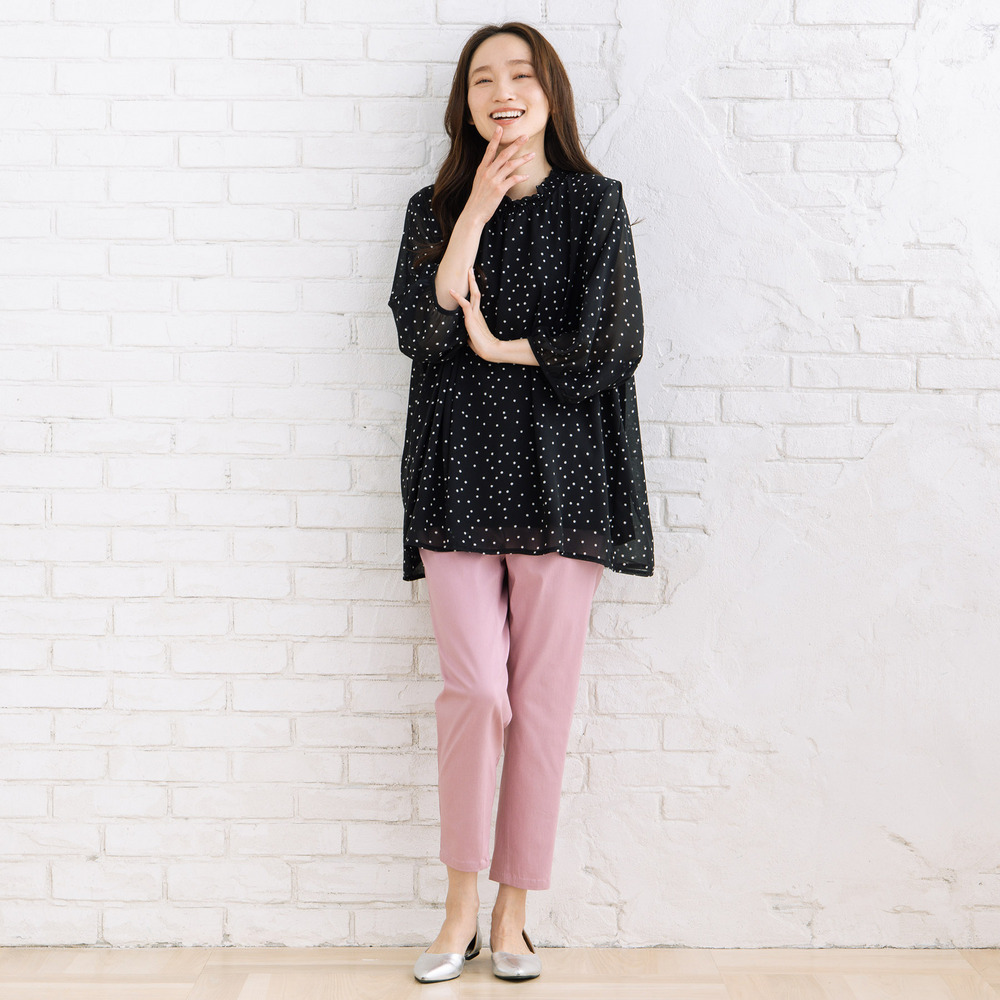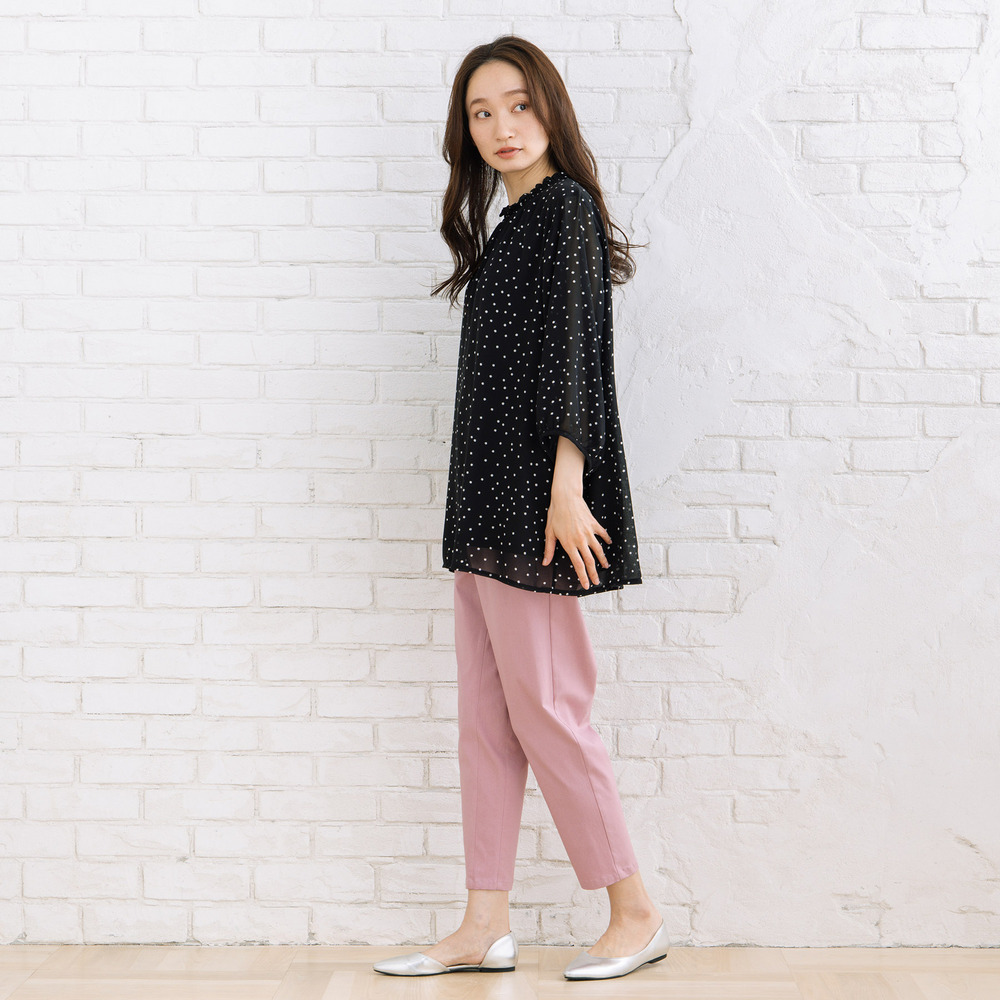 軽やかな素材感と落ち感のあるシルエットで、動くたびに柔らかな印象を演出します。