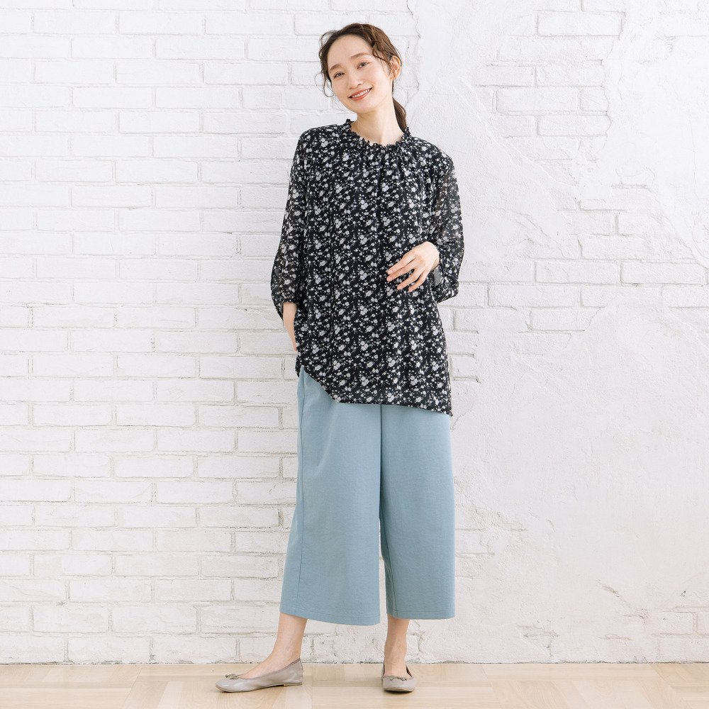 異なる柄を組み合わせたアソートプリントが、着こなしにさりげない個性を添えるシフォンブラウス。