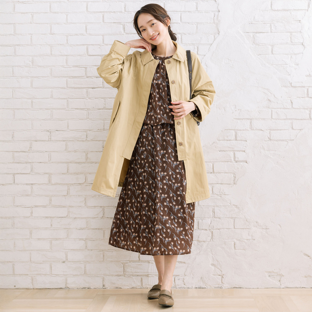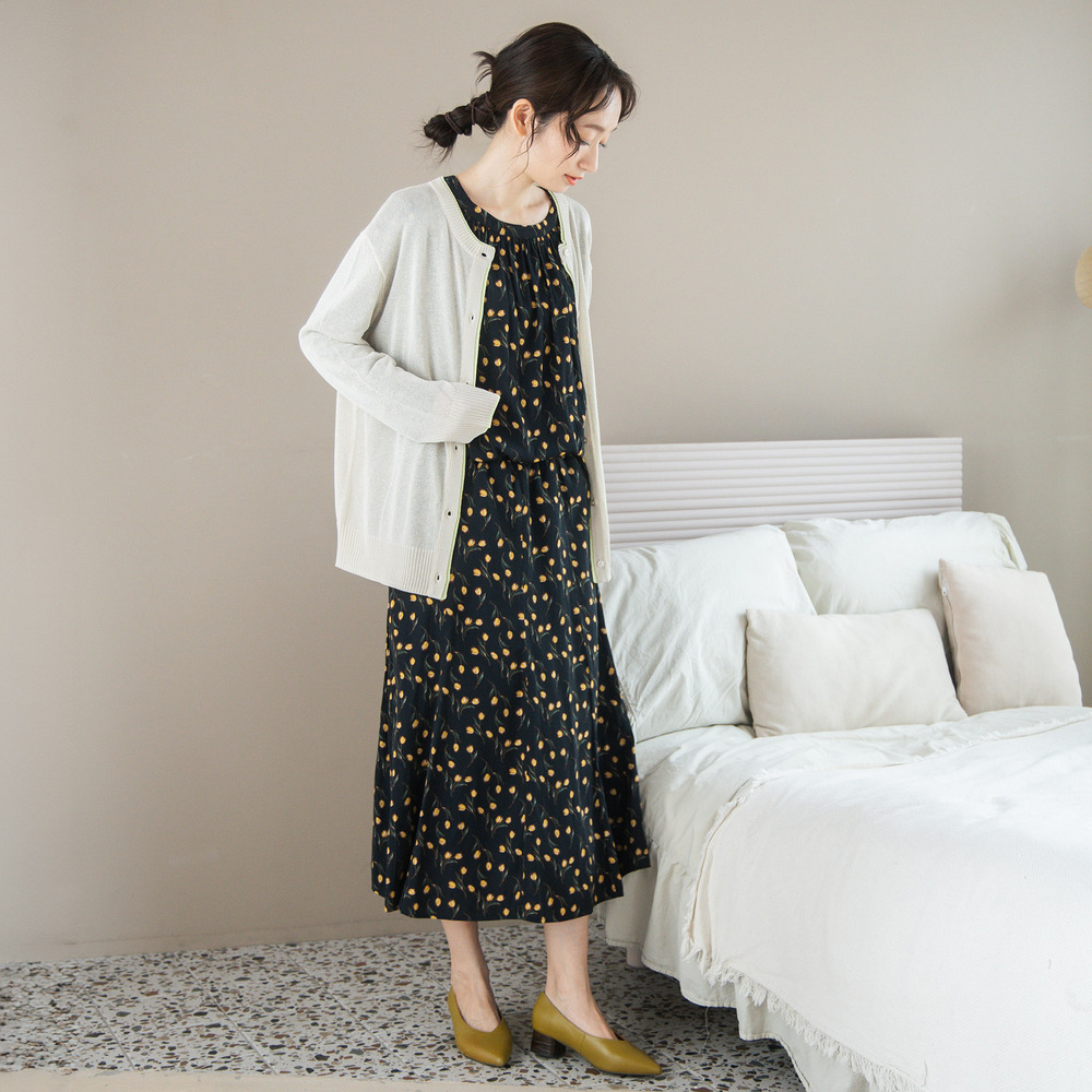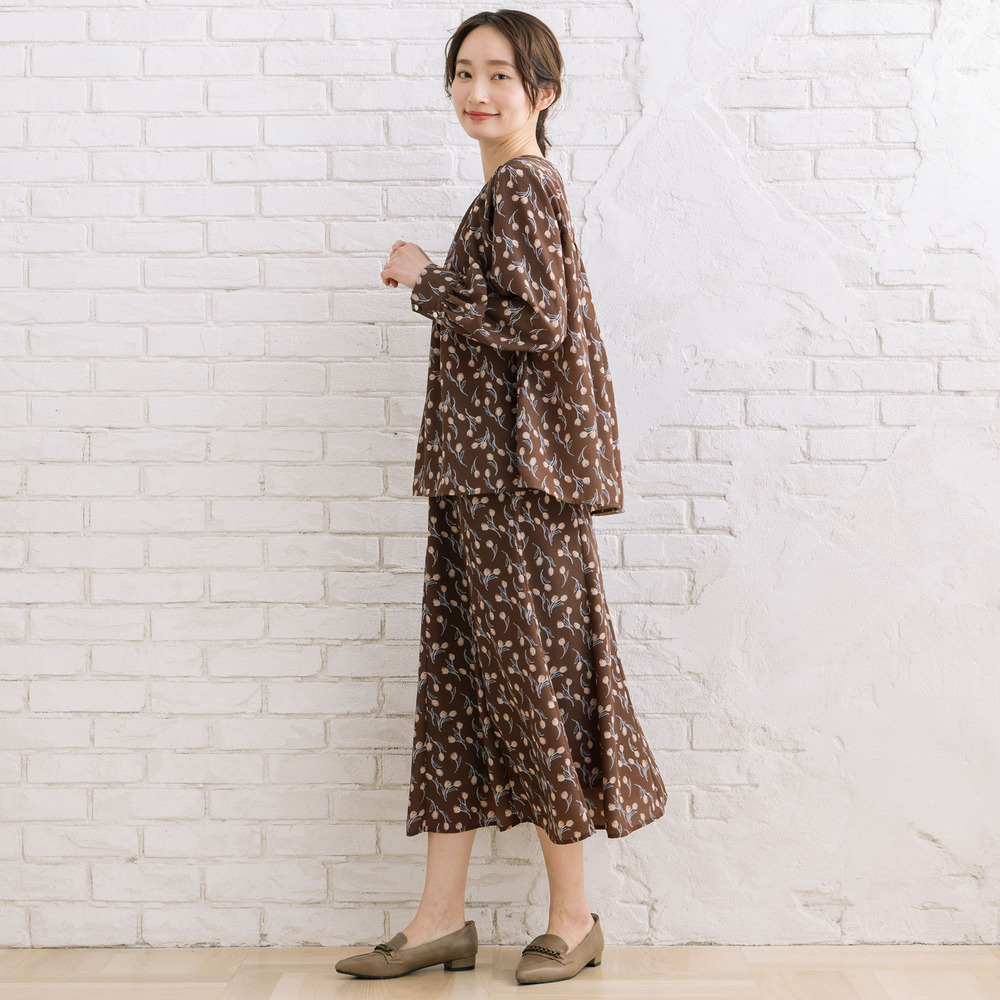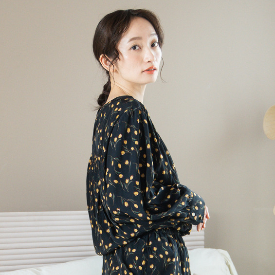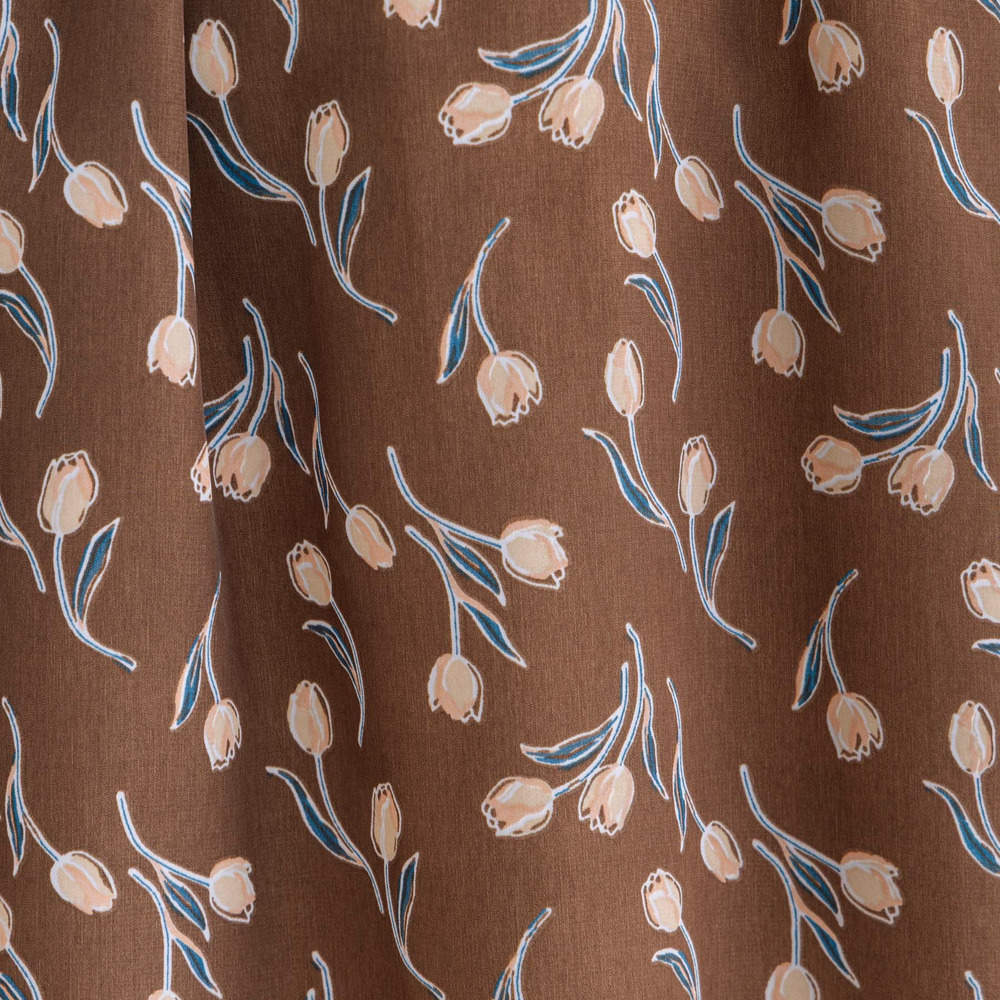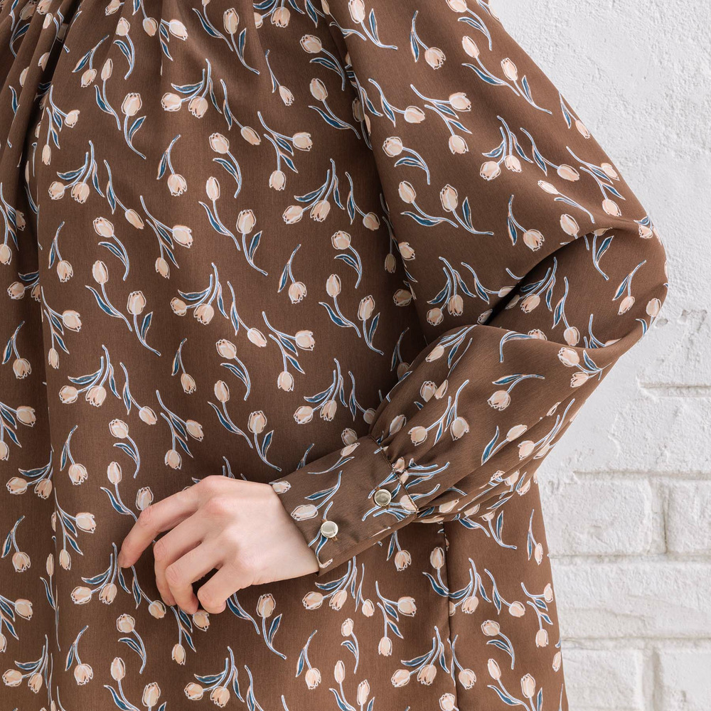 チューリップモチーフを散りばめたプリントが、さりげなく華やかな印象に。