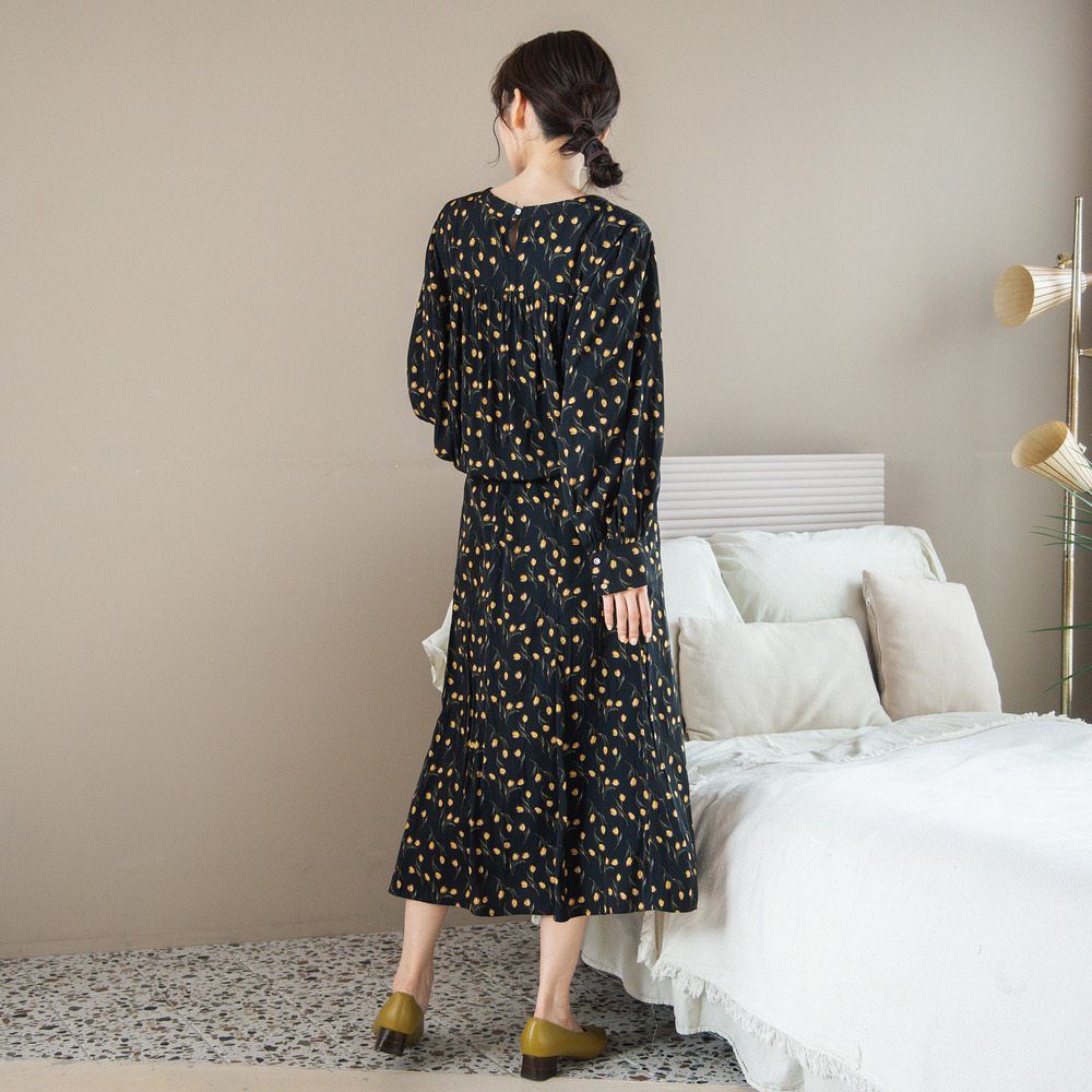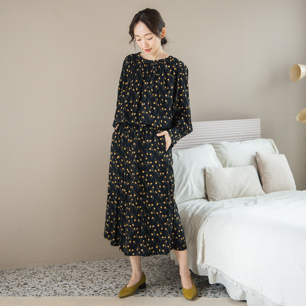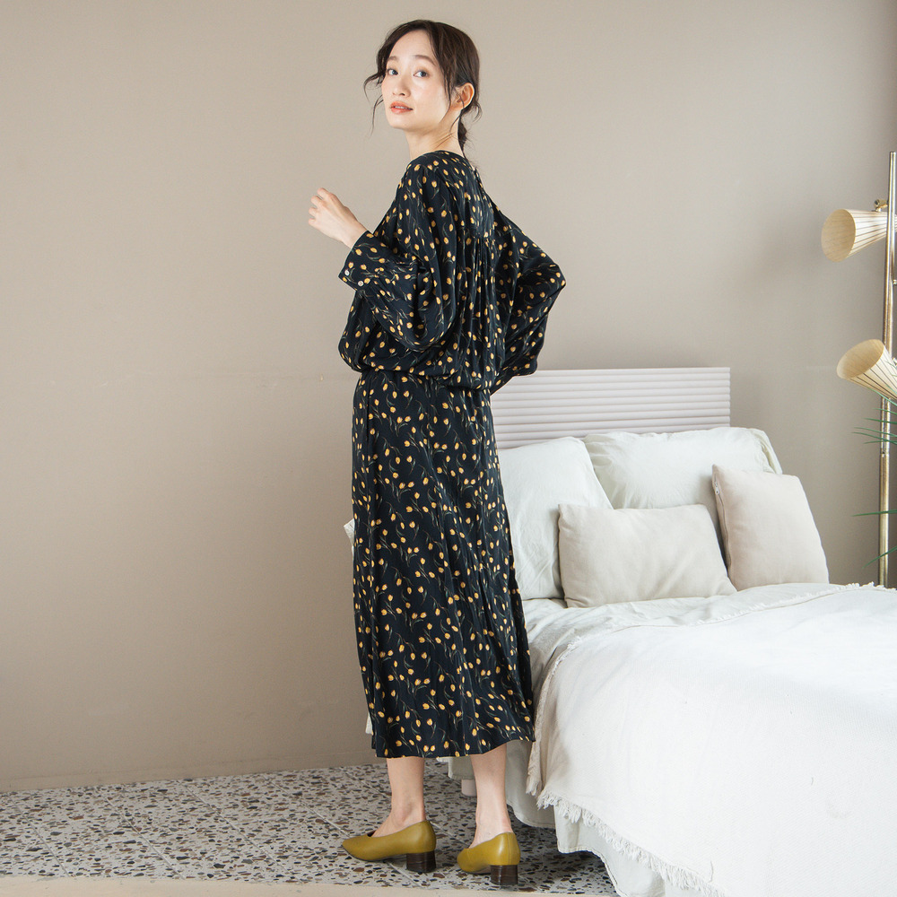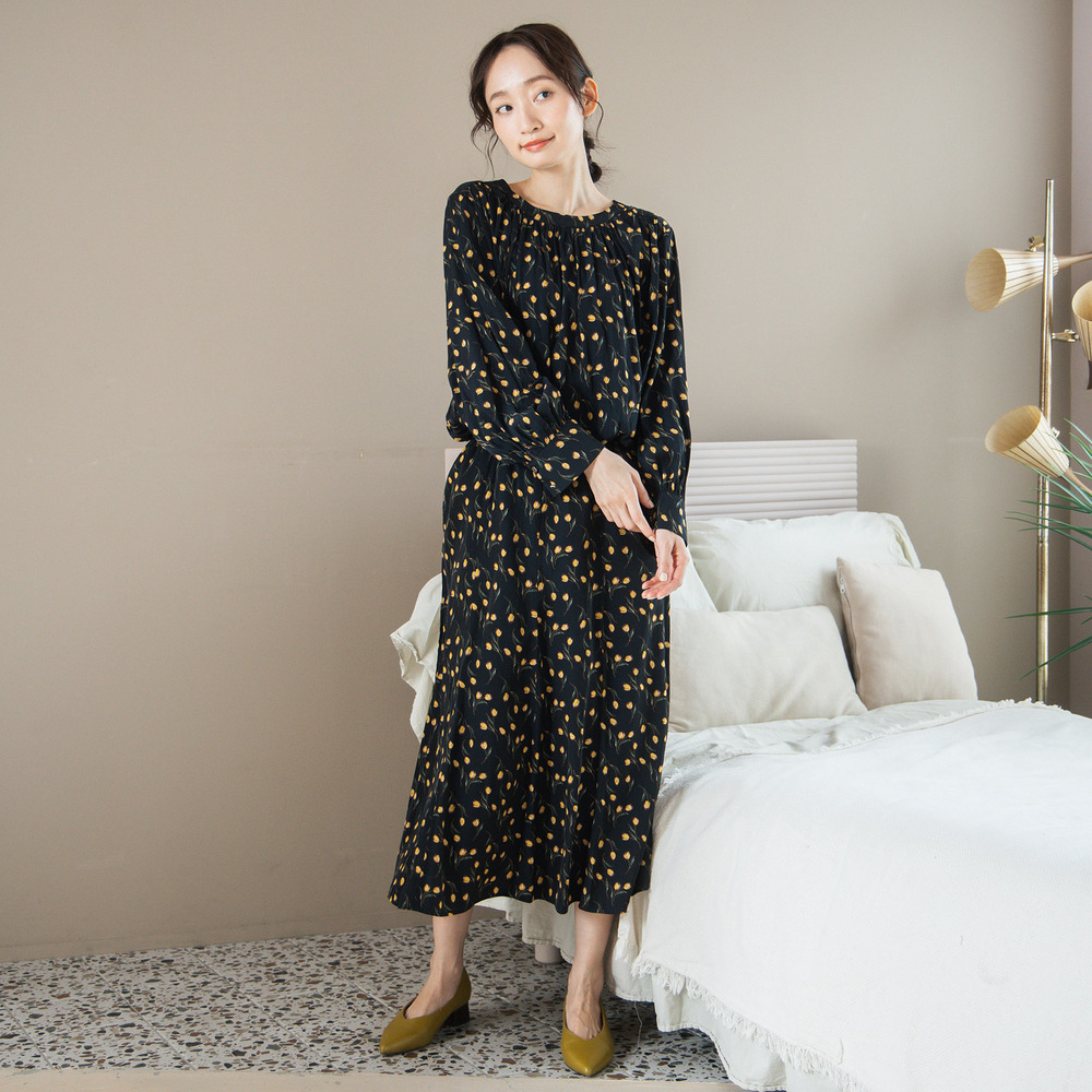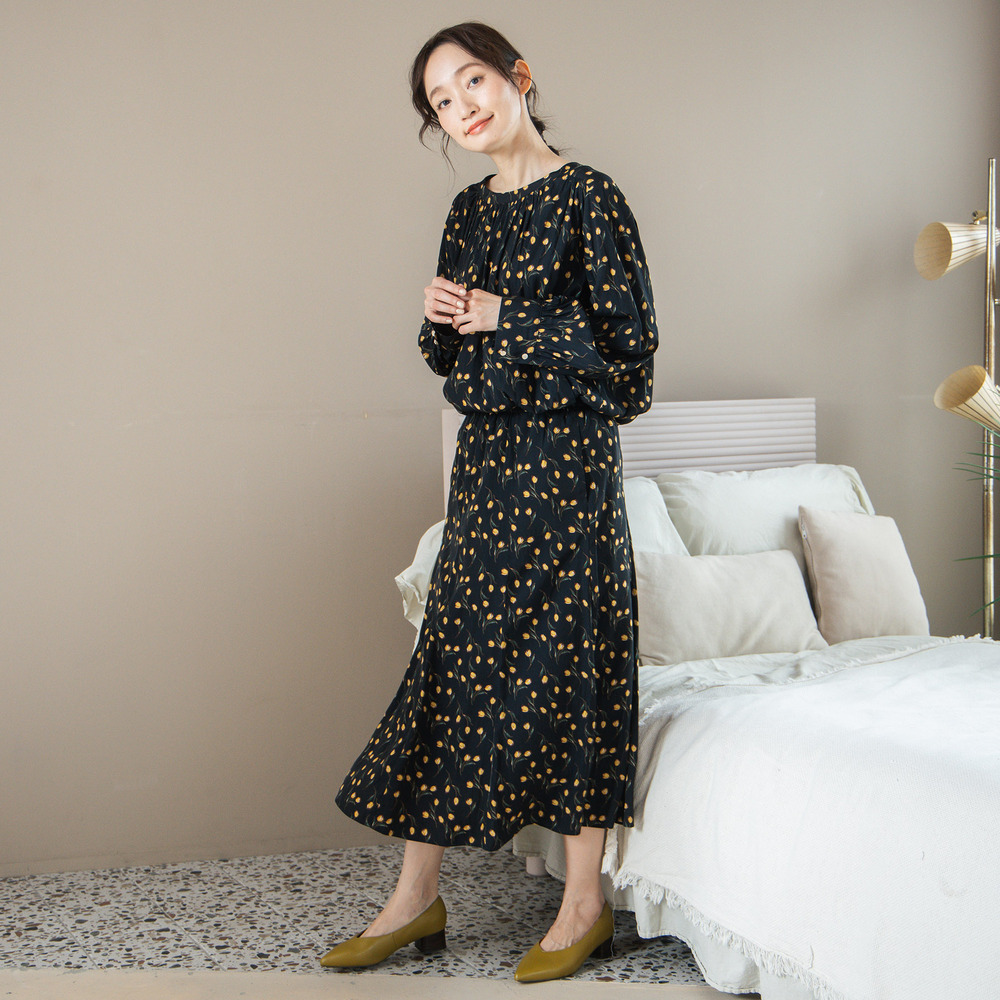 チューリップモチーフを散りばめたプリントが、さりげなく華やかな印象に。
