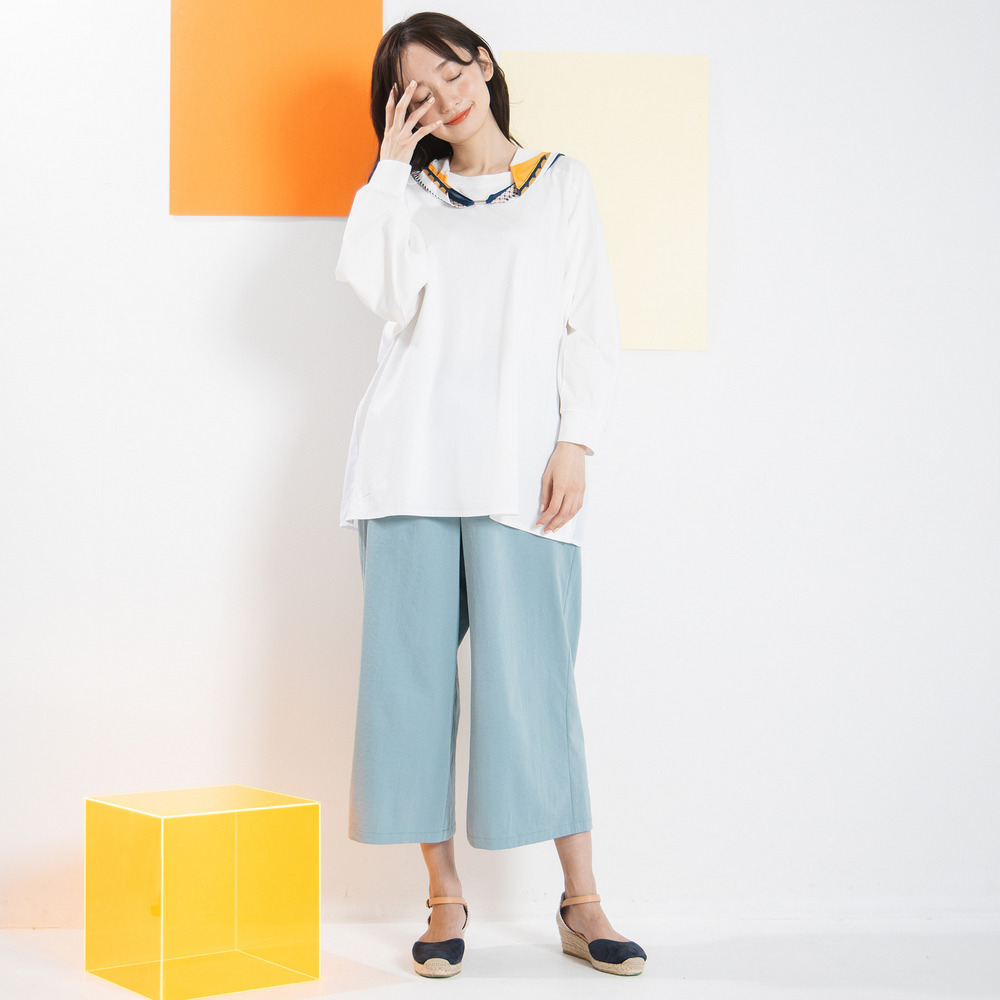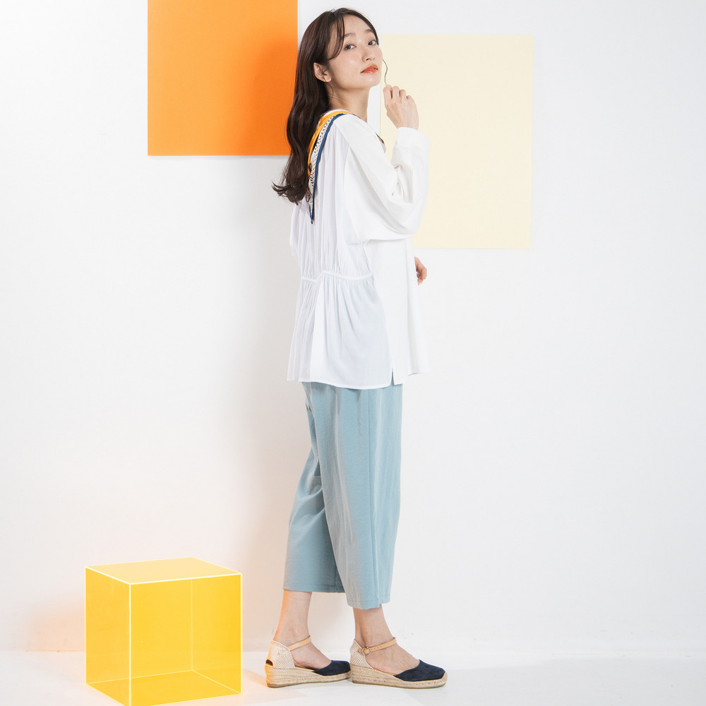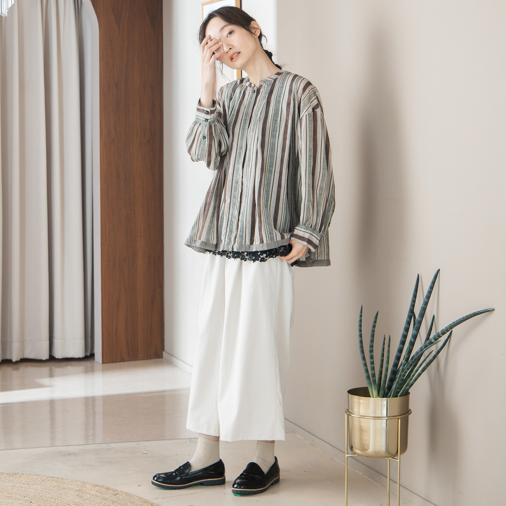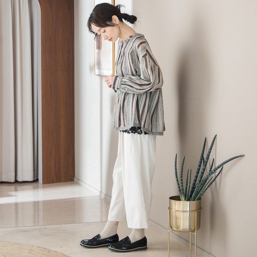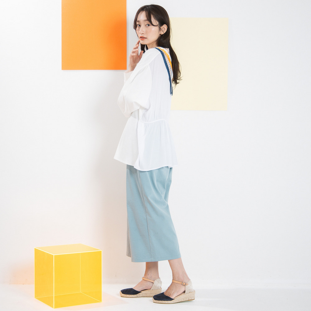 シンプルなカットソーやブラウスを合わせて、すっきりと。