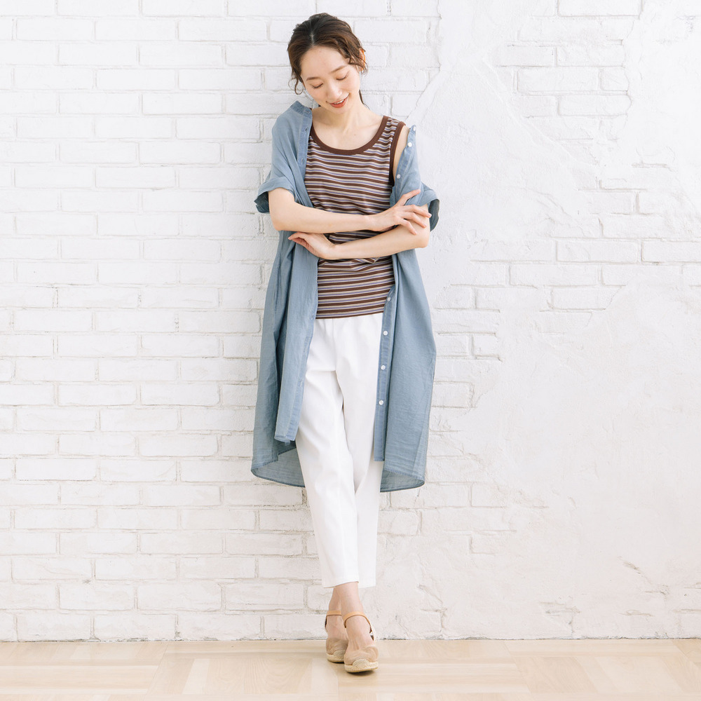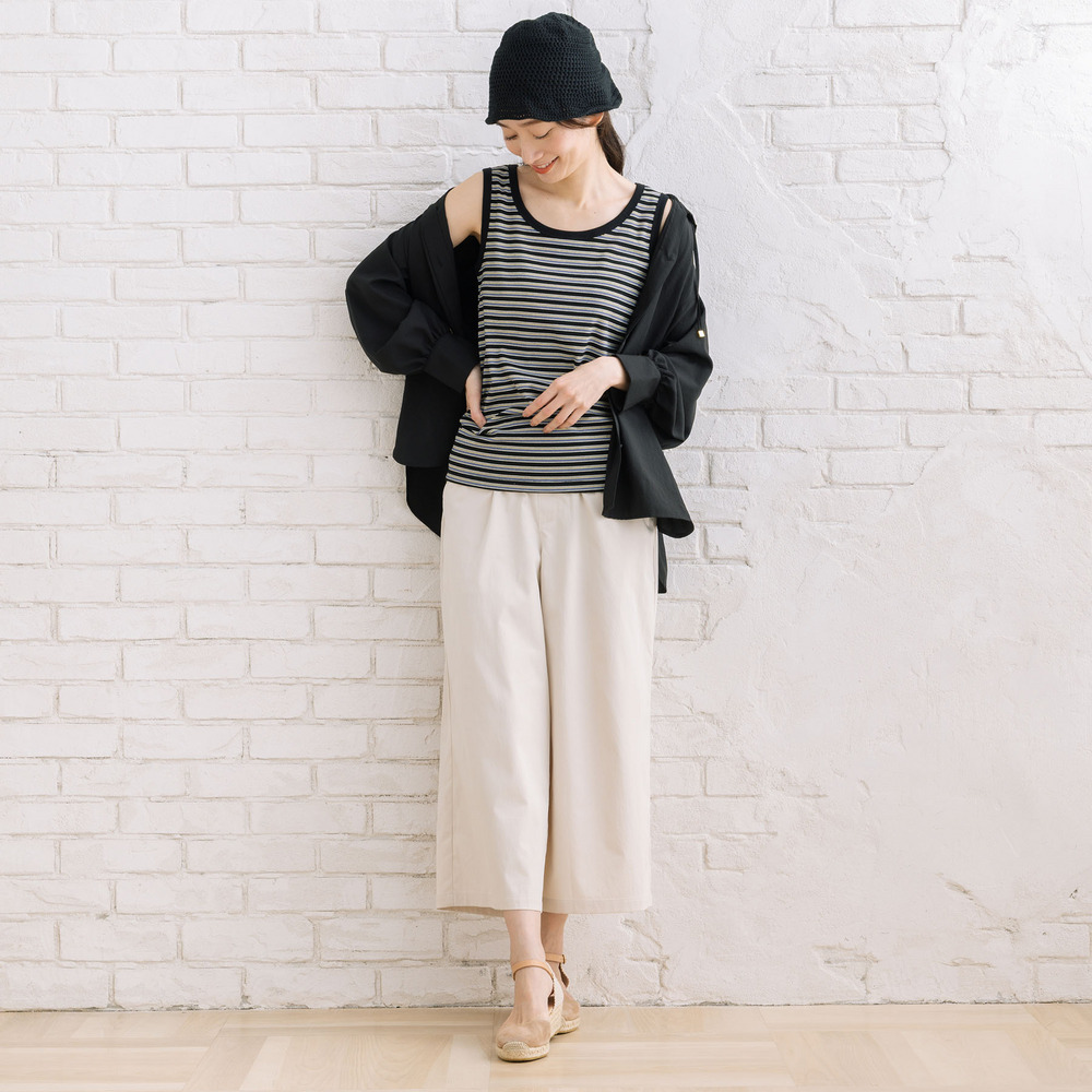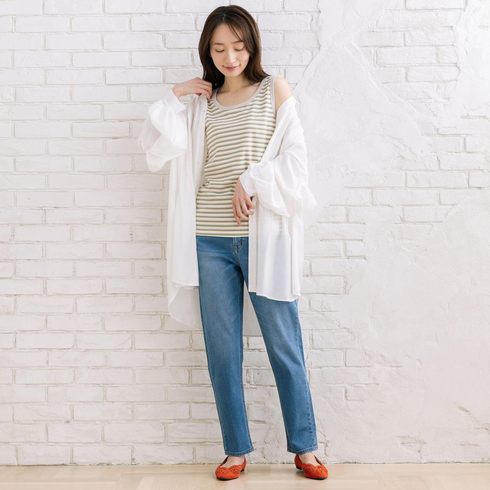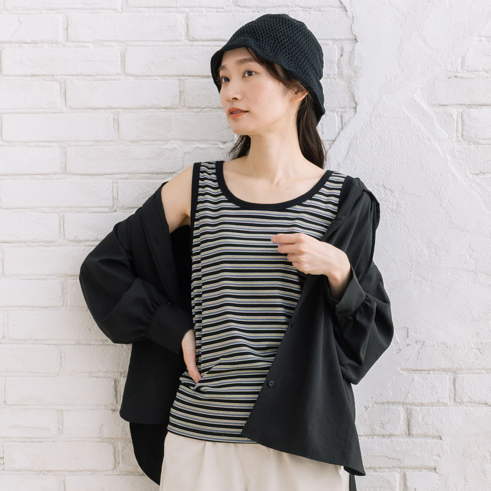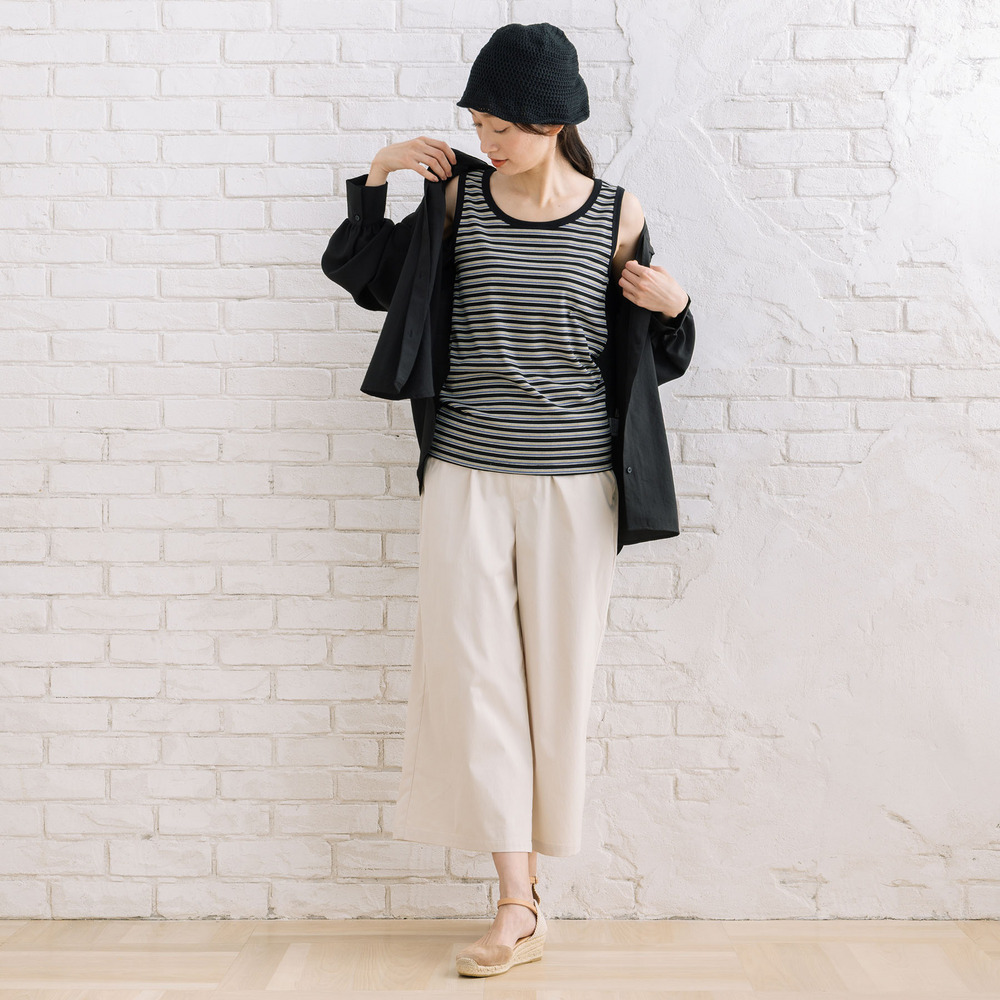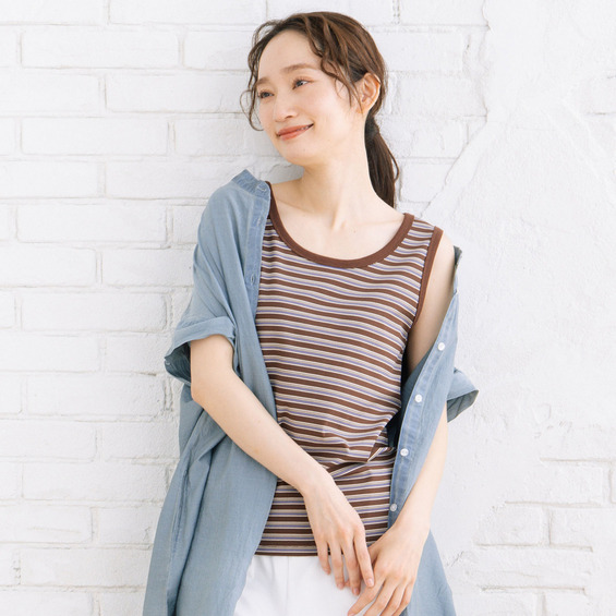 【着回し力の高い定番アイテム、ボーダーテレコタンクトップ】