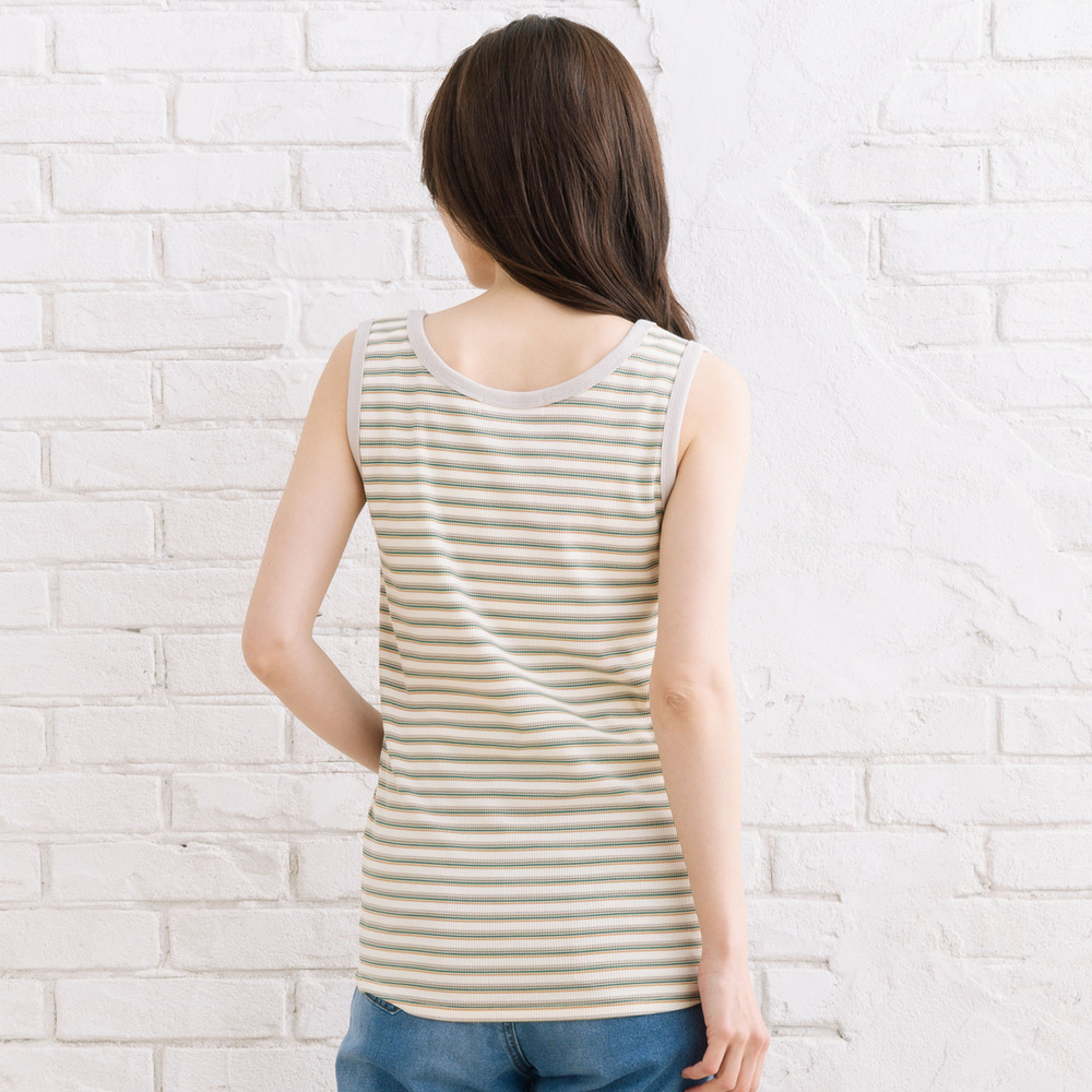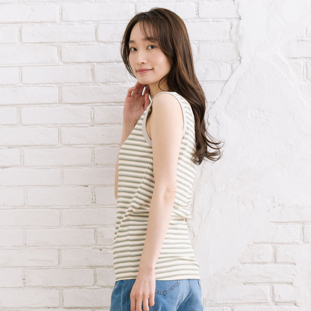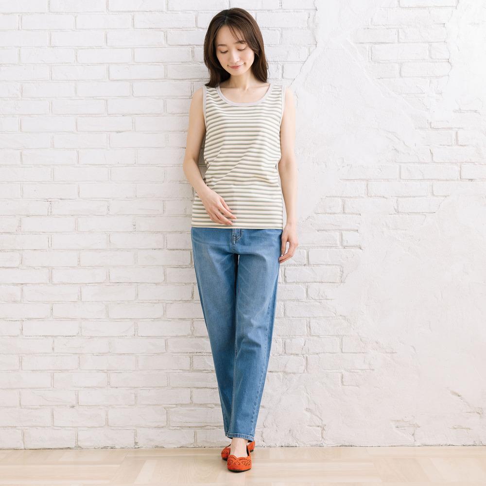 細ピッチのボーダー柄が、カジュアルになりすぎず大人っぽい印象のタンクトップ。