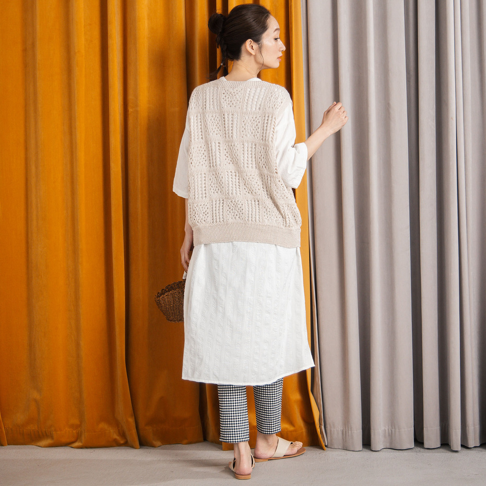 ブロックレース柄のざっくりとした編み地が目を引く、ナチュラルな雰囲気のニットベスト。
