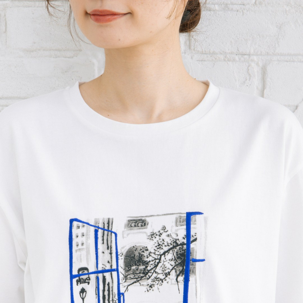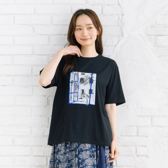 窓辺からの景色を切り取ったようなアートデザインが印象的なTシャツ。